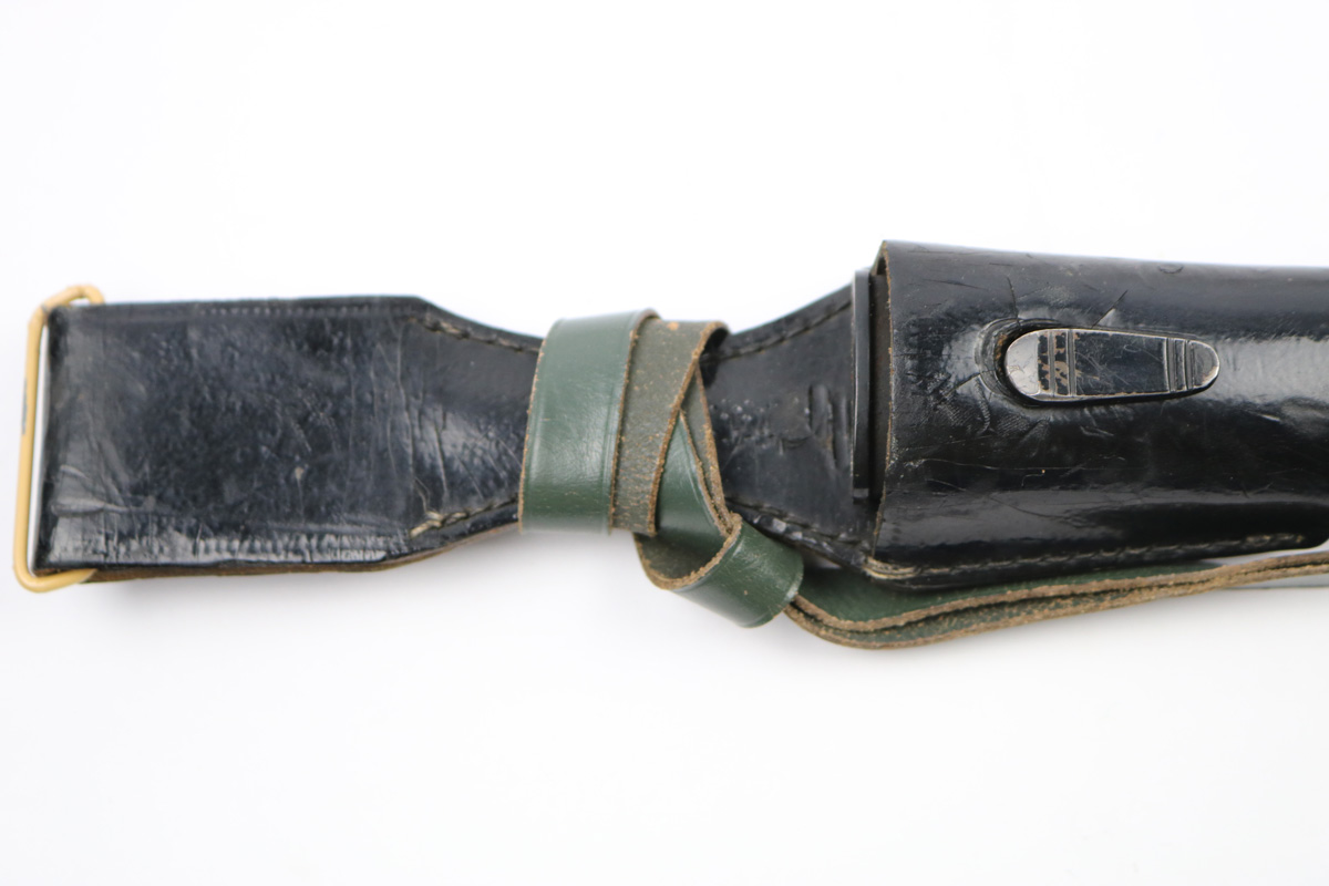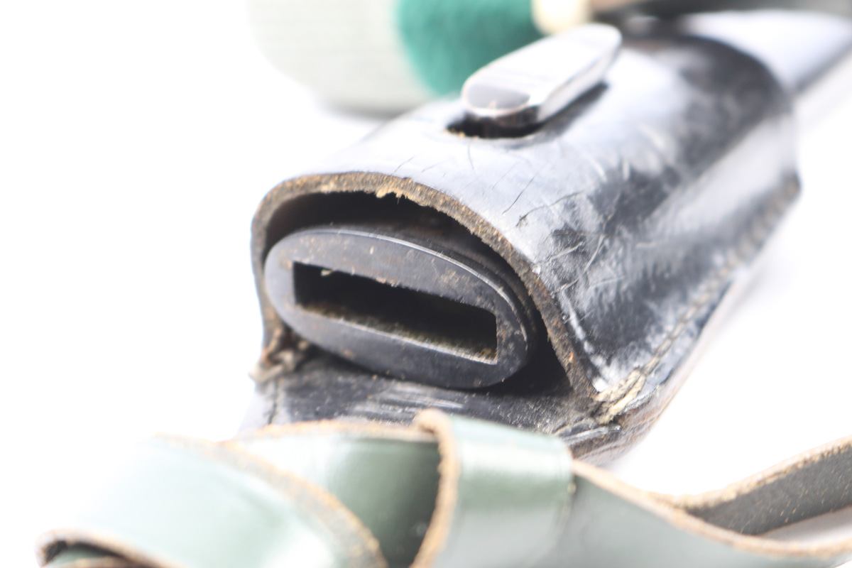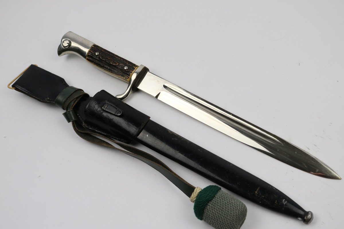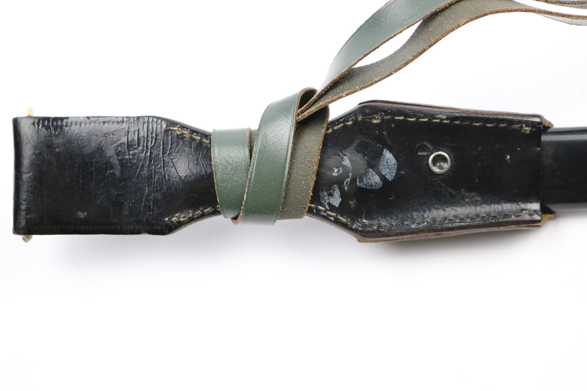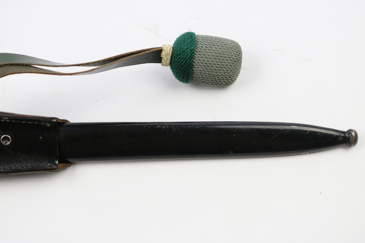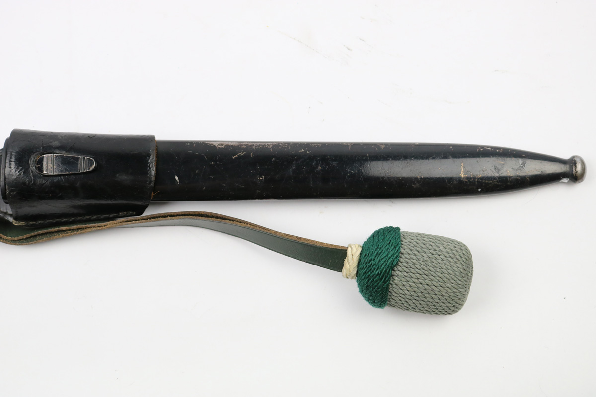 6/13/18 – This is an original K98 Rifle bayonet made by PUMA. This would have been used as a presentation / parade bayonet and comes with the original scabbard, leather frog, and portepee. The portepee is green leather with a green knot, which I believe indicates this was an officer’s bayonet. The blade has some scabbard wear, and light discoloration but overall is excellent. The handle and scabbard have normal aging wear.
