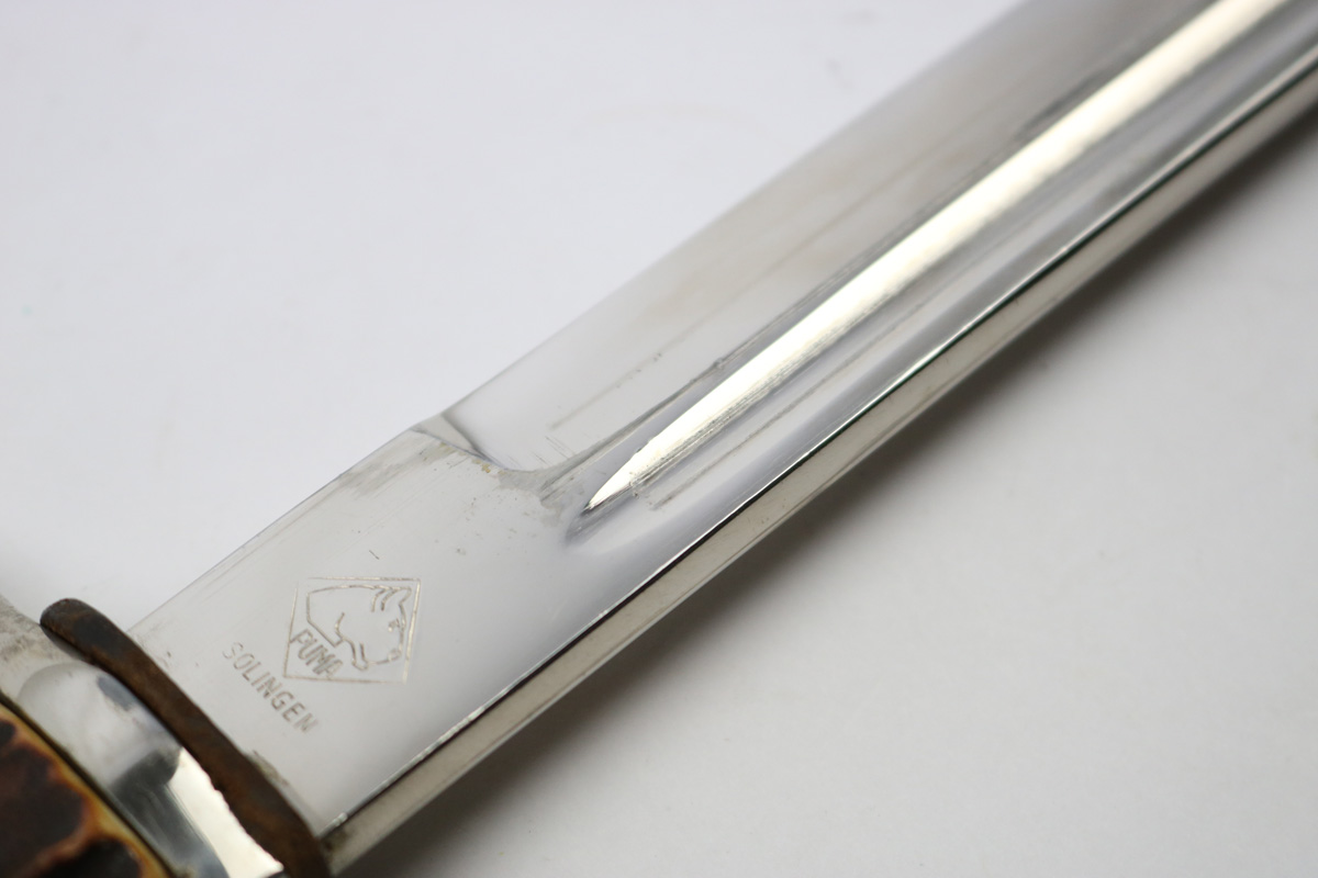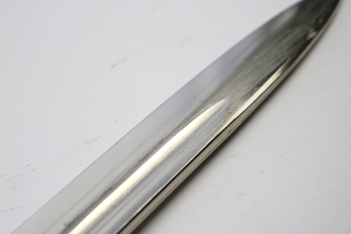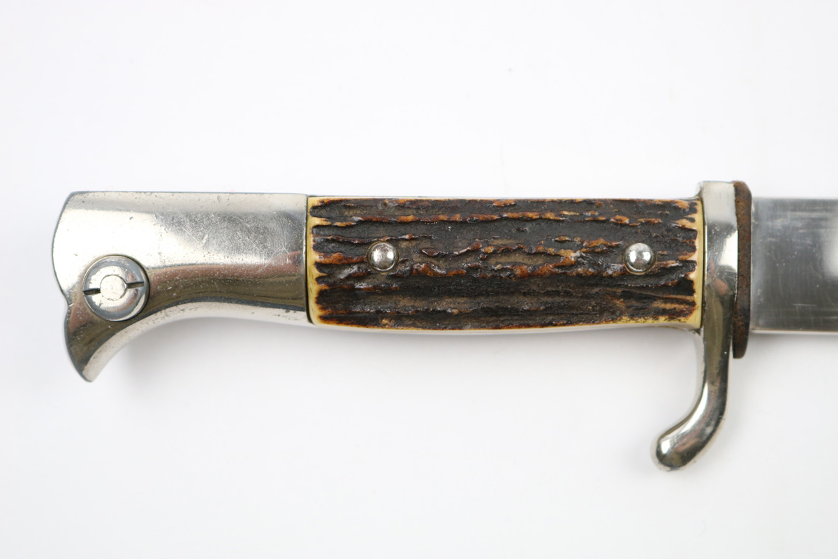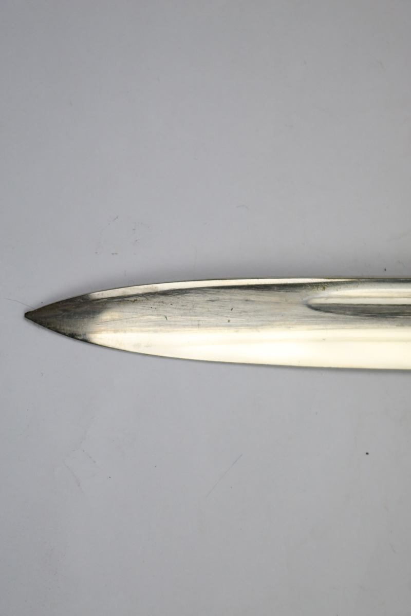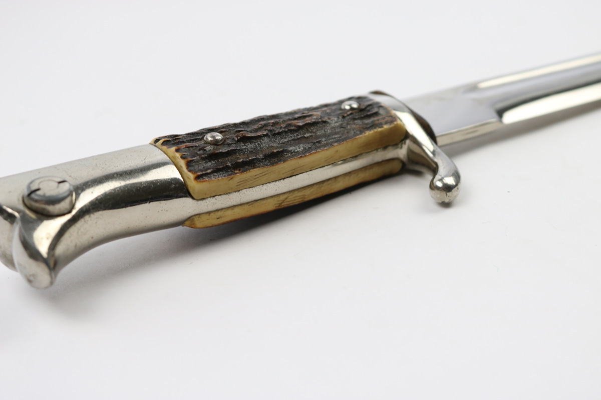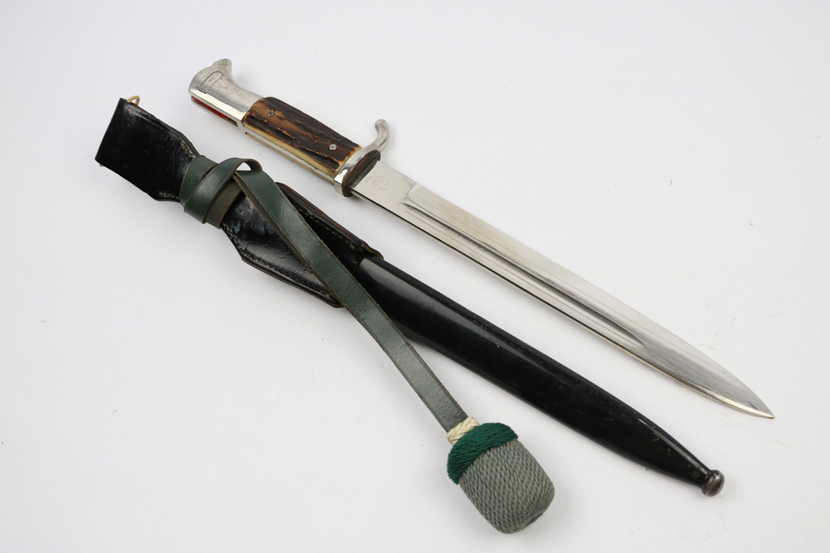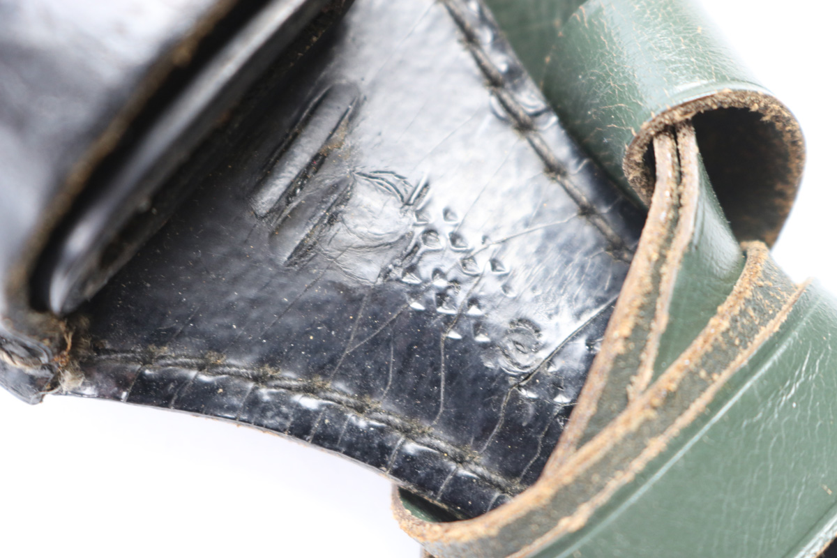 6/13/18 – This is an original K98 Rifle bayonet made by PUMA. This would have been used as a presentation / parade bayonet and comes with the original scabbard, leather frog, and portepee. The portepee is green leather with a green knot, which I believe indicates this was an officer’s bayonet. The blade has some scabbard wear, and light discoloration but overall is excellent. The handle and scabbard have normal aging wear.