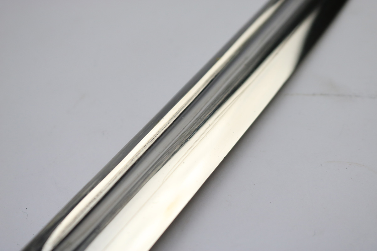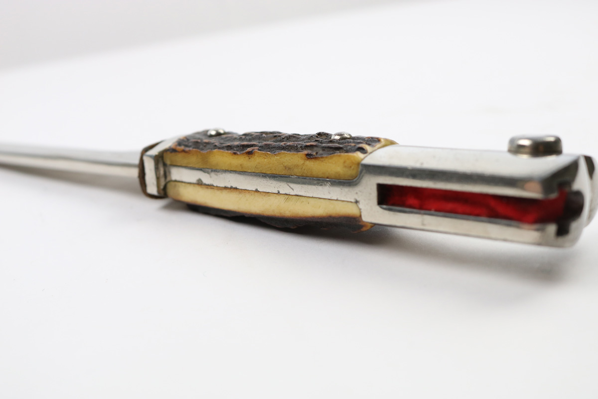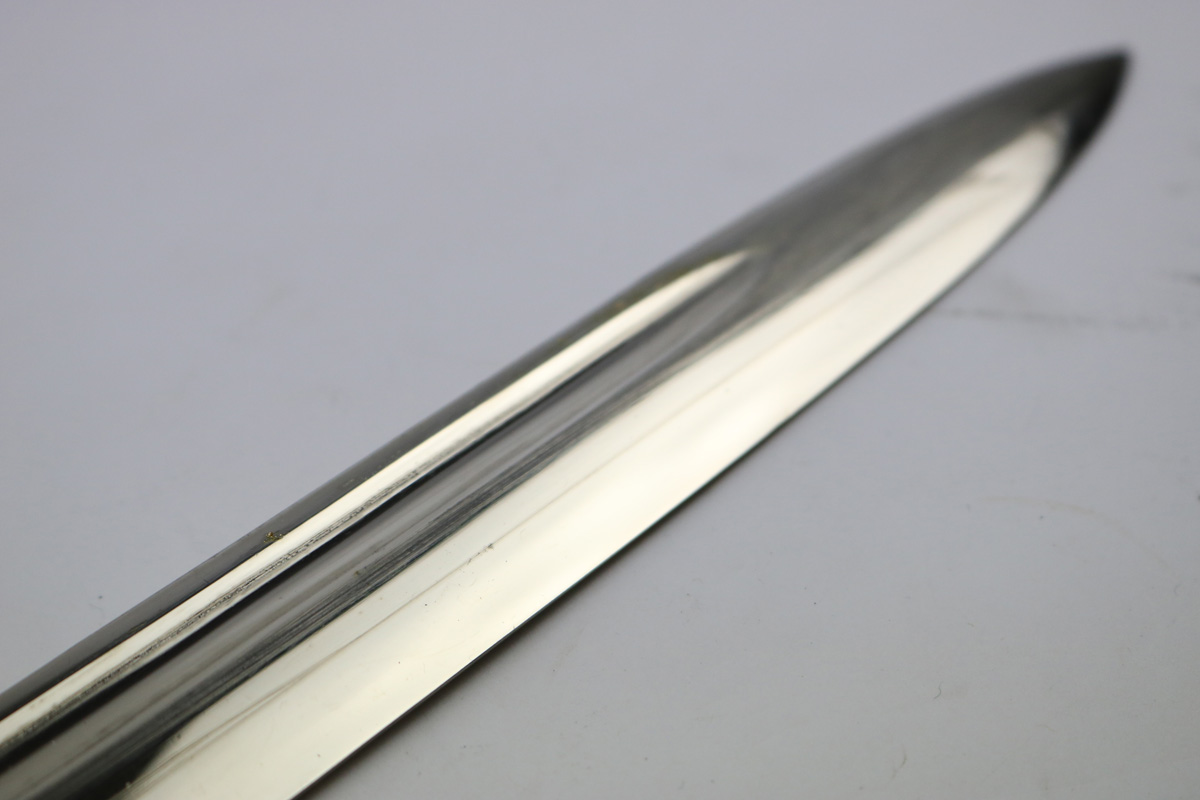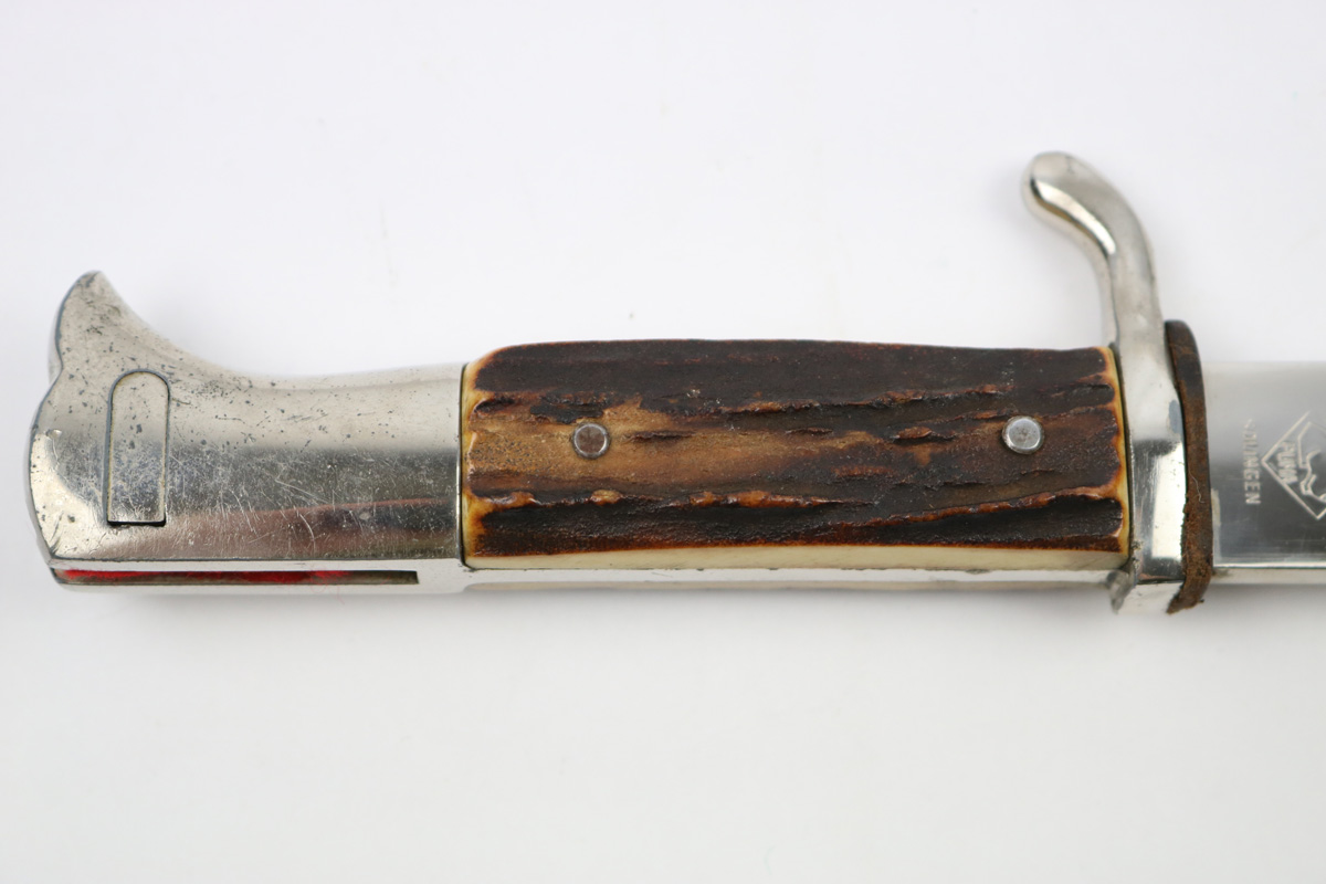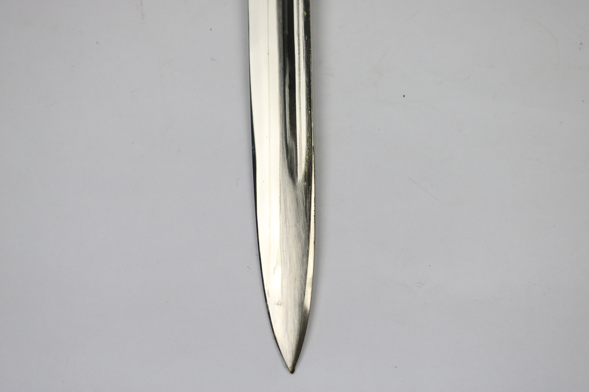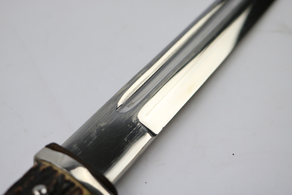 6/13/18 – This is an original K98 Rifle bayonet made by PUMA. This would have been used as a presentation / parade bayonet and comes with the original scabbard, leather frog, and portepee. The portepee is green leather with a green knot, which I believe indicates this was an officer’s bayonet. The blade has some scabbard wear, and light discoloration but overall is excellent. The handle and scabbard have normal aging wear.