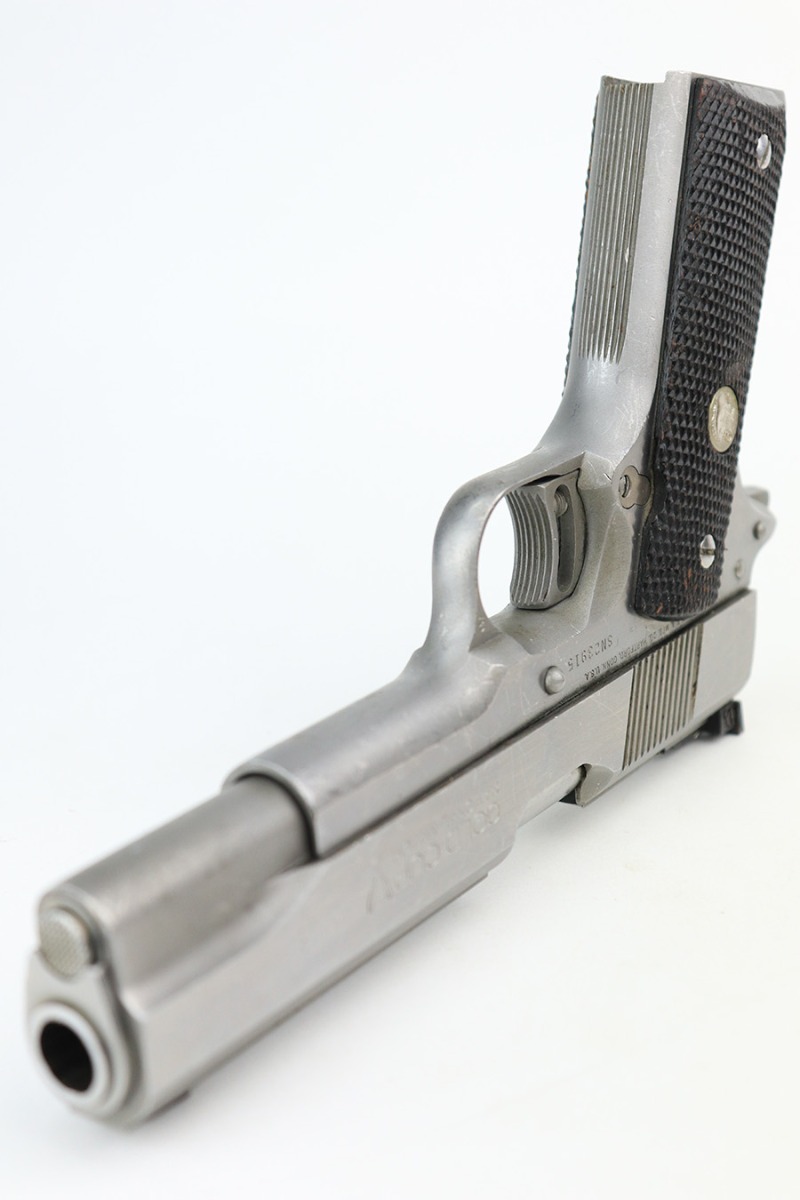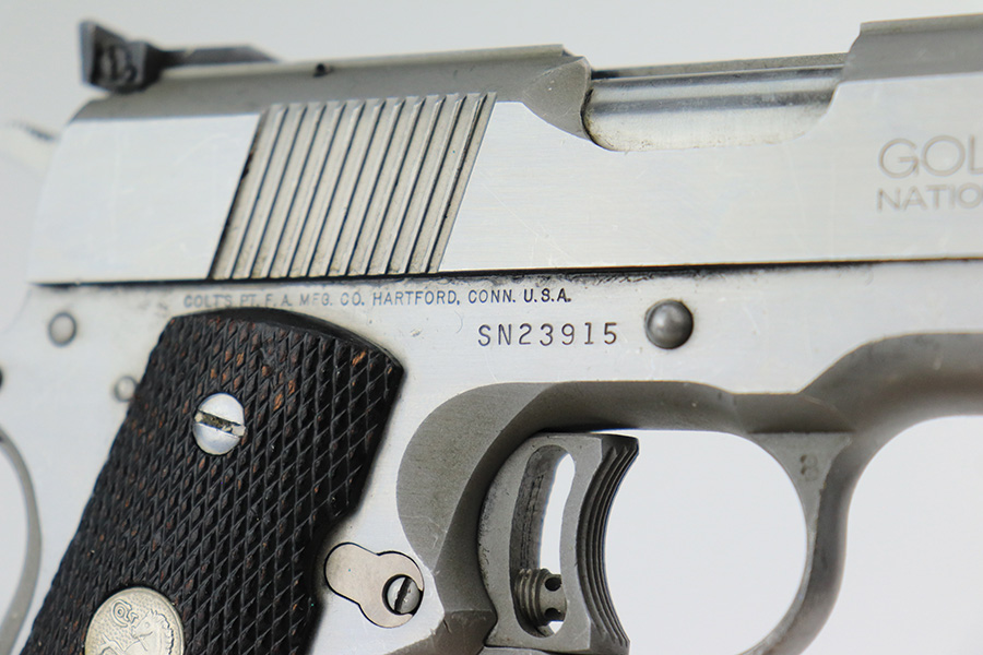 4/26/22 – This is a nice example of a Colt Series 80 Mk IV Gold Cup National Match pistol manufactured in 1989. It is all matching, has a stainless finish, and has a light import mark on the underside of the frame. The condition is nice overall, but there are light scratches and handling marks throughout. Comes with nice dark wood grips with the Colt medallion and one blued magazine. Excellent, shiny bore with strong rifling.