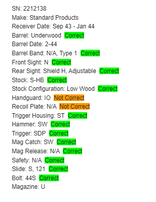 4/5/22 – This is a very nice example of a Standard Products M1 Carbine issued to the US military in 1943-44. A full parts list with the markings are included in the photos. Overall, the gun is in very nice condition. There is very little finish loss, but there are some areas with tiny dots of oxidation along the barrel. Some spots of oxidation on the bolt. The stock is excellent, but it looks like there was a very thin layer of lacquer applied. The condition of the handguard is a little rough and does not match the stock – there are noticeable dings throughout. Comes with a period-correct sling and magazine. No import marks. The bore has decent rifling, but there is spotty oxidation throughout.