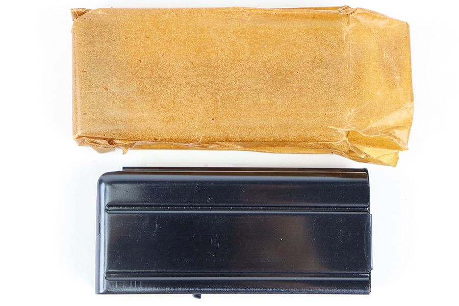 11/2/23 – This is a minty condition M1 Carbine magazine from WW2. Maker marked by Standard Products, and comes with the original wax paper wrapping. Beautiful finish and excellent, functional spring.