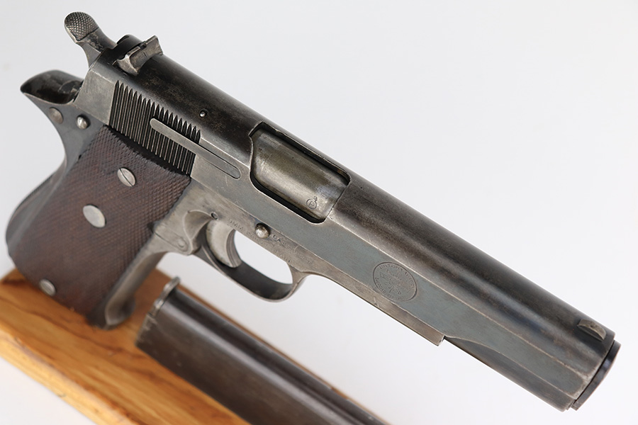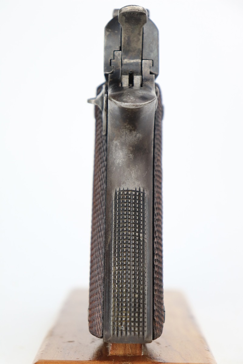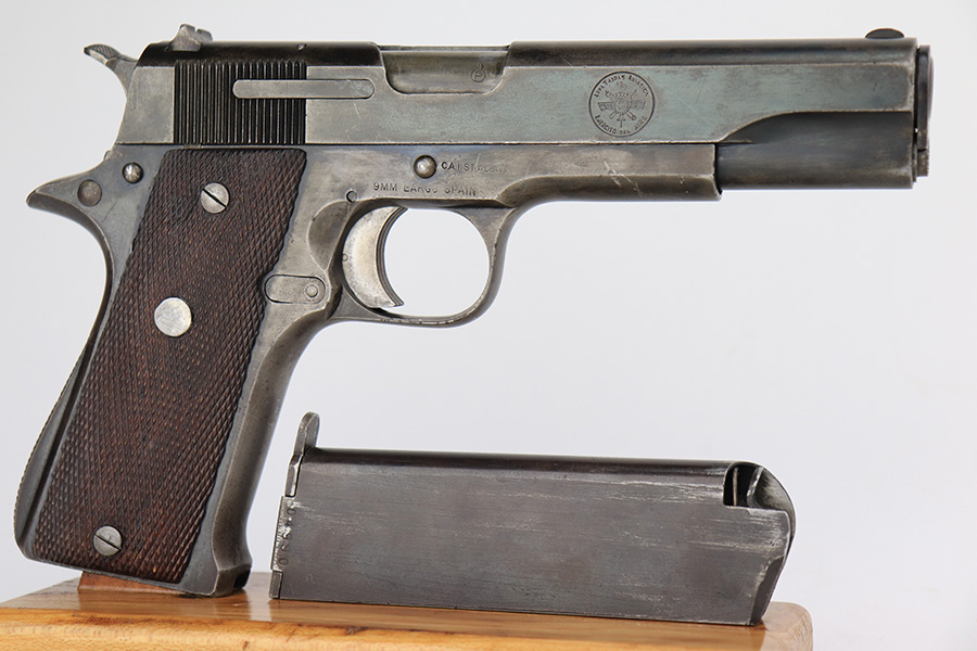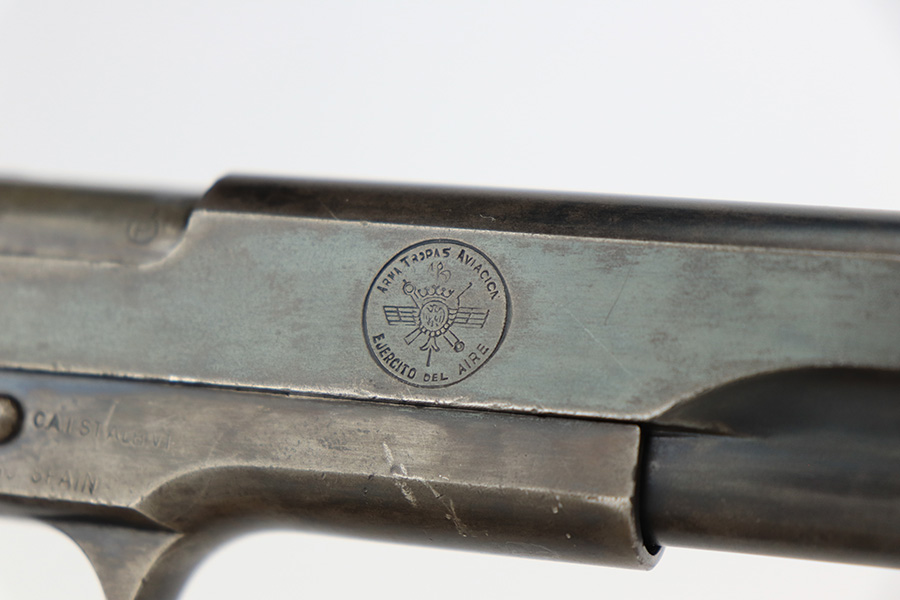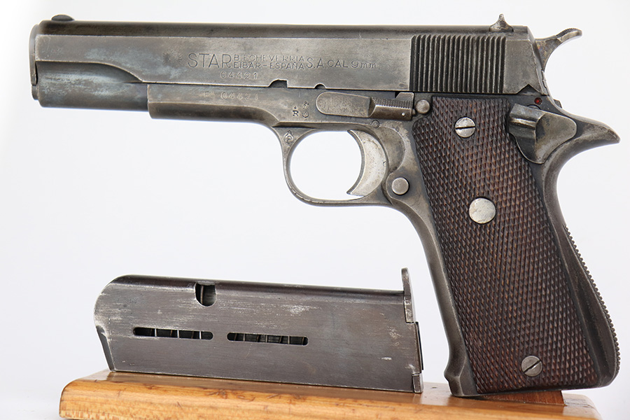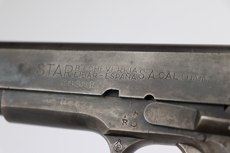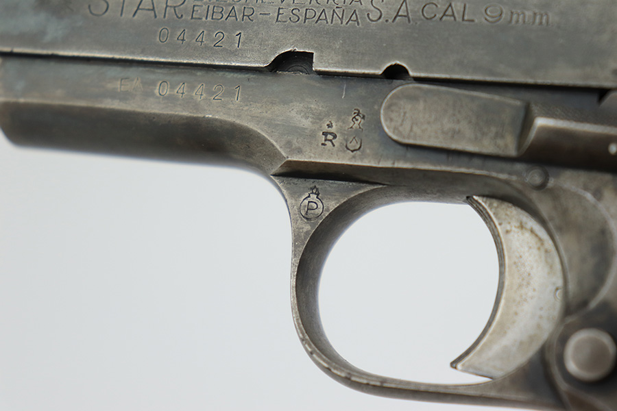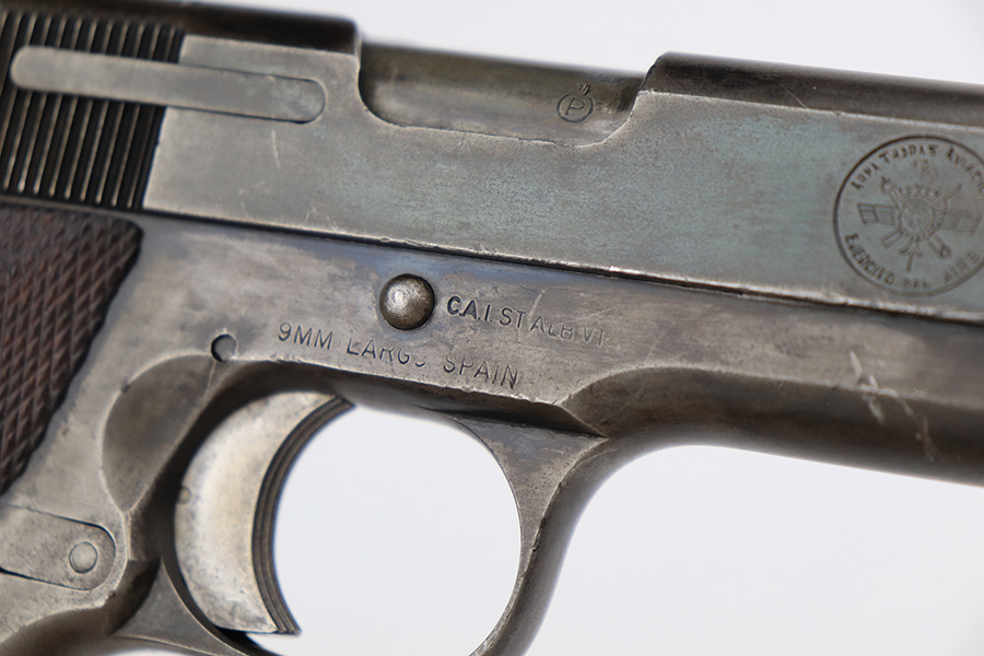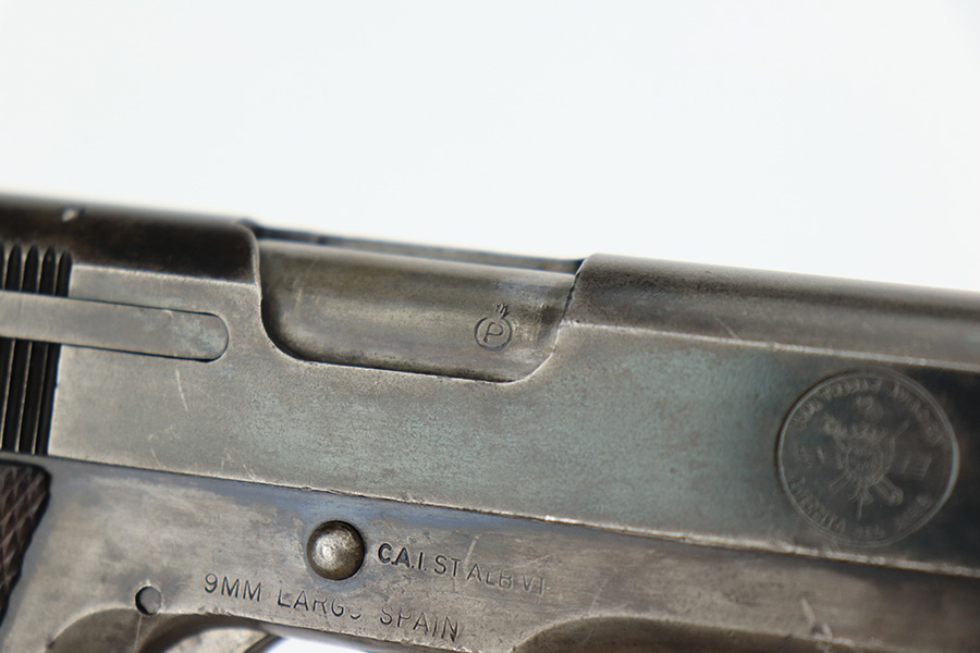 5/8/23 – This is a Star Model A, manufactured in 1947 and issued to the Spanish Air Force, as evidenced by the seal on the right side of the slide. Chambered in 9mm Largo. All matching with an import mark on the right side of the frame. It has the majority of its finish with spotty wear and splotchy discoloration throughout. Fitted with nice wood grips and comes with one proper magazine. Very nice bore with good rifling and very minor fouling in the grooves.