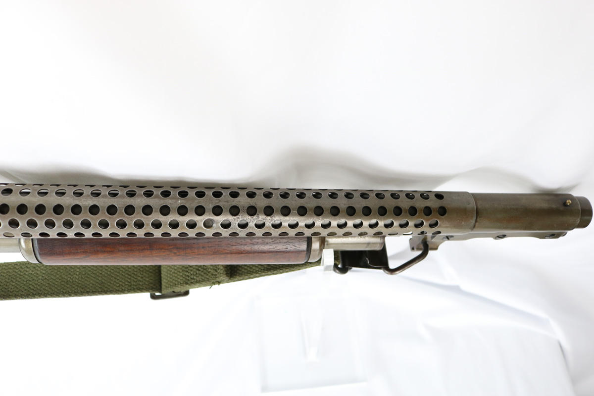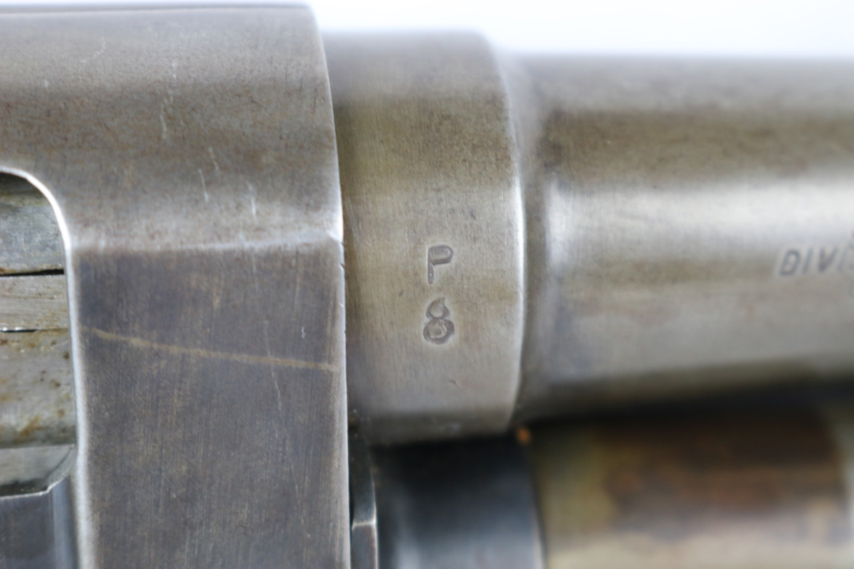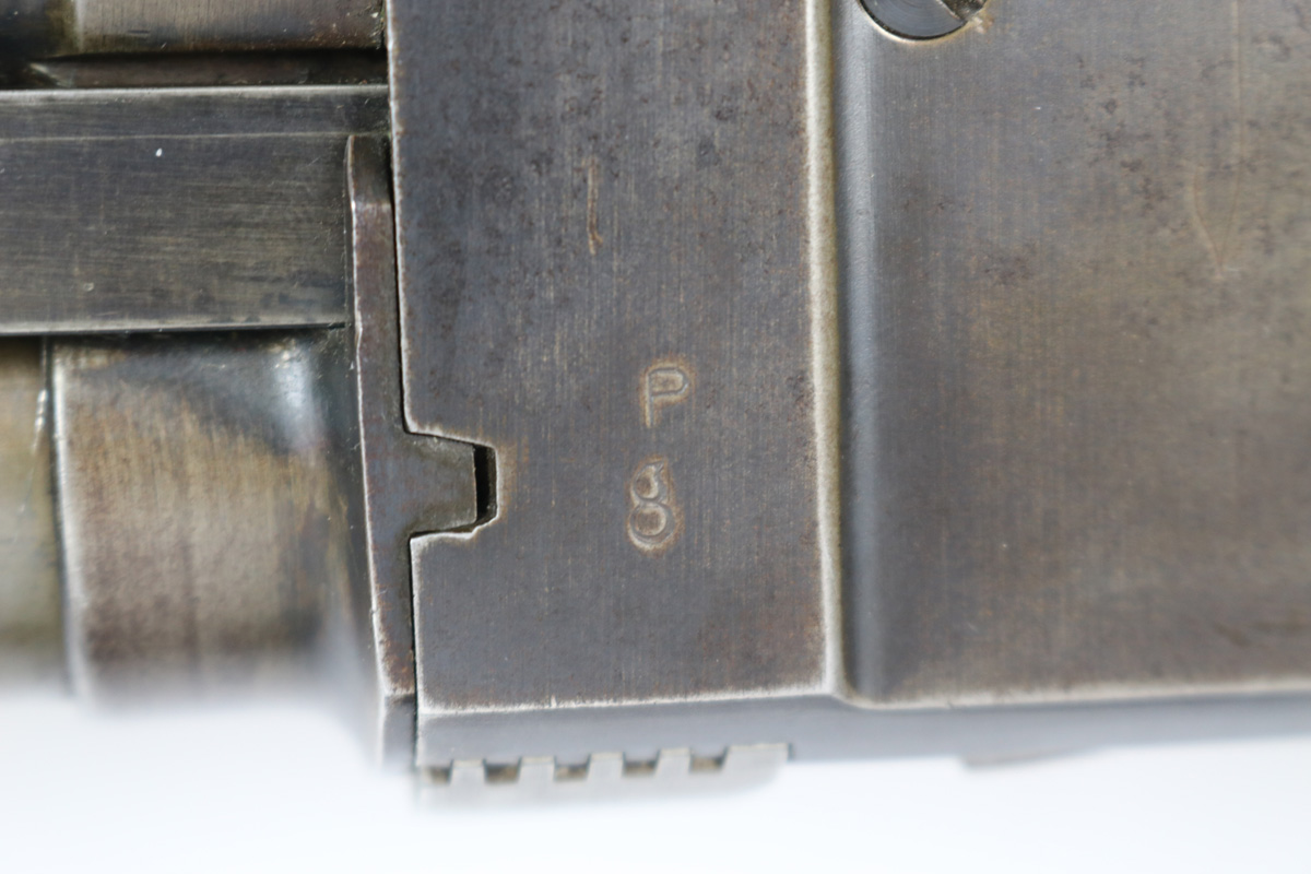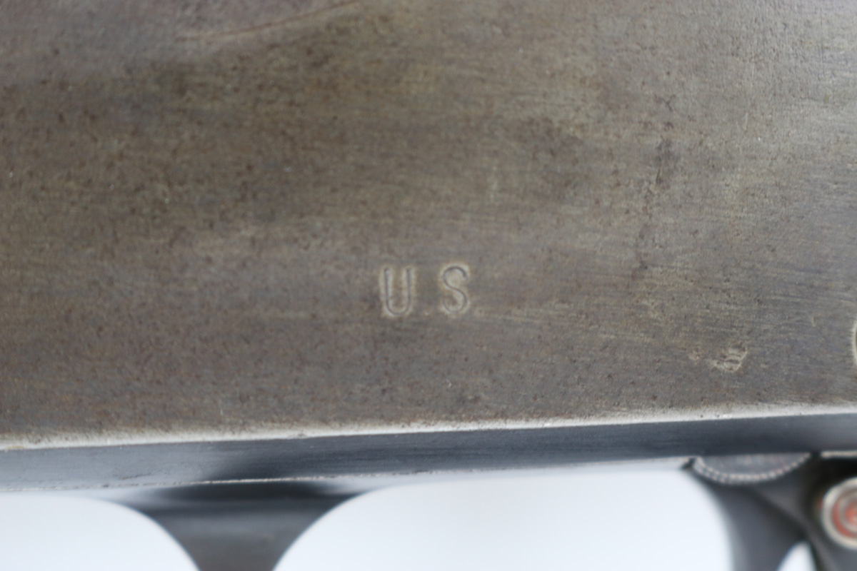 8/15/18 – This is an original WW2 Stevens model 620 trench shotgun made for the US military. The shotgun is serial number 25583 which falls into the proper range for trench shotguns made during WW2. Has the proper heat shield and bayonet lug. The finish on the heat shield and bayonet lug is mostly misisng, leaving the dull grey/green steel color as we see today. There are light hints of the original plumb on the bayonet lug and heat shield though (very small amounts). The bore and tube are similar in that they have this dull green/grey finish and patina throughout. The receiver has the most bluing in tact, but generally the bluing is gone on the metal of this shotgun. Makes sense as these were heavily used during WW2. Properly “P” proofed stamped on the barrel and receiver with a flaming bomb underneath each. The stock appears unaltered and unmarked. Guaranteed all original and fully functional.