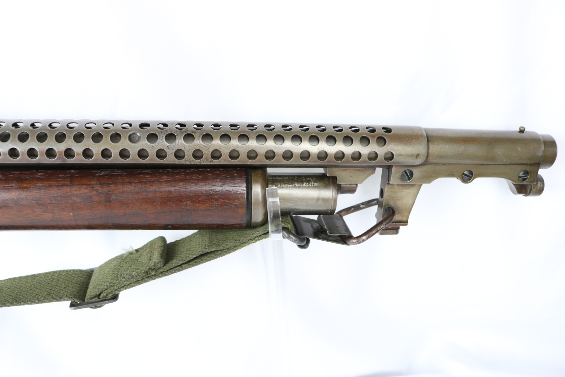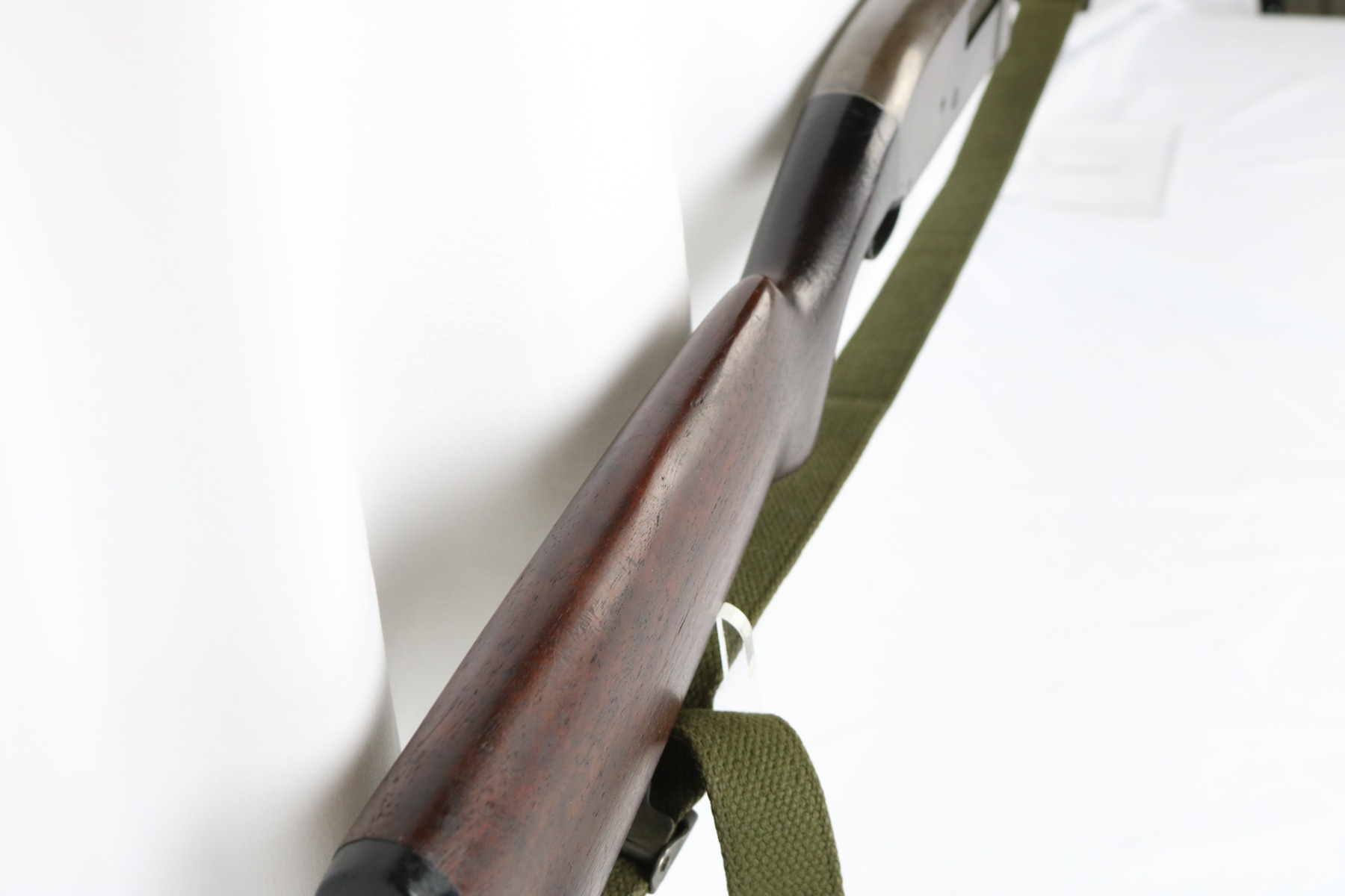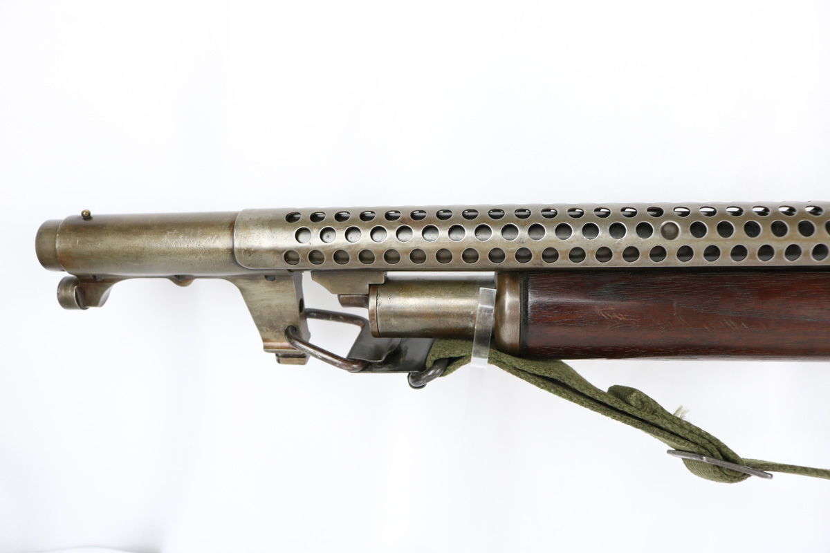 8/15/18 – This is an original WW2 Stevens model 620 trench shotgun made for the US military. The shotgun is serial number 25583 which falls into the proper range for trench shotguns made during WW2. Has the proper heat shield and bayonet lug. The finish on the heat shield and bayonet lug is mostly misisng, leaving the dull grey/green steel color as we see today. There are light hints of the original plumb on the bayonet lug and heat shield though (very small amounts). The bore and tube are similar in that they have this dull green/grey finish and patina throughout. The receiver has the most bluing in tact, but generally the bluing is gone on the metal of this shotgun. Makes sense as these were heavily used during WW2. Properly “P” proofed stamped on the barrel and receiver with a flaming bomb underneath each. The stock appears unaltered and unmarked. Guaranteed all original and fully functional.