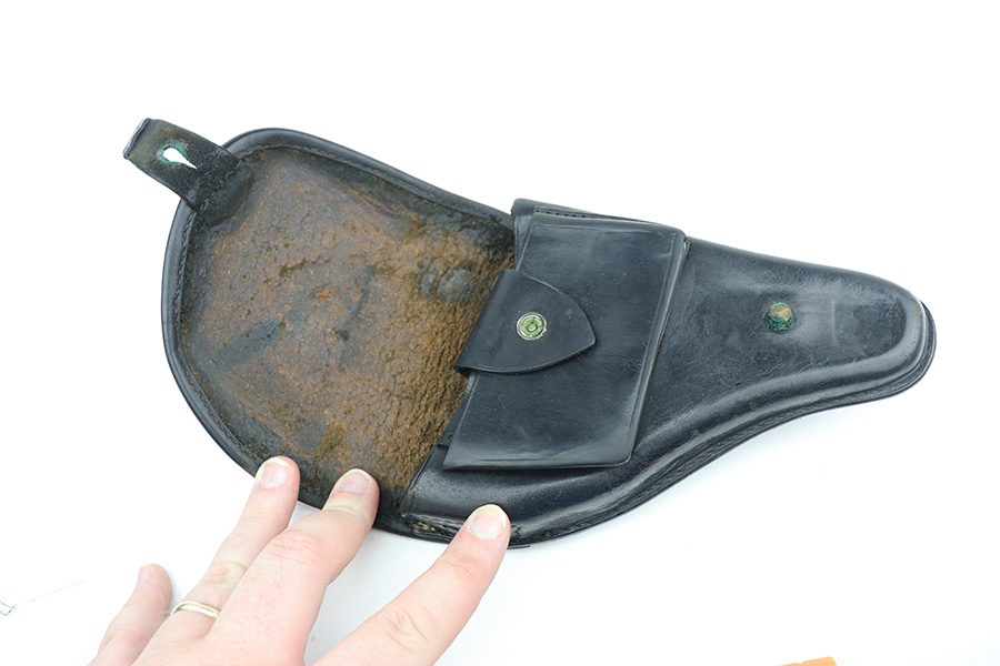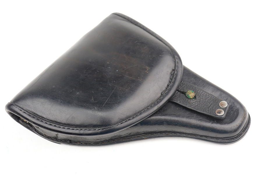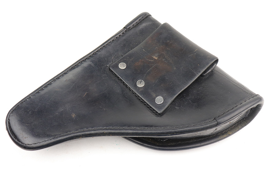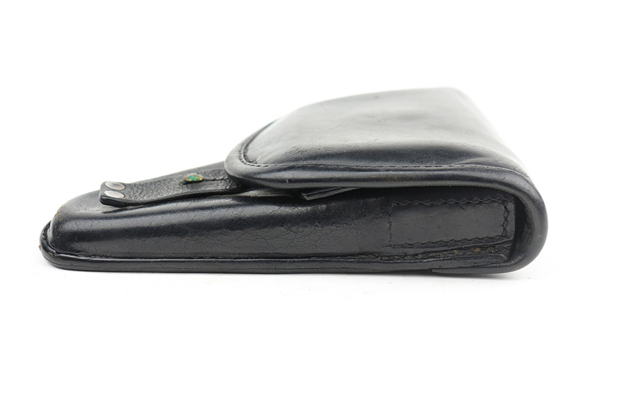 9/24/21 – This holster is for a Steyr 1908 or 1934. The holster was dyed black, most likely during the war. The holster is unmarked and riveted. The stitching is in great condition as is the leather, showing only minor wear and one scratch that original color can be seen through.