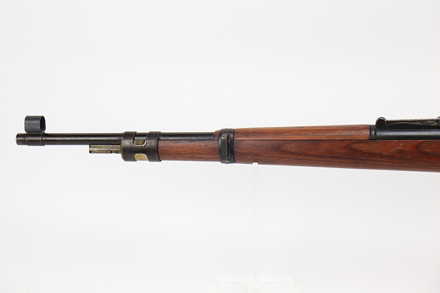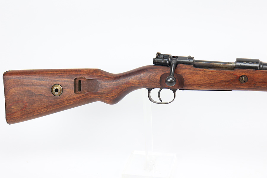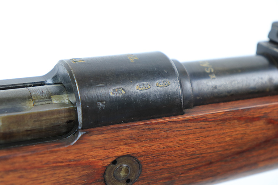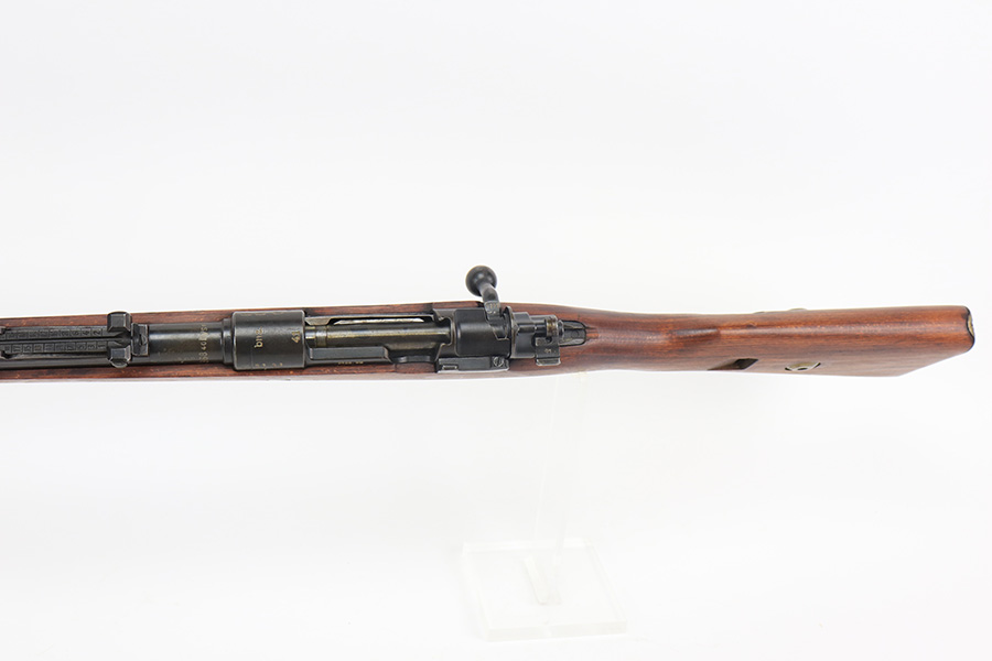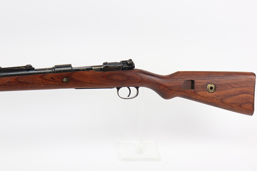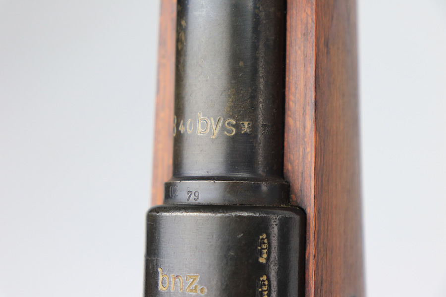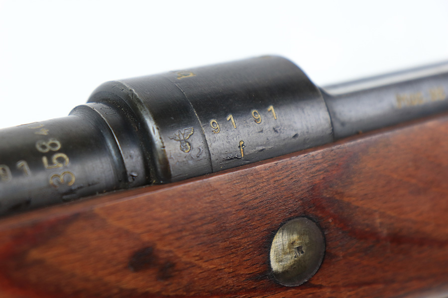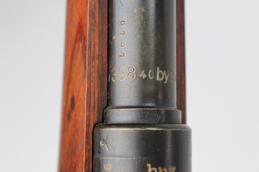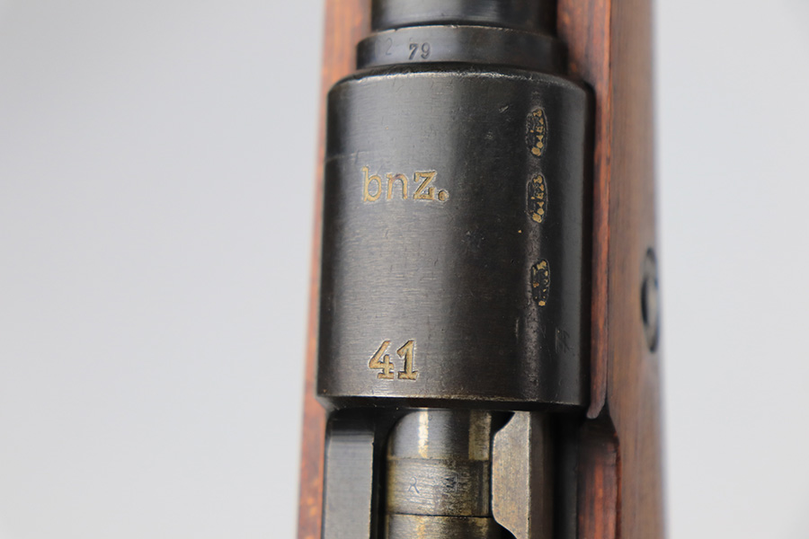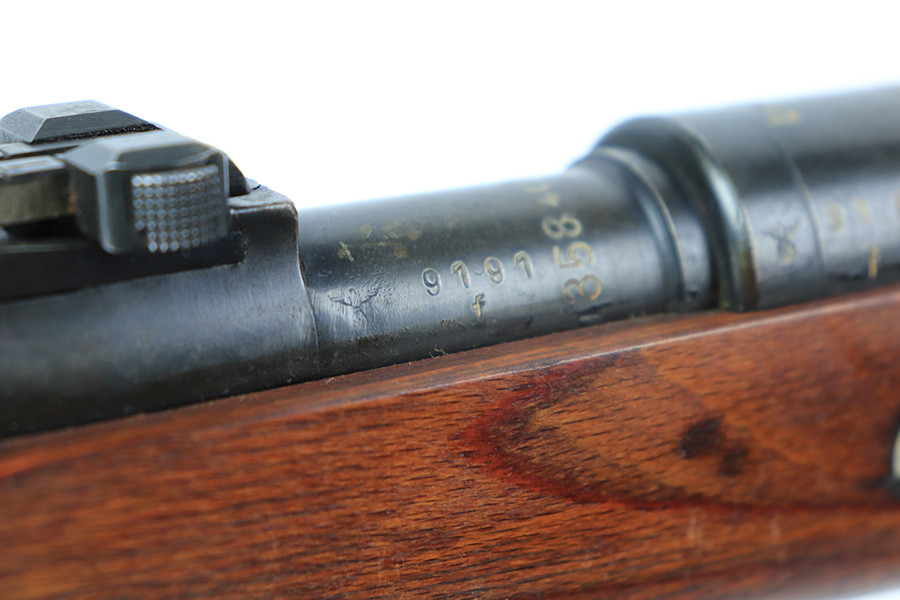 3/31/22 – This is a very nice example of a “BNZ 41” Steyr K98 rifle issued to the Nazi military in 1941. The gun is completely matching except for the stock and the handguard which are numbered on the inside. Even the front screw on the trigger assembly is numbered and matching – the rear screw is un-numbered. The butt plate is un-numbered. The floor plate is matching, but the numbering is very faint. No visible proofs or numbers on the stock externally. Proper Nazi military acceptance proofs on the metal parts throughout. Overall, the gun has retained the majority of its finish. There are areas of yellowish discoloration (looks like a thin layer of wood lacquer) on the butt plate, floor plate / trigger assembly, and barrel bands. There is spotty wear on the barrel just in front of the receiver. Splotchy discoloration and spotty oxidation along the rest of the barrel and on the barrel bands. Significant finish loss on the floor plate / trigger assembly. Excellent stock that was likely sanded. Very nice bore with good rifling.