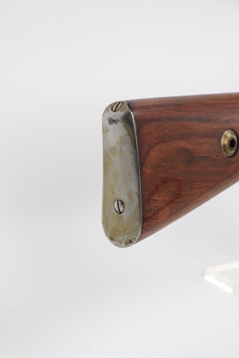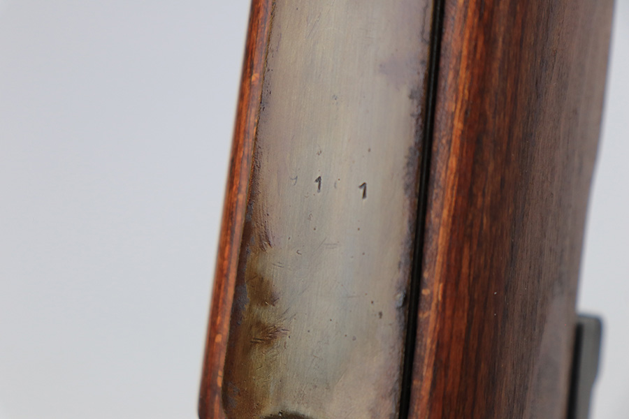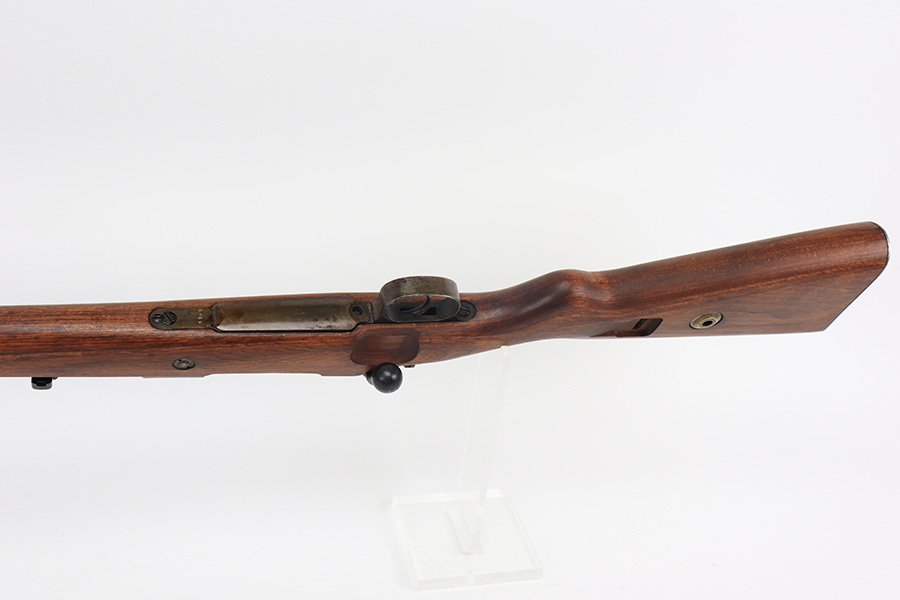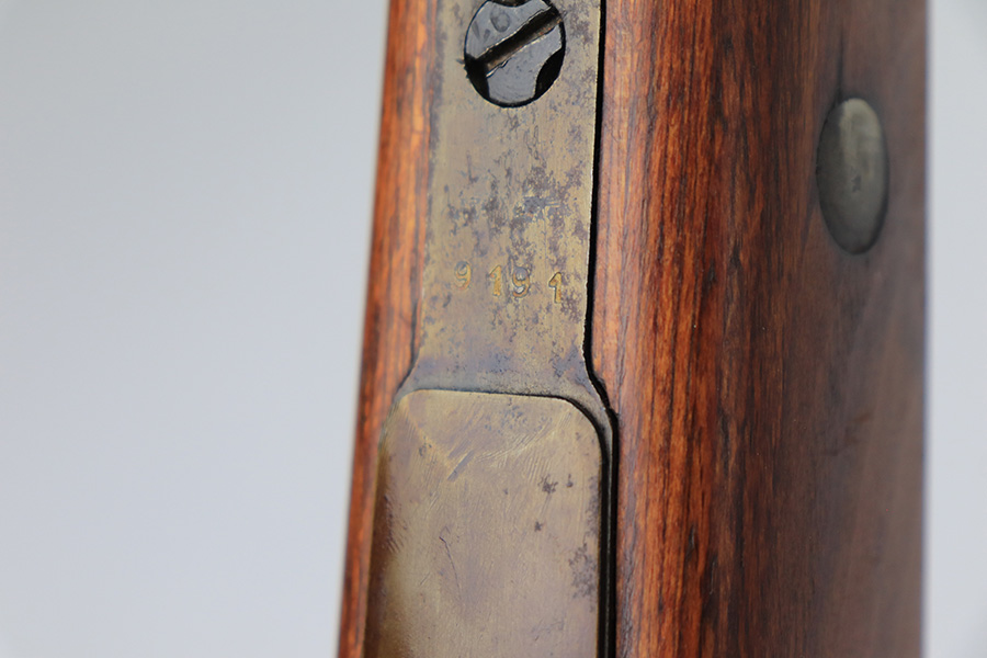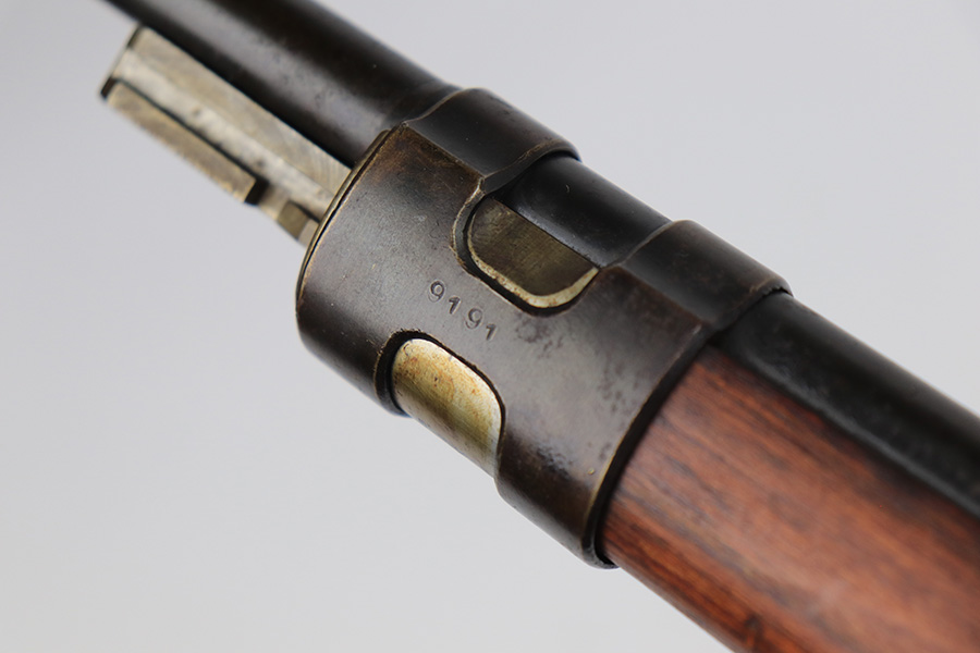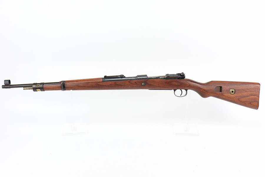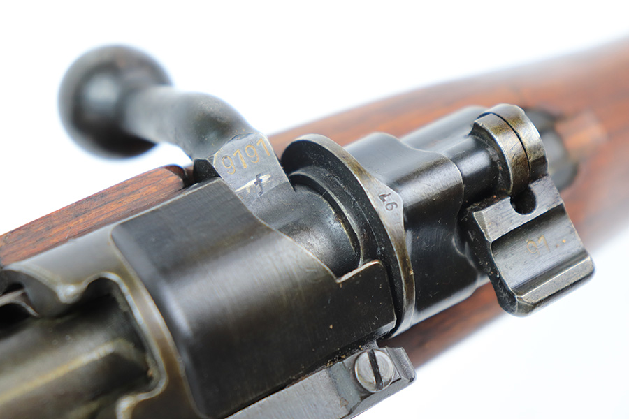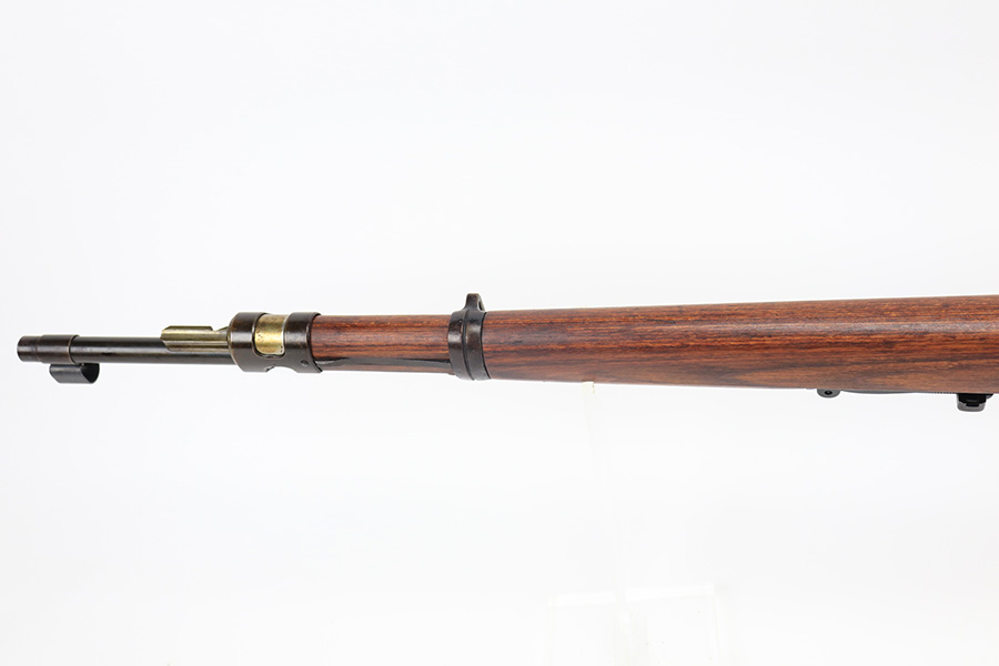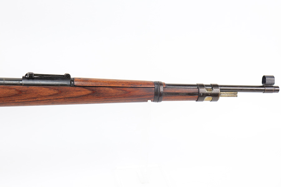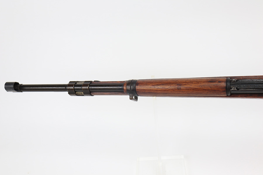 3/31/22 – This is a very nice example of a “BNZ 41” Steyr K98 rifle issued to the Nazi military in 1941. The gun is completely matching except for the stock and the handguard which are numbered on the inside. Even the front screw on the trigger assembly is numbered and matching – the rear screw is un-numbered. The butt plate is un-numbered. The floor plate is matching, but the numbering is very faint. No visible proofs or numbers on the stock externally. Proper Nazi military acceptance proofs on the metal parts throughout. Overall, the gun has retained the majority of its finish. There are areas of yellowish discoloration (looks like a thin layer of wood lacquer) on the butt plate, floor plate / trigger assembly, and barrel bands. There is spotty wear on the barrel just in front of the receiver. Splotchy discoloration and spotty oxidation along the rest of the barrel and on the barrel bands. Significant finish loss on the floor plate / trigger assembly. Excellent stock that was likely sanded. Very nice bore with good rifling.