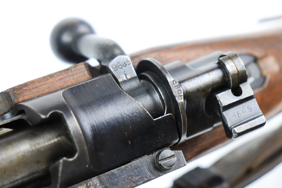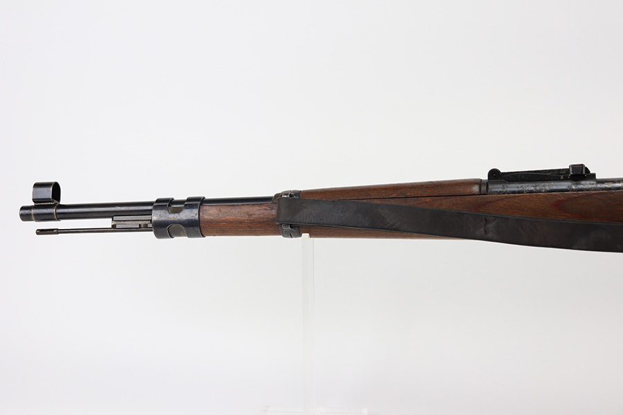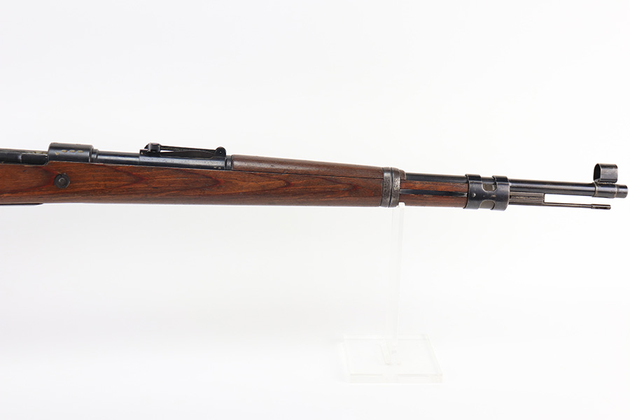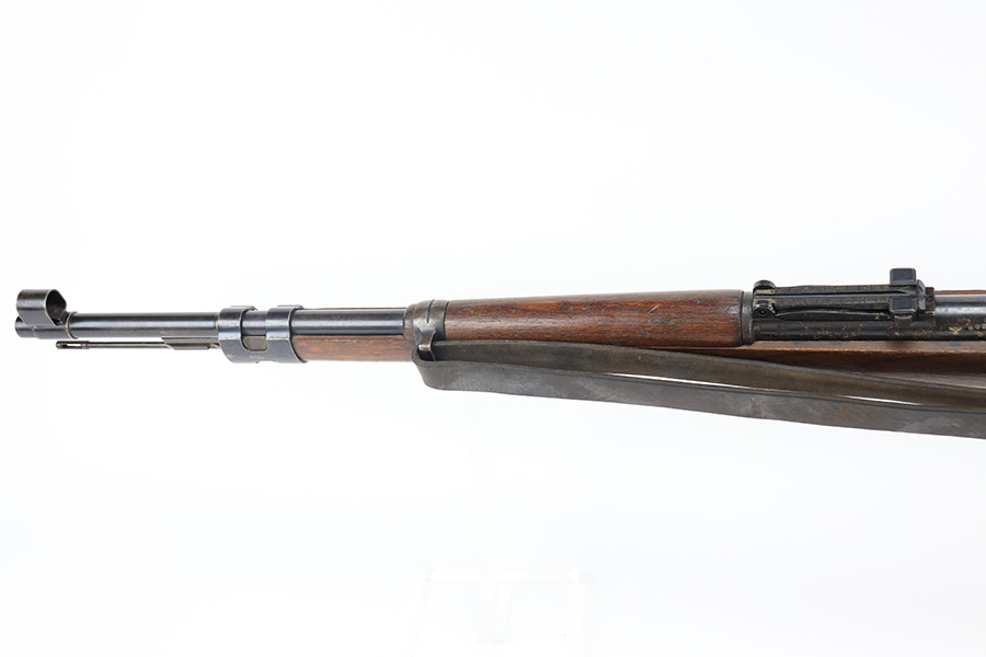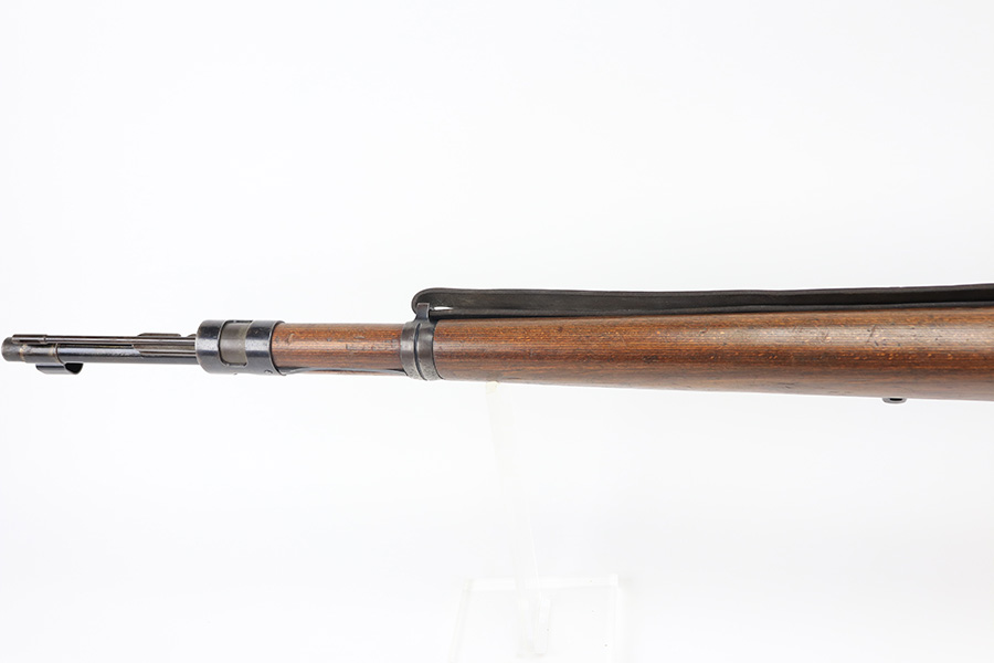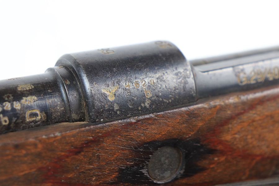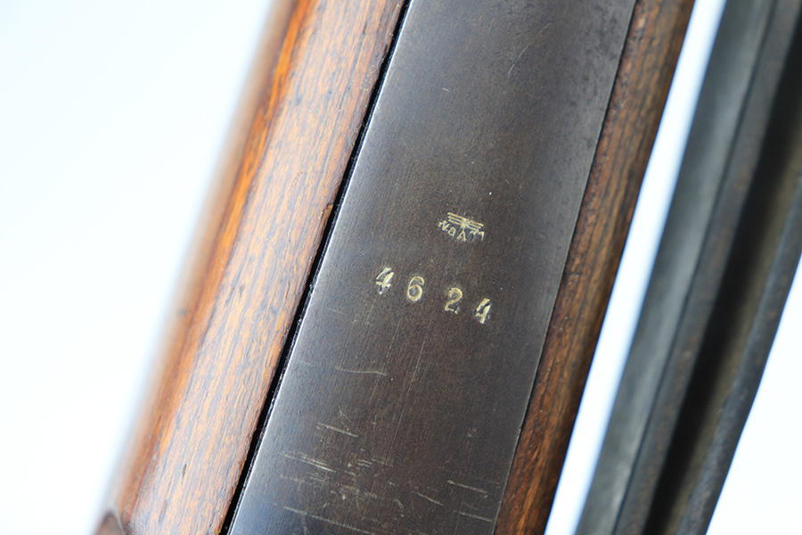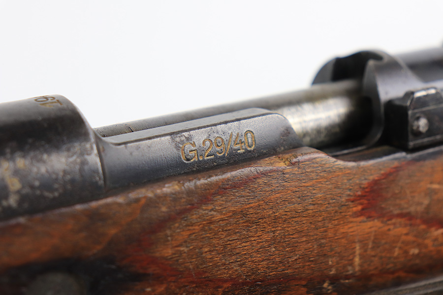 2/1/22 – This is a very rare 1940 Steyr G.29/40 that was issued to the German Navy, as indicated by the Eagle/M proof on stock. The G29/40 was a Kar.98k style rifle base around the Polish wz.29 Modell 98 rifle, and the rifles had many similarities and many of the parts could be used for production of Kar.98k rifles. They were assembled over a three year period, with about 12,500 made in 1940. The majority (about 38,000) were made in 1941 and the last 4,000 not until 1942. Most were delivered to the Kriegsmarine (German Navy), although many early rifles were delivered to the German Army. Trends research shows that almost all G29/40’s after the “a” block went to the Navy, and only about half of the earlier production went to the German Army. A total of 54,500 G29/40’s were made during the war, but many parts (components) were delivered to the Kriegsmarine and subsequently built into rifles by the Navy, these are rare in original condition. This one is completely matching (including the stock, butt plate, follower, and all parts of the rear sight), but the bolt is mismatched. It comes with an original cleaning rod and leather sling. The gun has retained most of its finish, but there is noticeable spotty discoloration and tiny pits along the whole left side of the receiver. Generally, there is also minor wear around the muzzle and around the high edges. There is some light brown patina, a few small dings, and a few light handling marks on the floor plate/trigger group. The stock is very nice with only minor dings, dents, and scratches throughout. The bore is shiny with good rifling and very minor pin-pricking in the grooves.