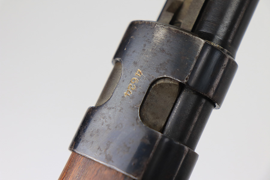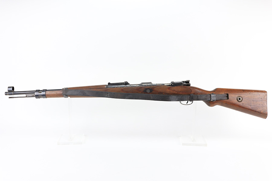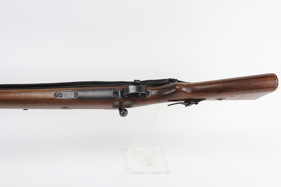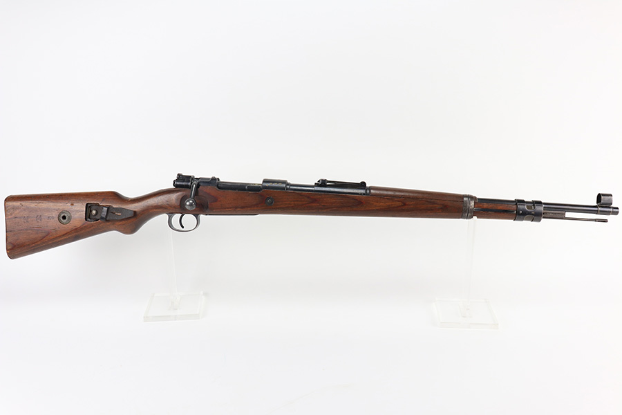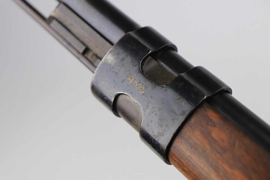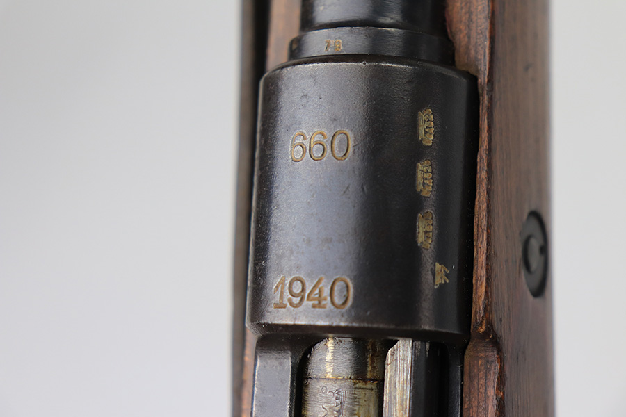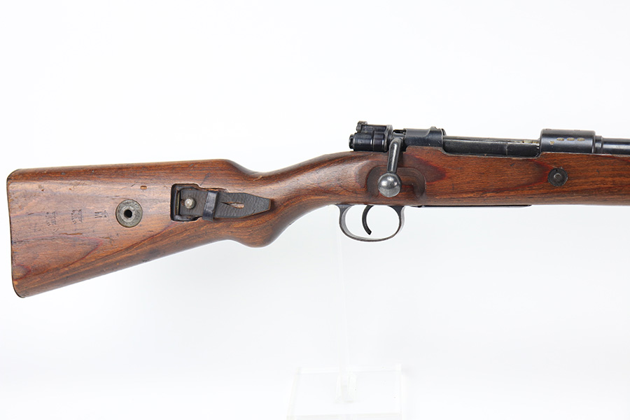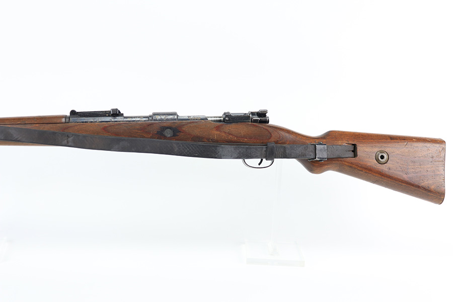2/1/22 – This is a very rare 1940 Steyr G.29/40 that was issued to the German Navy, as indicated by the Eagle/M proof on stock. The G29/40 was a Kar.98k style rifle base around the Polish wz.29 Modell 98 rifle, and the rifles had many similarities and many of the parts could be used for production of Kar.98k rifles. They were assembled over a three year period, with about 12,500 made in 1940. The majority (about 38,000) were made in 1941 and the last 4,000 not until 1942. Most were delivered to the Kriegsmarine (German Navy), although many early rifles were delivered to the German Army. Trends research shows that almost all G29/40’s after the “a” block went to the Navy, and only about half of the earlier production went to the German Army. A total of 54,500 G29/40’s were made during the war, but many parts (components) were delivered to the Kriegsmarine and subsequently built into rifles by the Navy, these are rare in original condition. This one is completely matching (including the stock, butt plate, follower, and all parts of the rear sight), but the bolt is mismatched. It comes with an original cleaning rod and leather sling. The gun has retained most of its finish, but there is noticeable spotty discoloration and tiny pits along the whole left side of the receiver. Generally, there is also minor wear around the muzzle and around the high edges. There is some light brown patina, a few small dings, and a few light handling marks on the floor plate/trigger group. The stock is very nice with only minor dings, dents, and scratches throughout. The bore is shiny with good rifling and very minor pin-pricking in the grooves.
