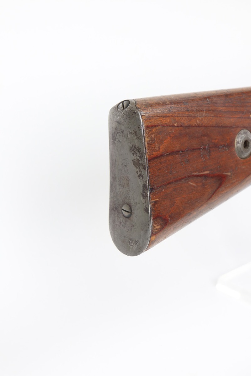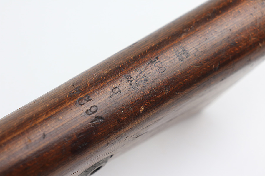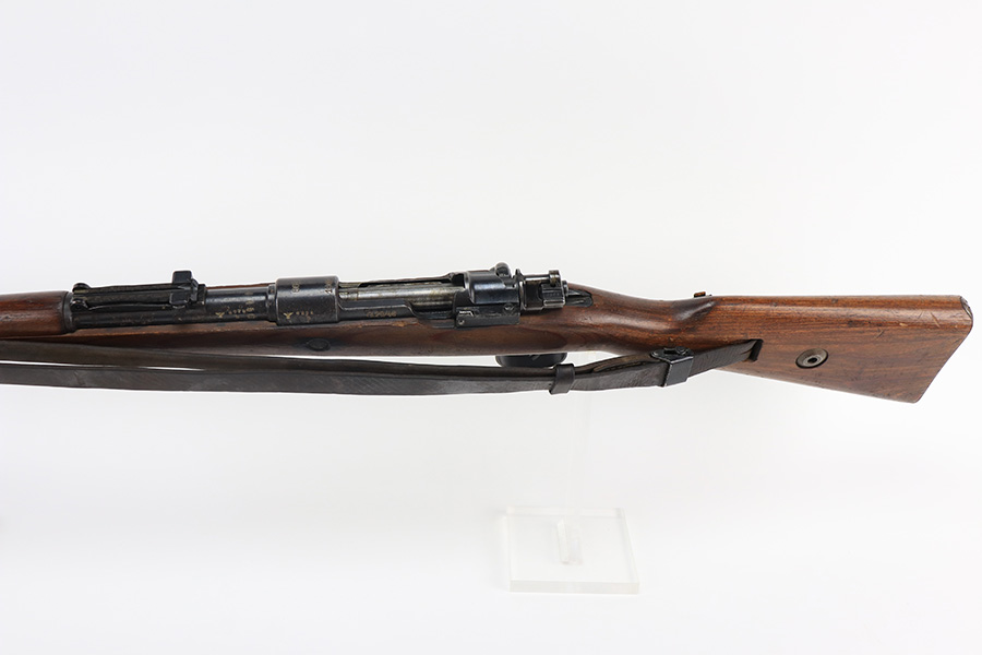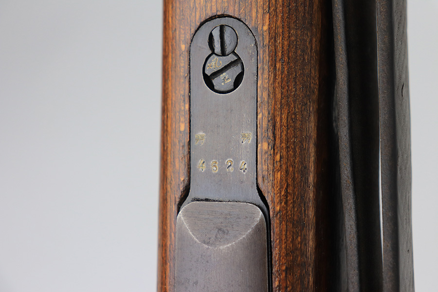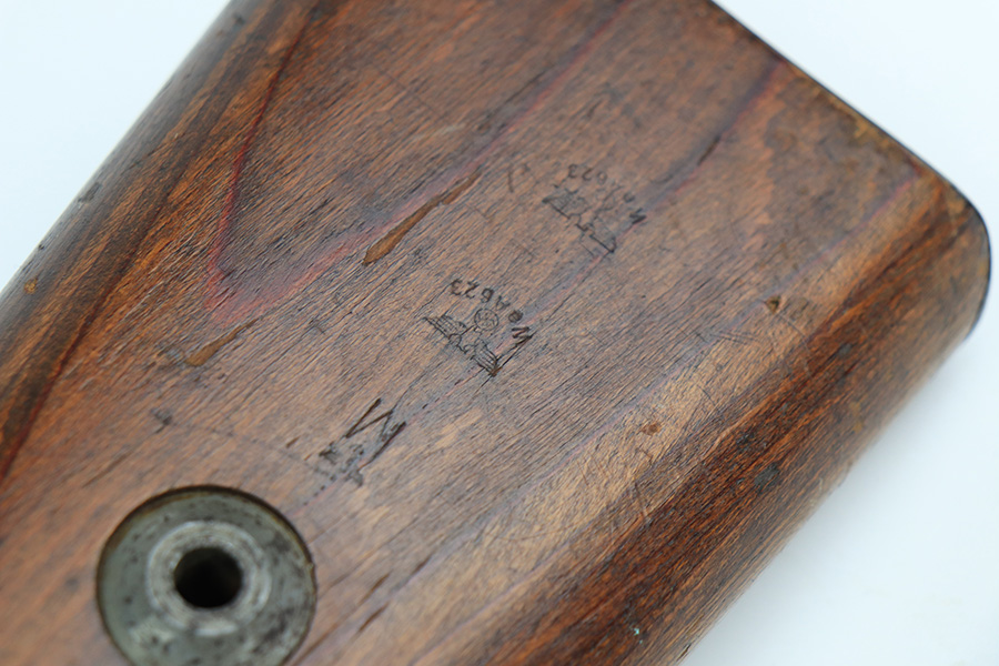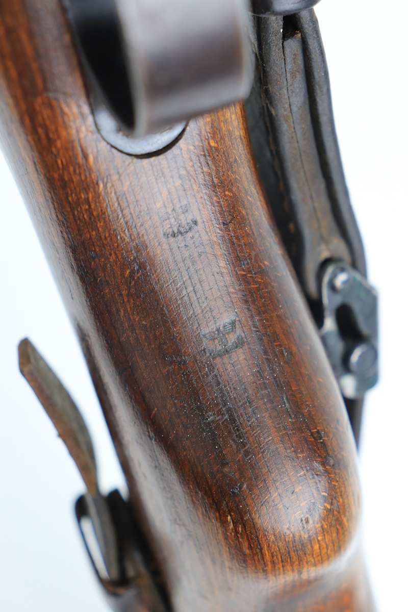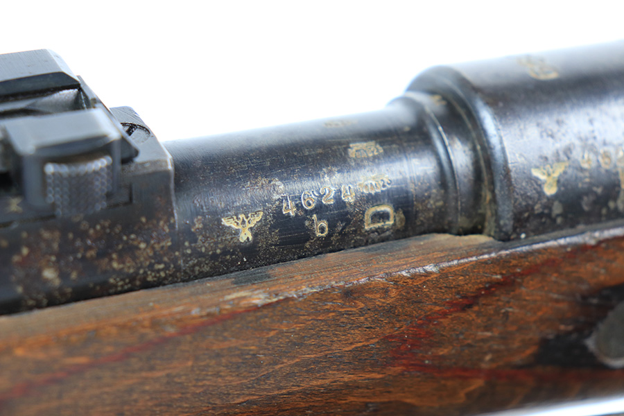 2/1/22 – This is a very rare 1940 Steyr G.29/40 that was issued to the German Navy, as indicated by the Eagle/M proof on stock. The G29/40 was a Kar.98k style rifle base around the Polish wz.29 Modell 98 rifle, and the rifles had many similarities and many of the parts could be used for production of Kar.98k rifles. They were assembled over a three year period, with about 12,500 made in 1940. The majority (about 38,000) were made in 1941 and the last 4,000 not until 1942. Most were delivered to the Kriegsmarine (German Navy), although many early rifles were delivered to the German Army. Trends research shows that almost all G29/40’s after the “a” block went to the Navy, and only about half of the earlier production went to the German Army. A total of 54,500 G29/40’s were made during the war, but many parts (components) were delivered to the Kriegsmarine and subsequently built into rifles by the Navy, these are rare in original condition. This one is completely matching (including the stock, butt plate, follower, and all parts of the rear sight), but the bolt is mismatched. It comes with an original cleaning rod and leather sling. The gun has retained most of its finish, but there is noticeable spotty discoloration and tiny pits along the whole left side of the receiver. Generally, there is also minor wear around the muzzle and around the high edges. There is some light brown patina, a few small dings, and a few light handling marks on the floor plate/trigger group. The stock is very nice with only minor dings, dents, and scratches throughout. The bore is shiny with good rifling and very minor pin-pricking in the grooves.