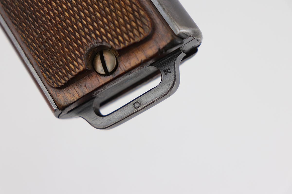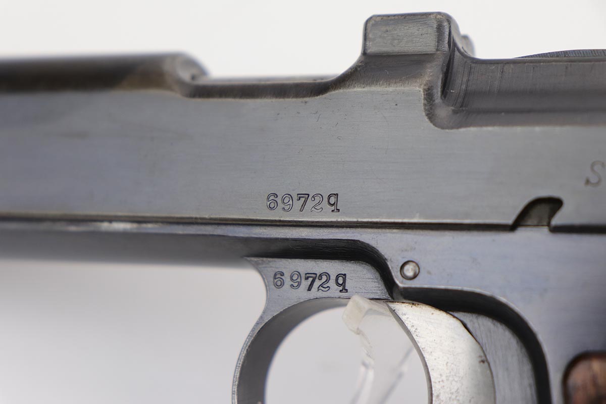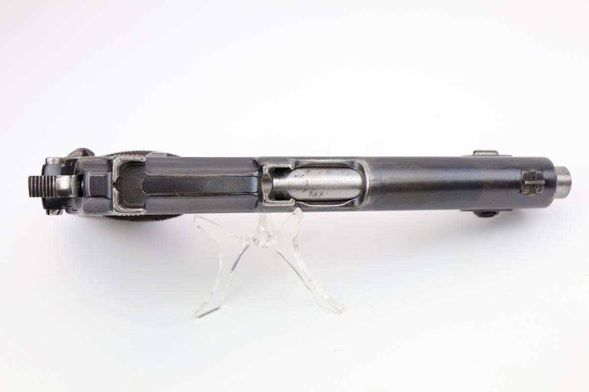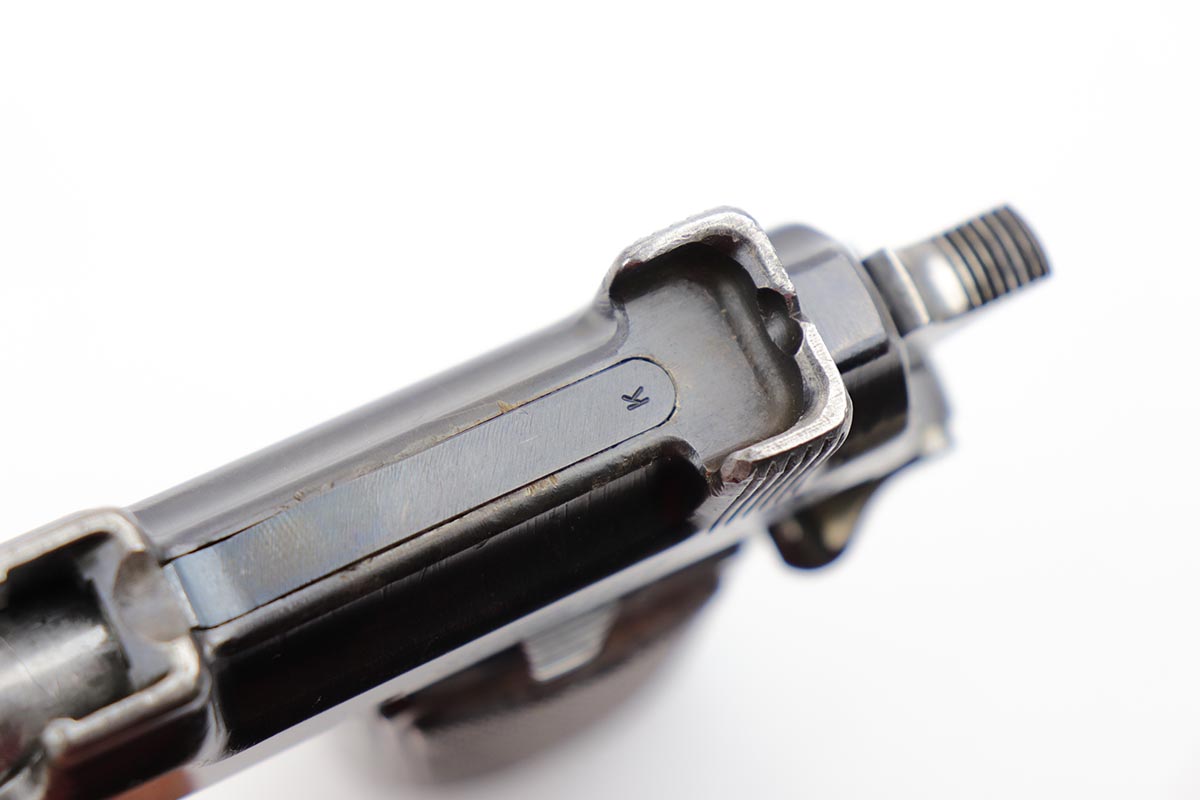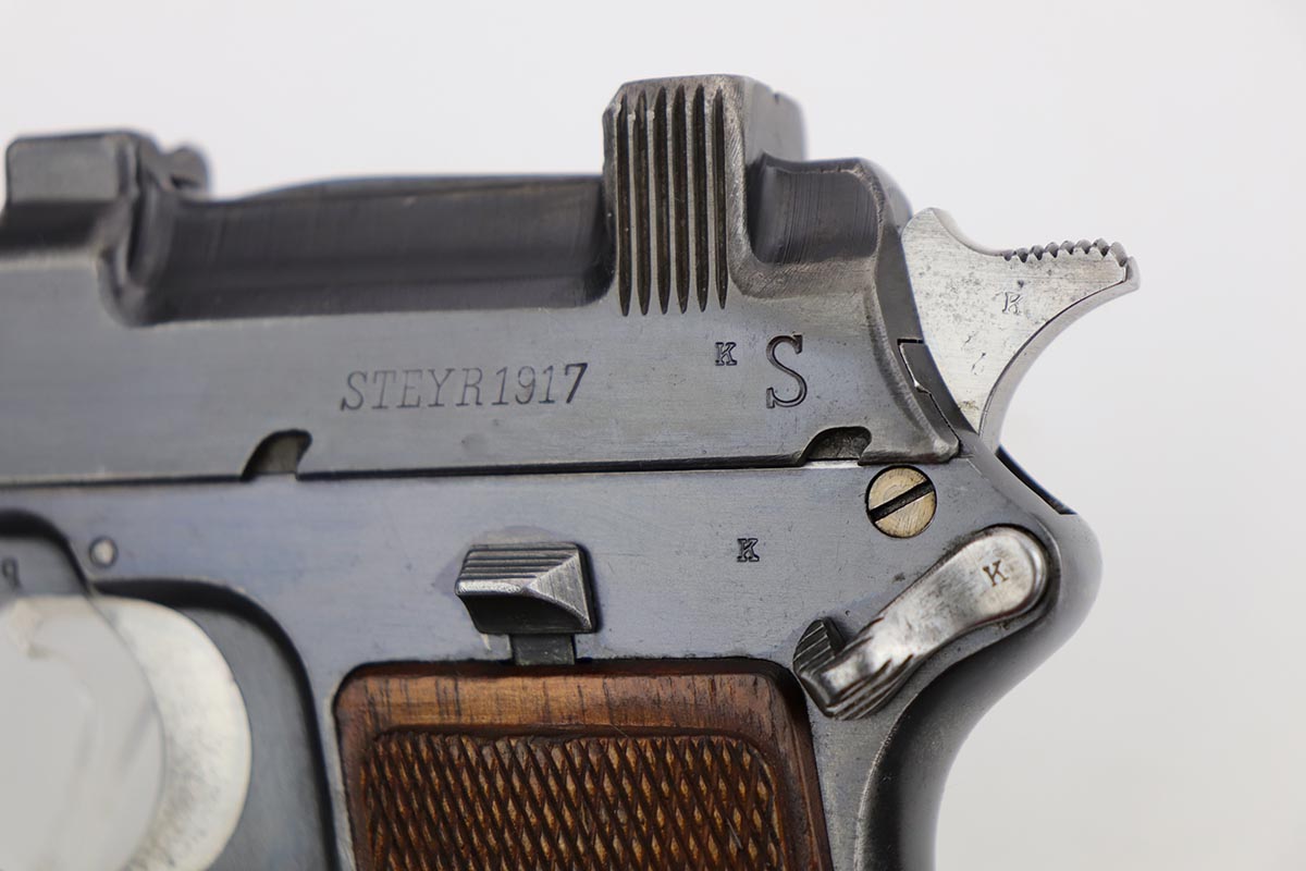 9/27/19 – This is an original and matching Steyr-Hahn M1912 that was manufactured in 1916 for the Imperial Army. It has about 90-92% of the original blue present, with thinning on the front strap and some notable patina on the slide. The right side of the frame is military proofed and ’16 dated. Excellent grips and a strong bore with only minor frost.