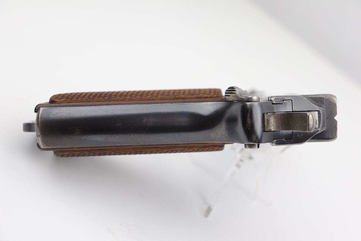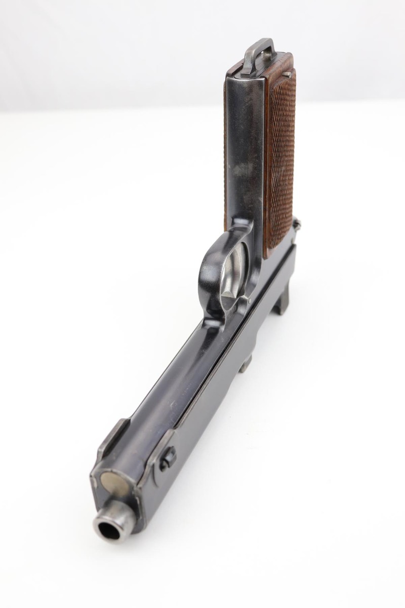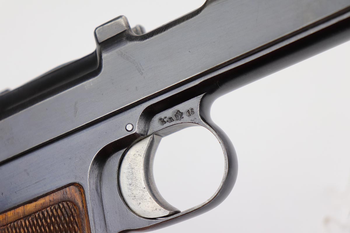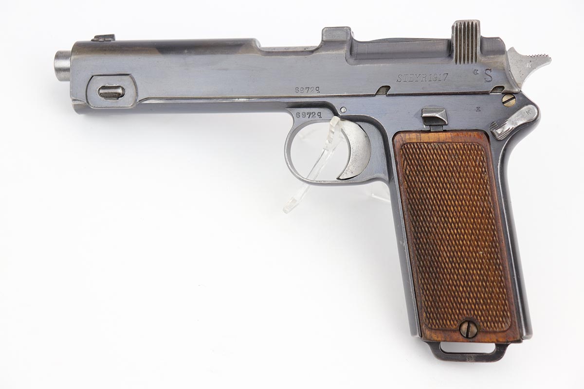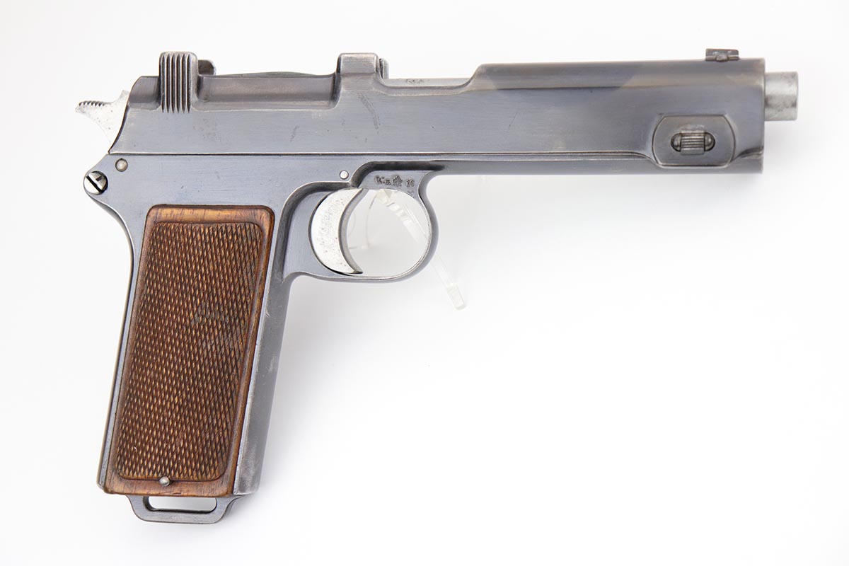 9/27/19 – This is an original and matching Steyr-Hahn M1912 that was manufactured in 1916 for the Imperial Army. It has about 90-92% of the original blue present, with thinning on the front strap and some notable patina on the slide. The right side of the frame is military proofed and ’16 dated. Excellent grips and a strong bore with only minor frost.