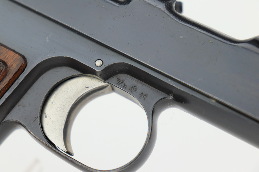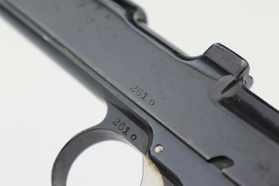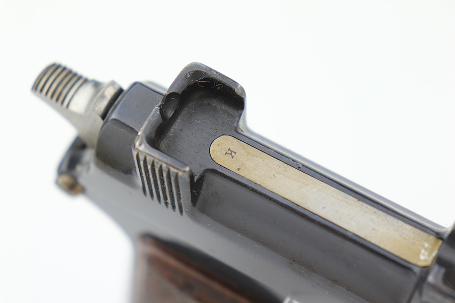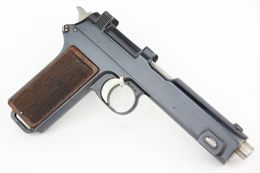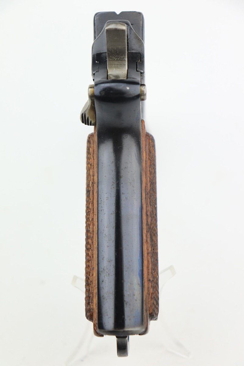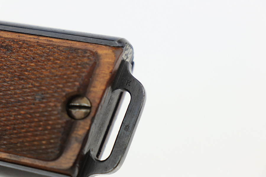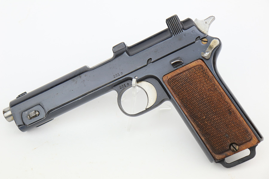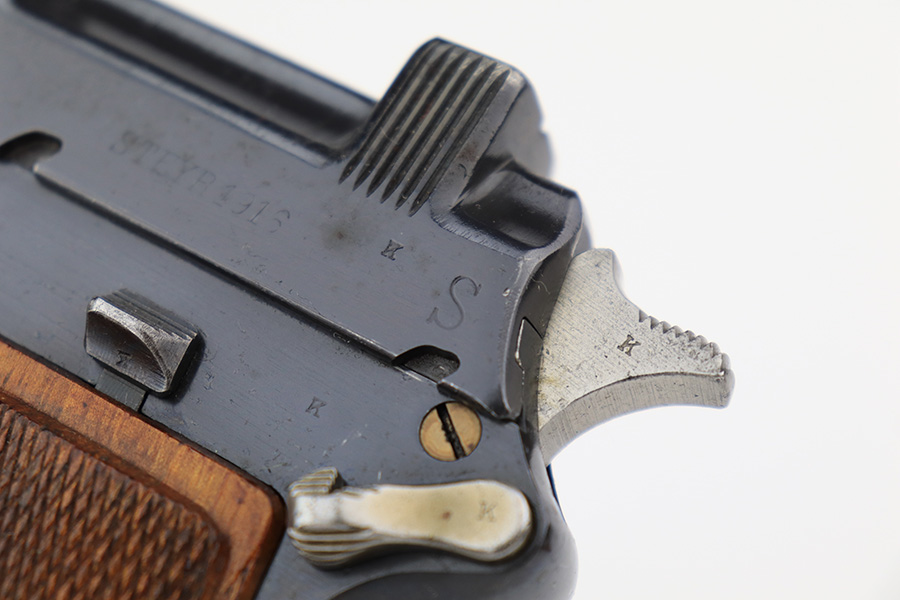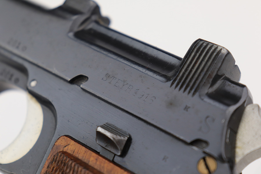 3/24/23 – This is an excellent example of a Steyr Hahn Model 1912 issued to the Austria-Hungarian military during WW1, in 1916. The gun is all matching, is dated 1916, and has the proper Austrian military acceptance proof on the right side of the trigger guard. There is no “08” on the left side of the slide, indicating that it was not converted to 9mm Luger and is therefore still chambered in 9mm Steyr. This particular gun has been refinished. There is almost no actual bluing loss. Very minor wear around the muzzle and some very light freckling on both grip straps and some on both sides of the slide. Excellent grips. Minty bore. Comes with one stripper clip.