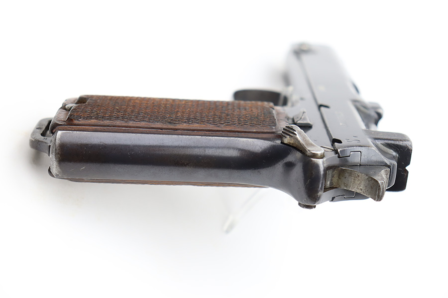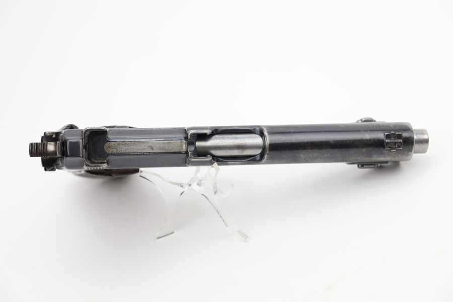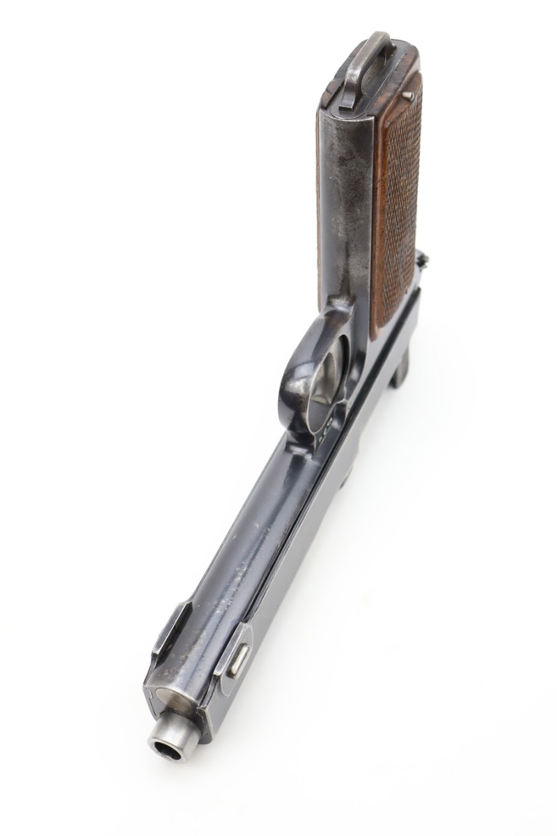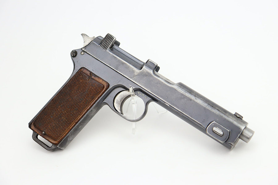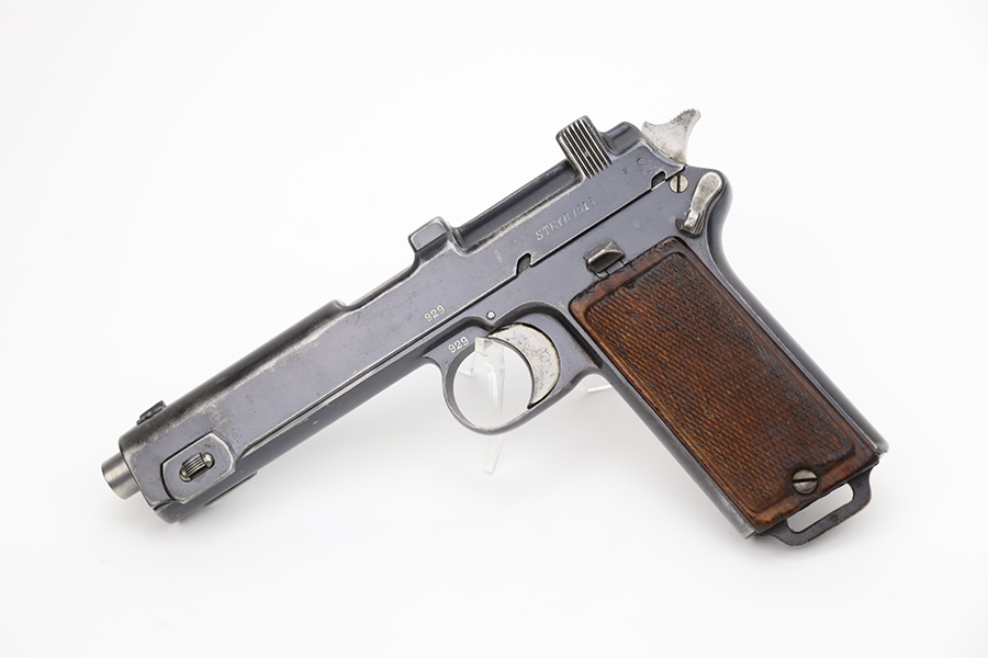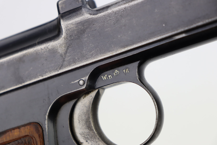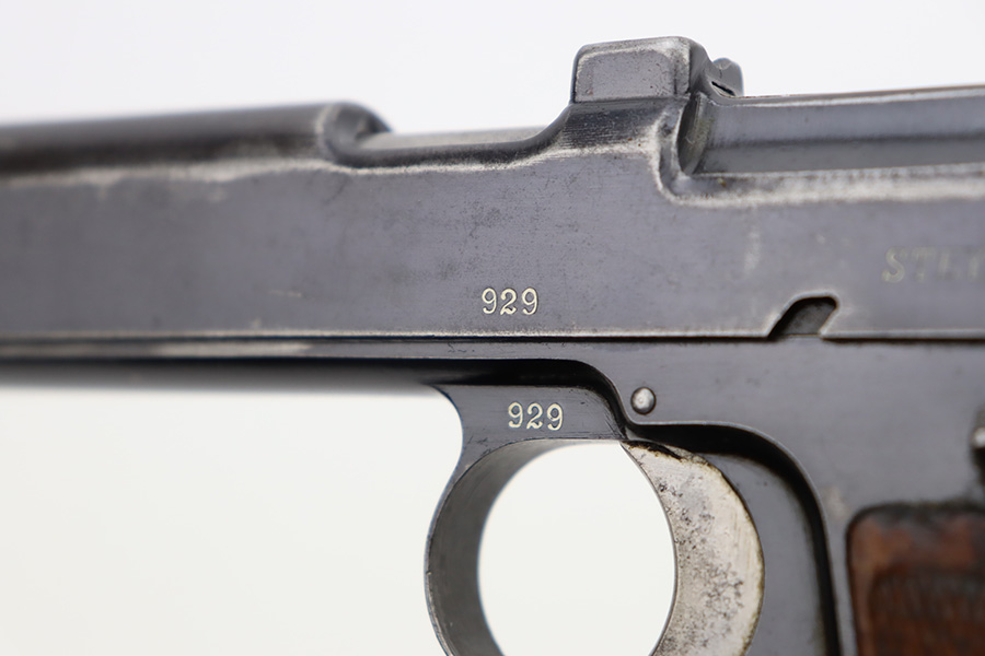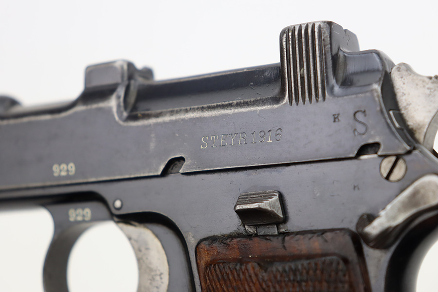 12/1/23 – This is a nice example of a Steyr Hahn Model 1912 issued to the Austria-Hungarian military during WW1, in 1916. The gun is all matching, is dated 1916, and has the proper Austrian military acceptance proof on the right side of the trigger guard. There is no “08” on the left side of the slide, indicating that it was not converted to 9mm Luger and is therefore still chambered in 9mm Steyr. This particular gun has retained roughly 75-80% of its original finish. There is obvious wear throughout, concentrated mostly around the high edges and on the front strap. Nice wood grips. The bore has decent rifling, but there is noticeable pin-pricking throughout.