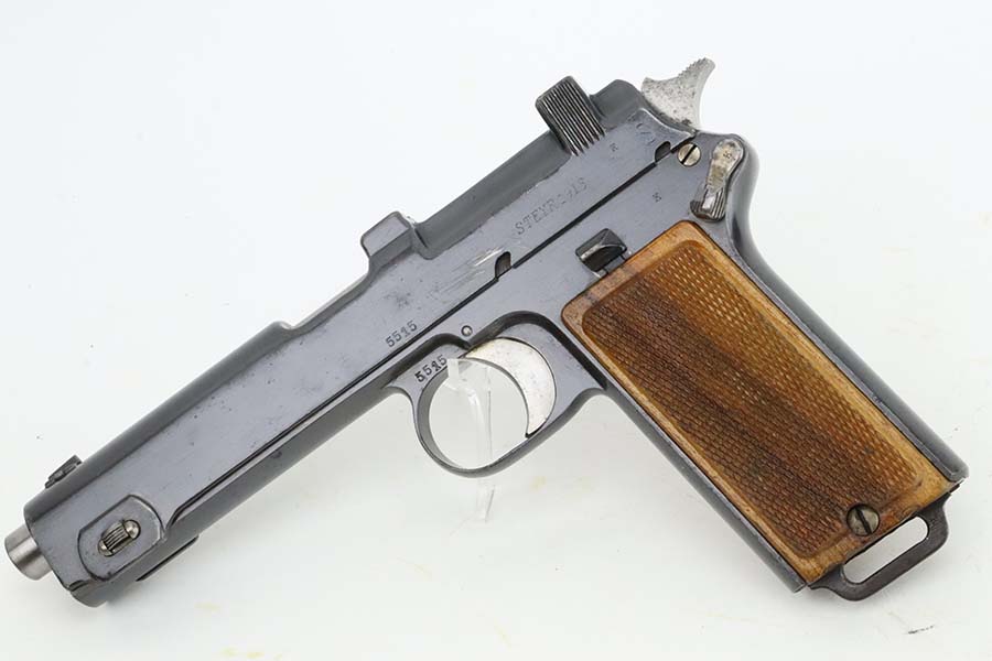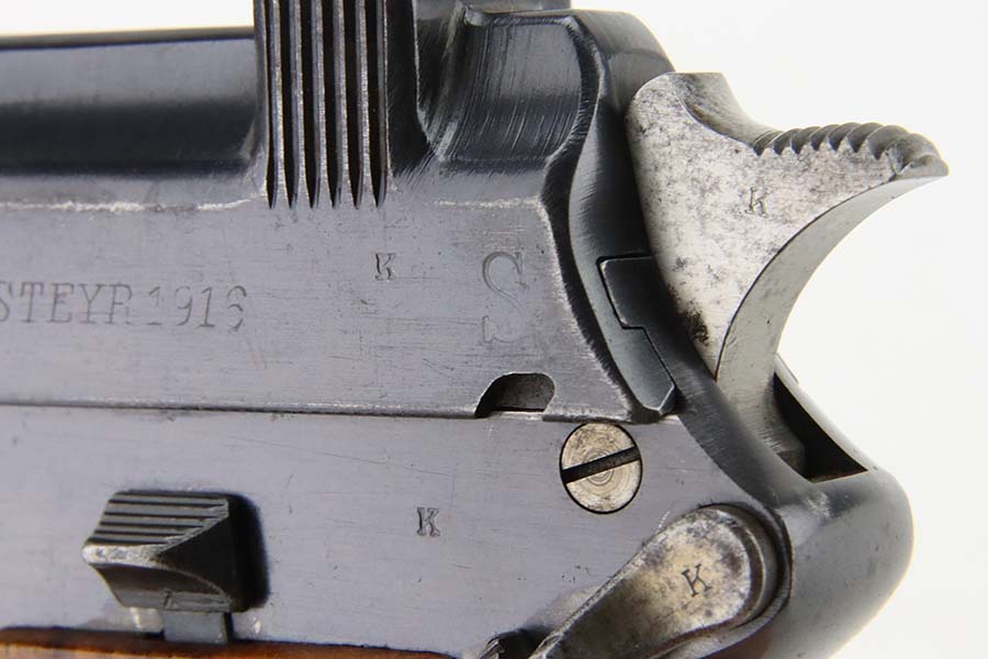 3/12/24 – This is an excellent example of a Steyr Hahn Model 1912 issued to the Austrian military in 1916. All matching with the proper Austrian military proof. There is no “08” marking on the slide, indicating it was never converted to 9mm Luger. The original finish rates about 97%. While there is very little finish loss, there is some light spotty oxidation on the grip straps. Fitted with period-correct wood grips – bruising on the bottom edges. Excellent bore with great rifling.