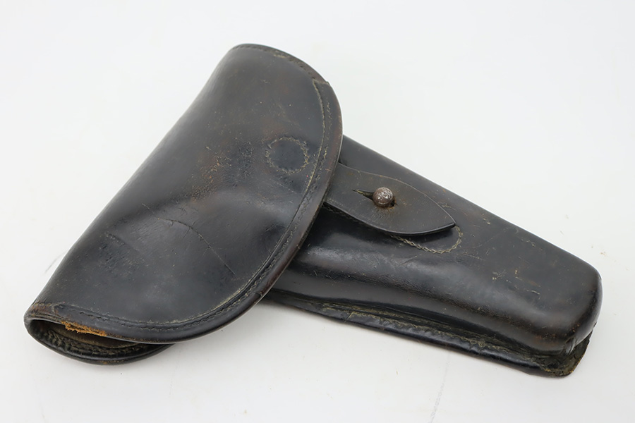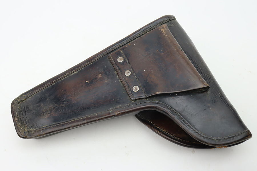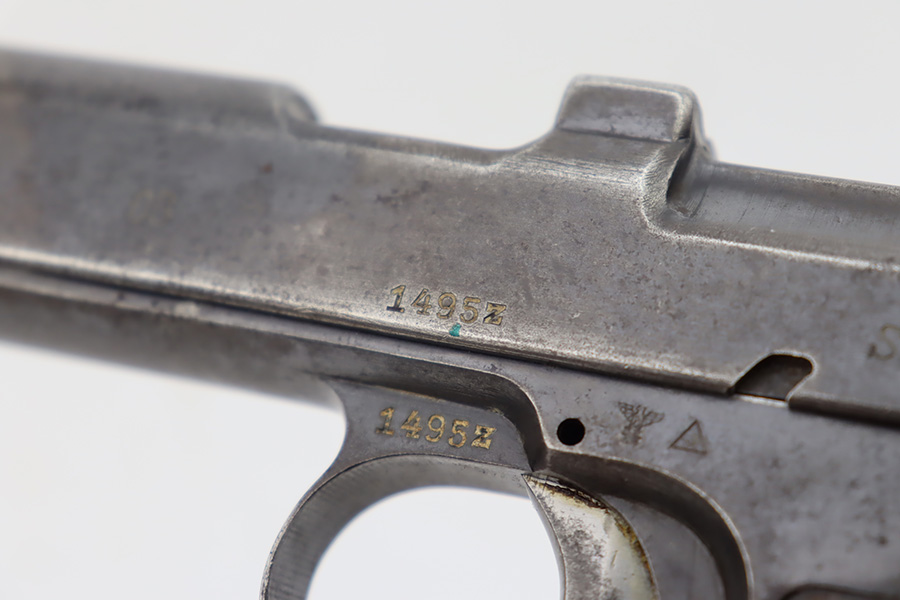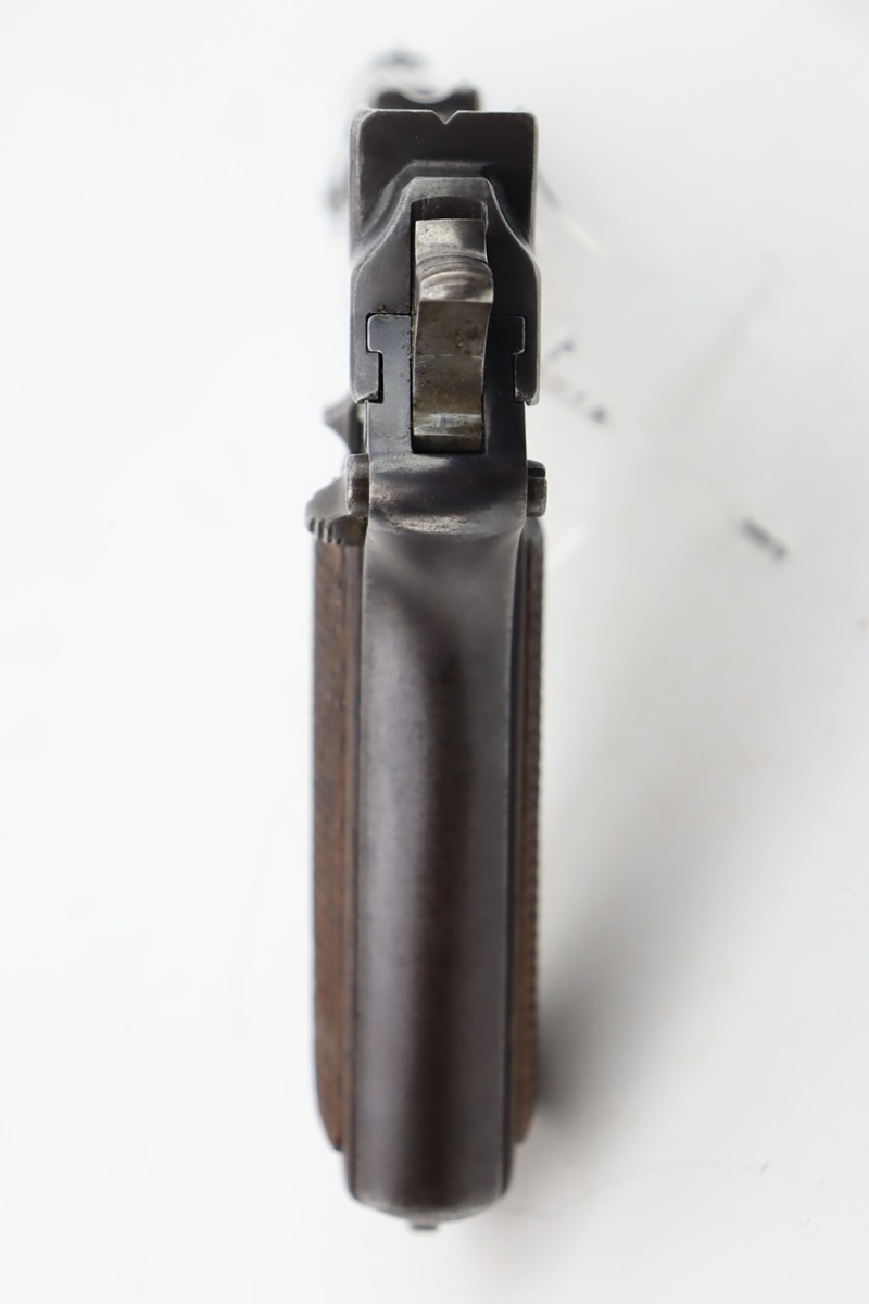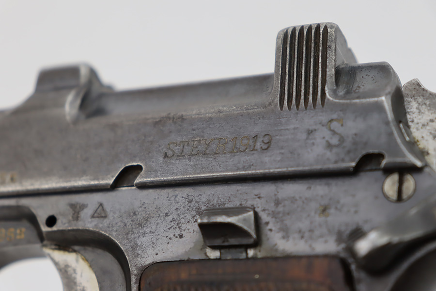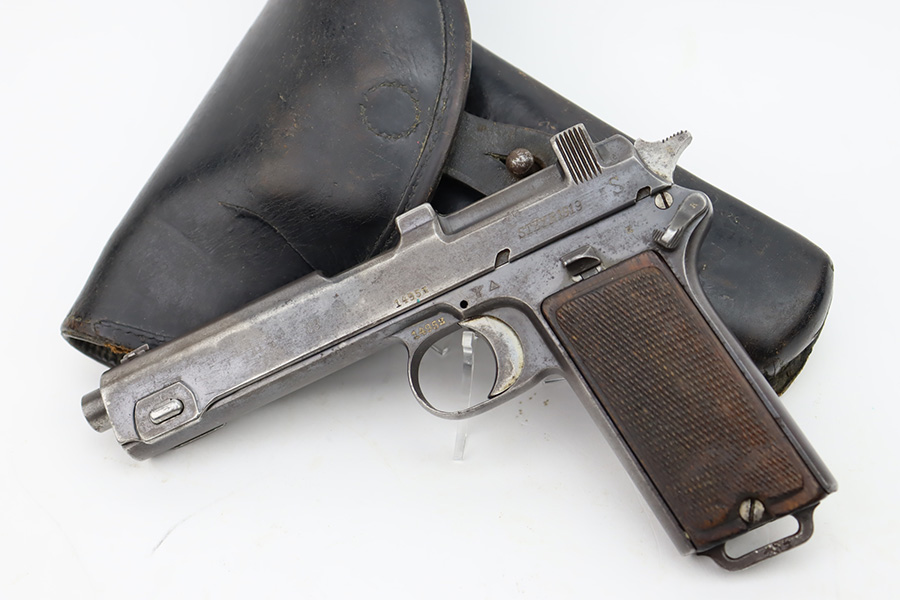 10/20/23 – This a nice example of a Steyr Hahn Model 1912 Rig that was originally issued to the Austria-Hungarian military in 1930 and then reworked by the Nazis. It is matching with an “Eagle N” marking on the left side of the frame and a Nazi test eagle on the right side of the frame. Unit marking on the lanyard loop on the butt of the frame. The “08” on the slide indicates it was re-chambered for 9mm luger. It comes as a rig with a rare black leather holster. The bluing on the gun rates roughly 75% with general high edge wear, thinning along the slide and on the grips, and areas of light spotty oxidation and pin-pricking throughout. Fitted with period-correct wood grips. The rifling in the bore is slightly worn with minor pitting throughout. There appears to be a small pin missing on the left side of the frame above the trigger.