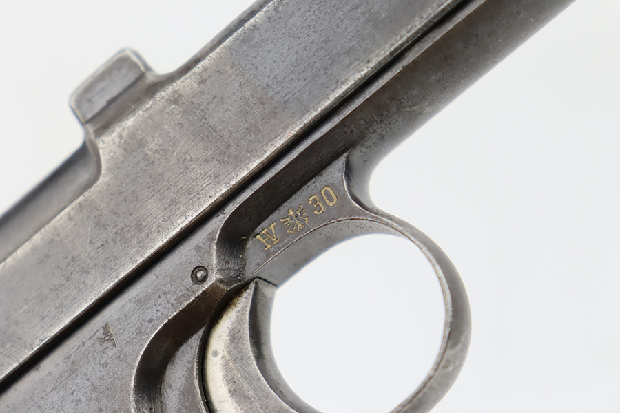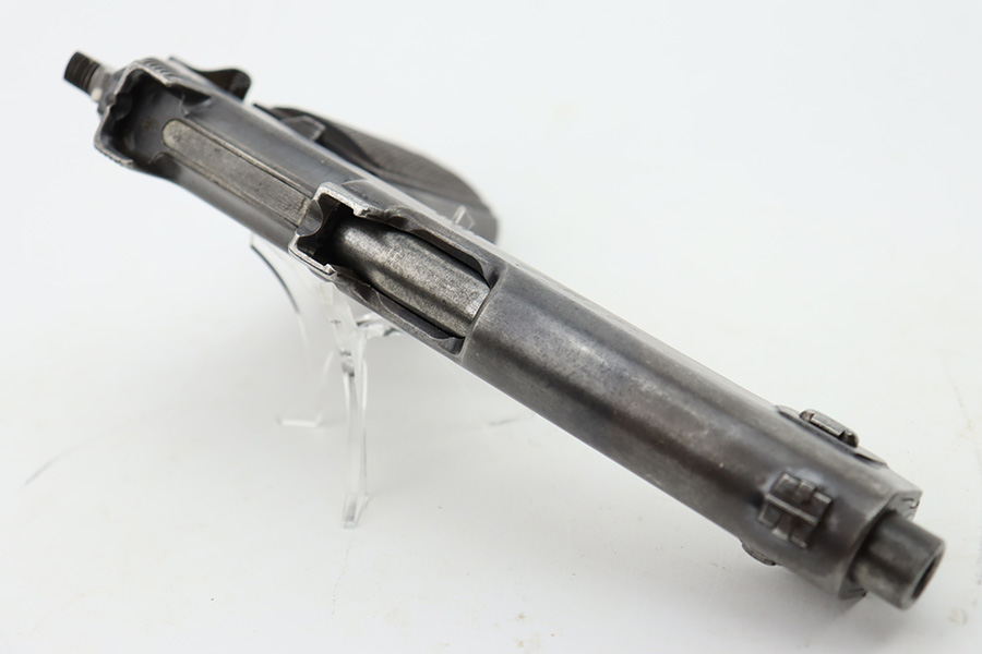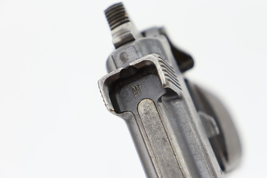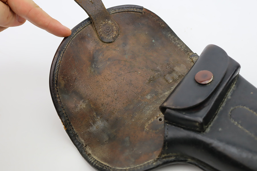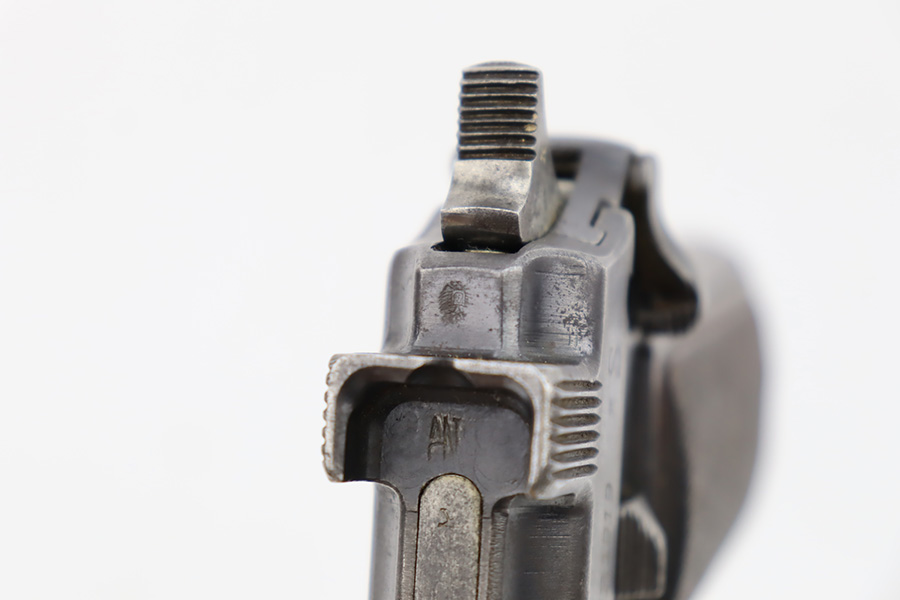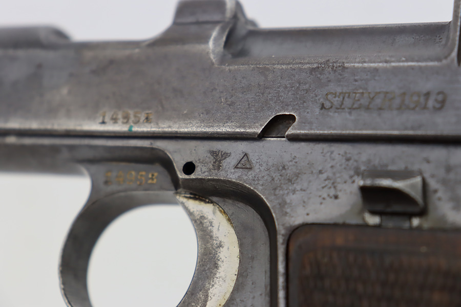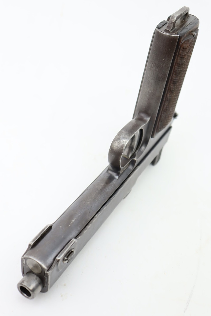 10/20/23 – This a nice example of a Steyr Hahn Model 1912 Rig that was originally issued to the Austria-Hungarian military in 1930 and then reworked by the Nazis. It is matching with an “Eagle N” marking on the left side of the frame and a Nazi test eagle on the right side of the frame. Unit marking on the lanyard loop on the butt of the frame. The “08” on the slide indicates it was re-chambered for 9mm luger. It comes as a rig with a rare black leather holster. The bluing on the gun rates roughly 75% with general high edge wear, thinning along the slide and on the grips, and areas of light spotty oxidation and pin-pricking throughout. Fitted with period-correct wood grips. The rifling in the bore is slightly worn with minor pitting throughout. There appears to be a small pin missing on the left side of the frame above the trigger.