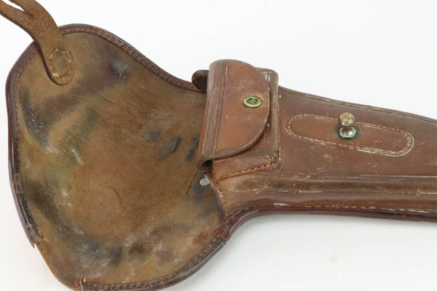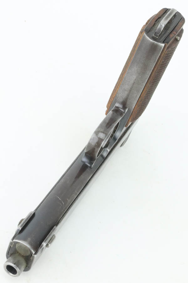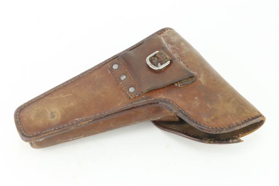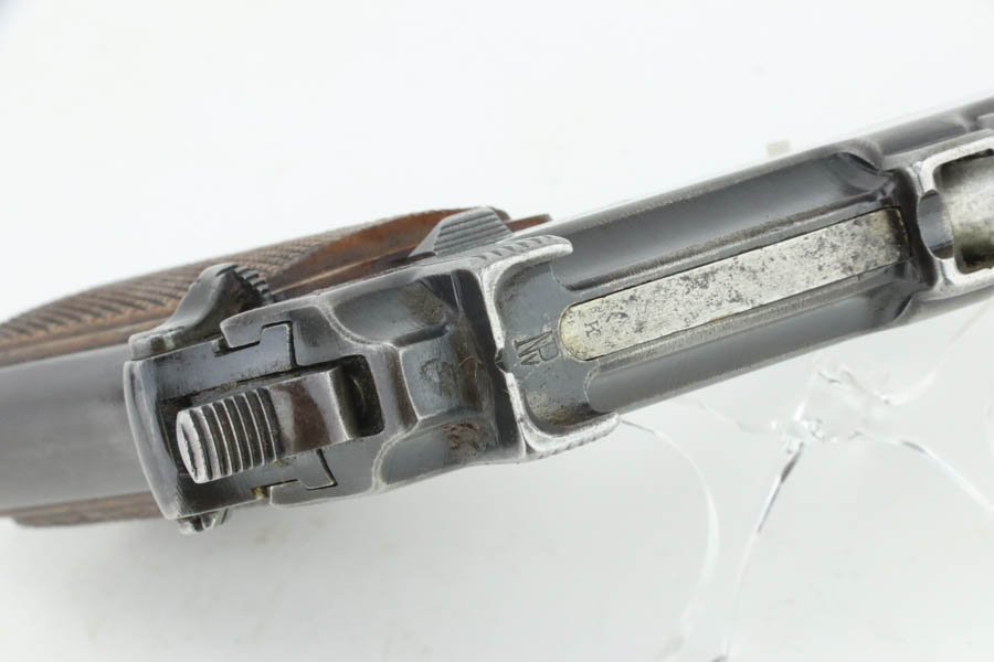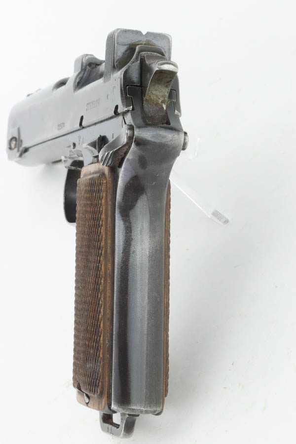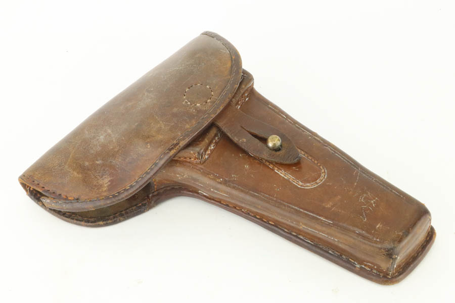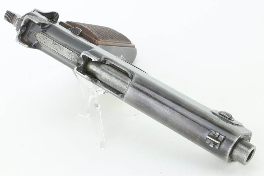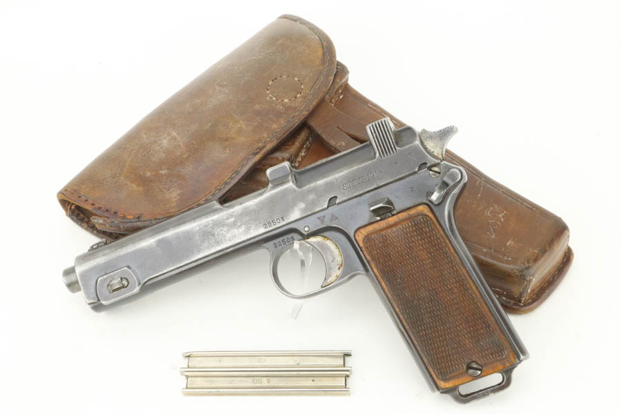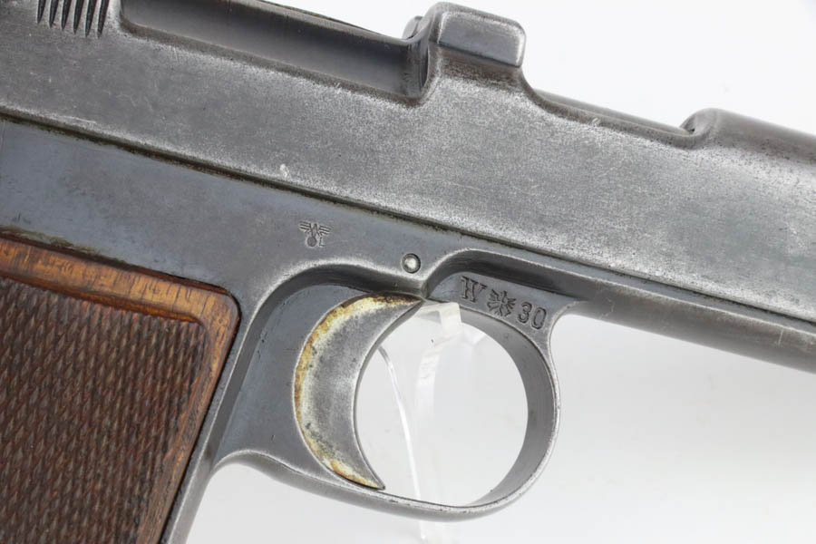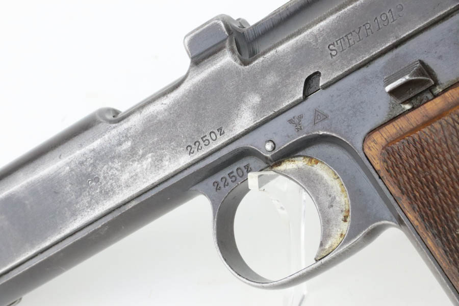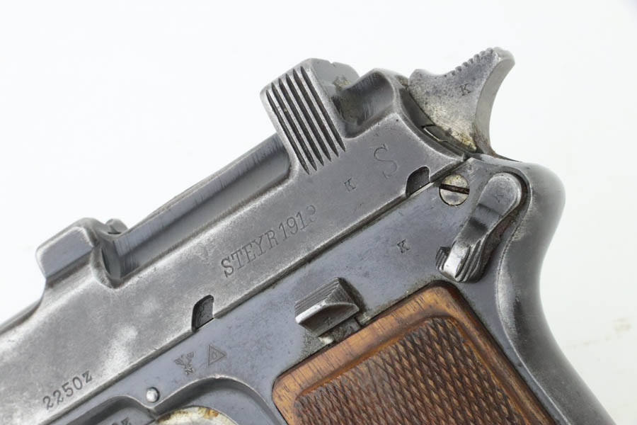 8/7/24 – This a Steyr Hahn Model 1912 Rig that was originally issued to the Austria-Hungarian military. Austrian proof and 1930 date on the right side of the trigger guard. It was reworked and issued to the Nazi police force during WW2. The slide and frame are matching, but the barrel is mismatched. It has “Eagle N” and police “Eagle L” markings. The “08” on the slide indicates it was re-chambered for 9mm luger. It comes as a rig with a scarce period-correct leather holster and two stripper clips. The gun’s finish rates roughly 75% with obvious wear on the slide and grip straps. Fitted with period-correct wood grips. The bore has pretty good rifling, but there is tiny pitting throughout.