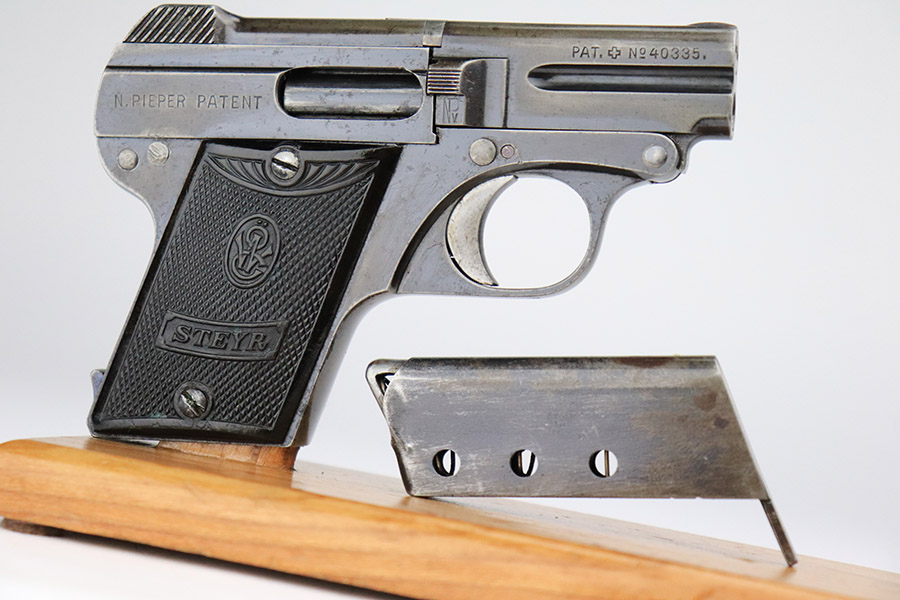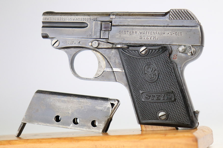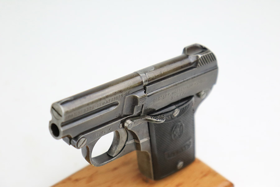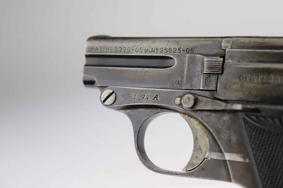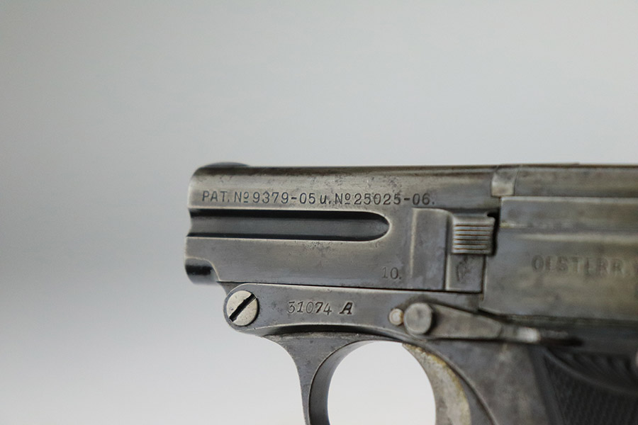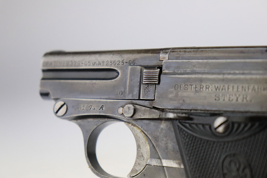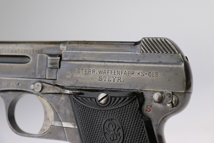 11/8/22 – This is a Steyr Model 1909 Pocket Pistol, manufactured in 1910 and chambered in 6.35mm. As indicated by the Eagle marking on the left side, this gun was issued to the Austrian police force. It is all matching but has lost the majority of its original finish. There is noticeable finish loss, light brown patina, and areas of very light pin-pricking throughout. Most of the remaining finish is on the right side of the gun. Comes with excellent period-correct black bakelite grips and one proper magazine. The bore has decent rifling with minor pin-pricking throughout.