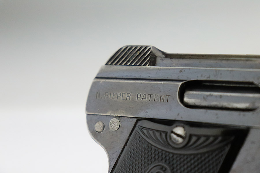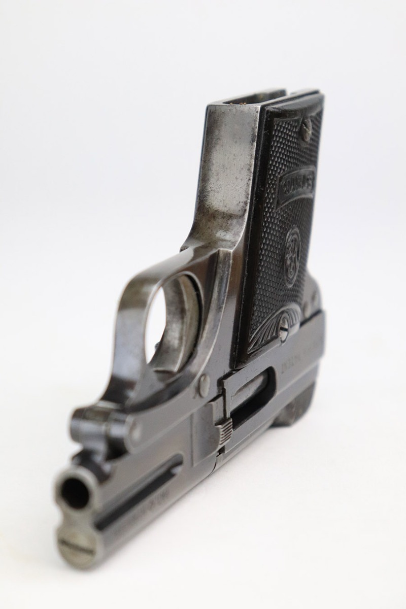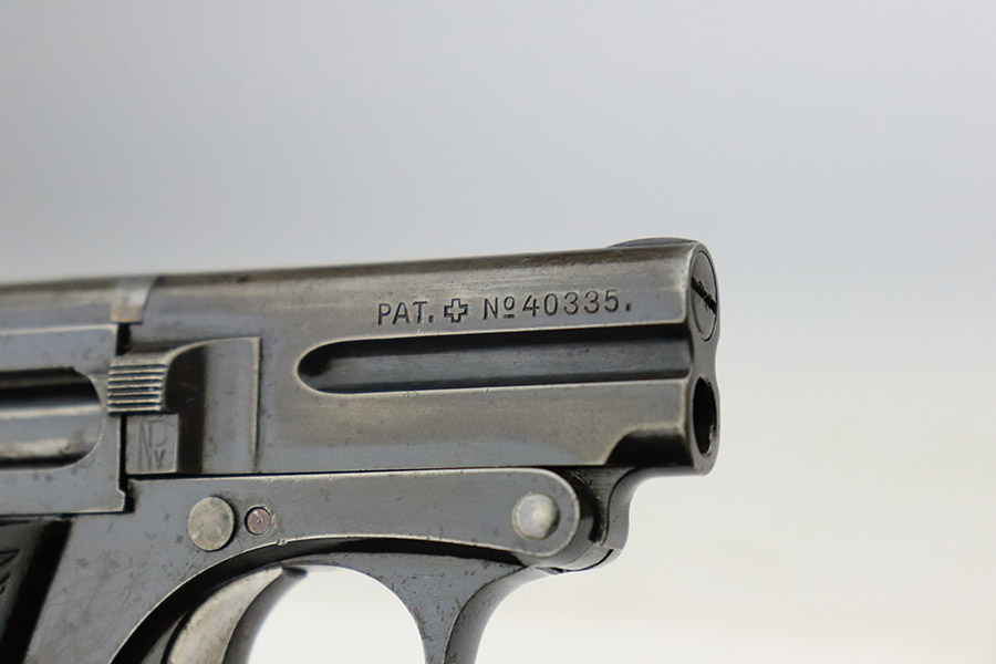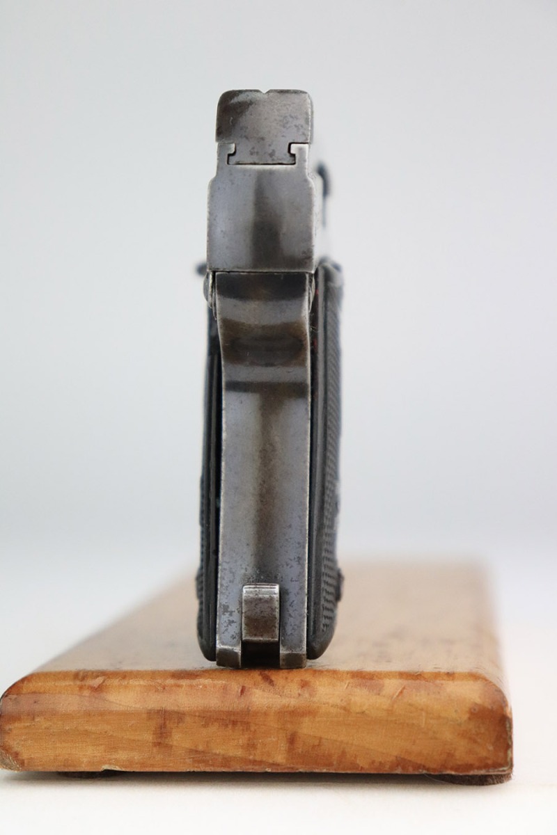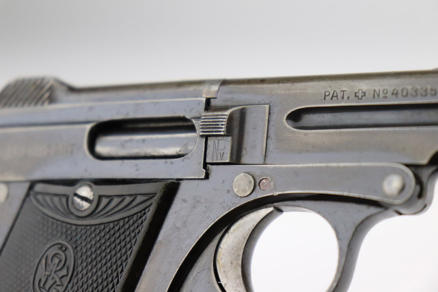 11/8/22 – This is a Steyr Model 1909 Pocket Pistol, manufactured in 1910 and chambered in 6.35mm. As indicated by the Eagle marking on the left side, this gun was issued to the Austrian police force. It is all matching but has lost the majority of its original finish. There is noticeable finish loss, light brown patina, and areas of very light pin-pricking throughout. Most of the remaining finish is on the right side of the gun. Comes with excellent period-correct black bakelite grips and one proper magazine. The bore has decent rifling with minor pin-pricking throughout.