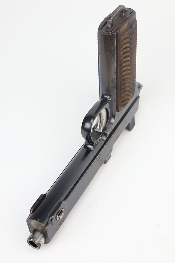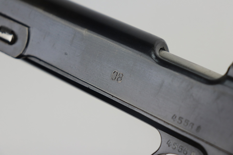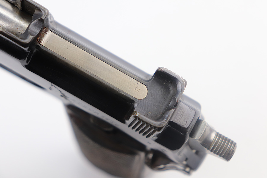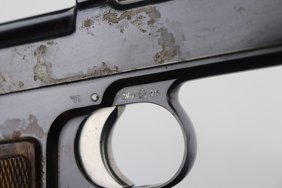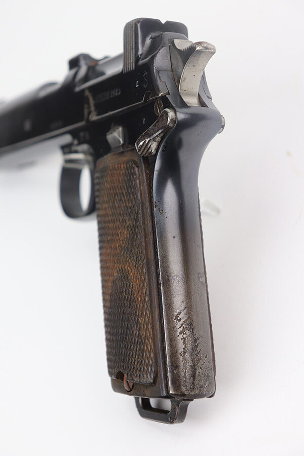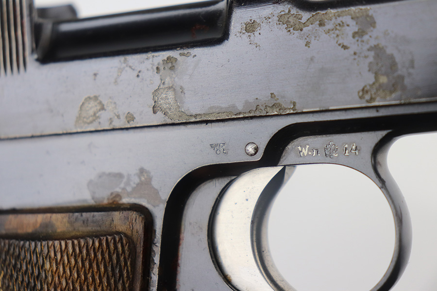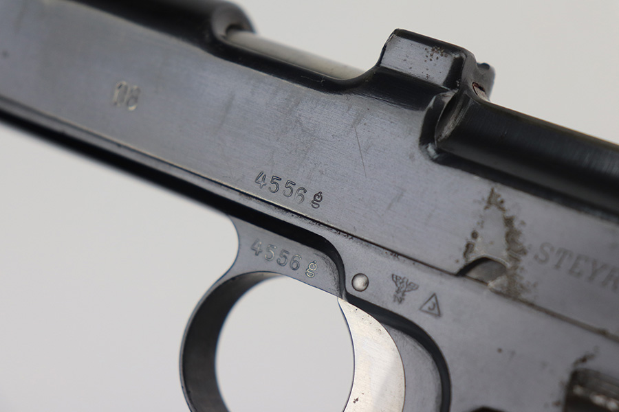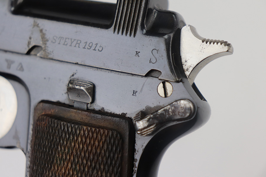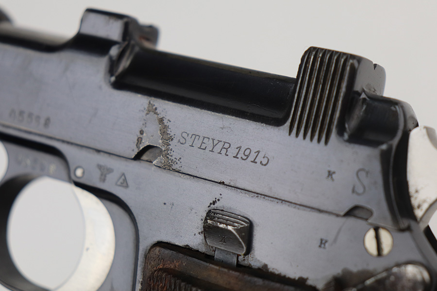 5/27/21 – This is a nice example of a Steyr Model 1912 that was issued to the Nazi police force during WW2. It is all matching, has an “Eagle N” proof, and a Nazi police “Eagle/L” marking. It also has an “08” marking on the left side of the slide, indicating it was converted to 9mm. It has retained about 90% of its original high polish finish. There is thinning on the straps and minor wear on the high edges of the slide. While there isn’t much actual finish loss, there are areas of significant pitting throughout, most noticeable on the straps, around the muzzle, and right side of the slide. Comes with nice wood grips. Mint bore.