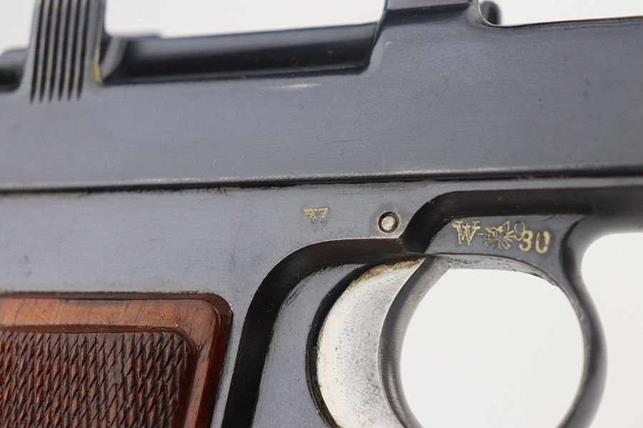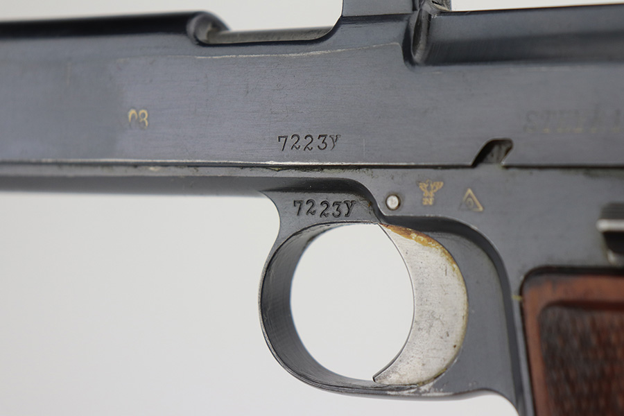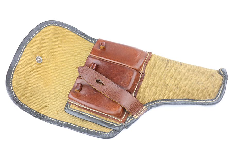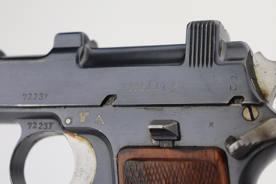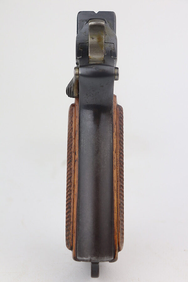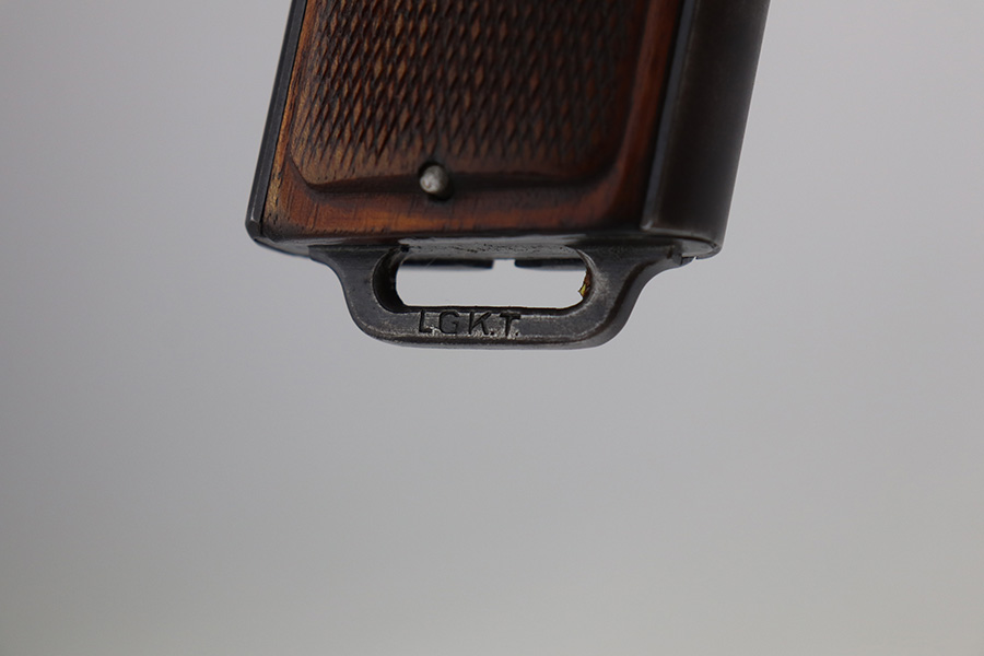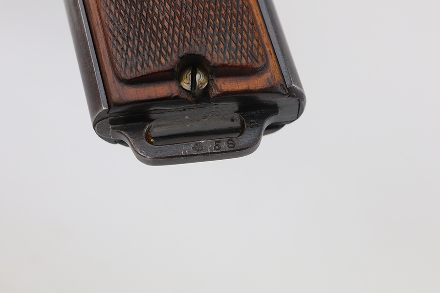 6/23/21 – This an excellent example of a Steyr Hahn Model 1912 Rig that was originally issued to the Austrian military in 1919 and then reworked and issued to the Nazi police force. The rig comes with a canvas holster and three stripper clips. The gun is all matching and has the “Eagle N” and police “Eagle L” markings. The “08” on the slide indicates it was re-chambered for 9mm. There is an “L.G.K.T.” marking on the lanyard loop. We believe this stands for a police organization. The finish looks like an old arsenal refinish. The gun has retained about 93% of its finish. There is thinning and spotty patina on the straps. Minor wear on the high edges of the slide and around the muzzle. Some minor handling marks on the underside of the frame and trigger guard. Excellent wood grips. Mint bore.