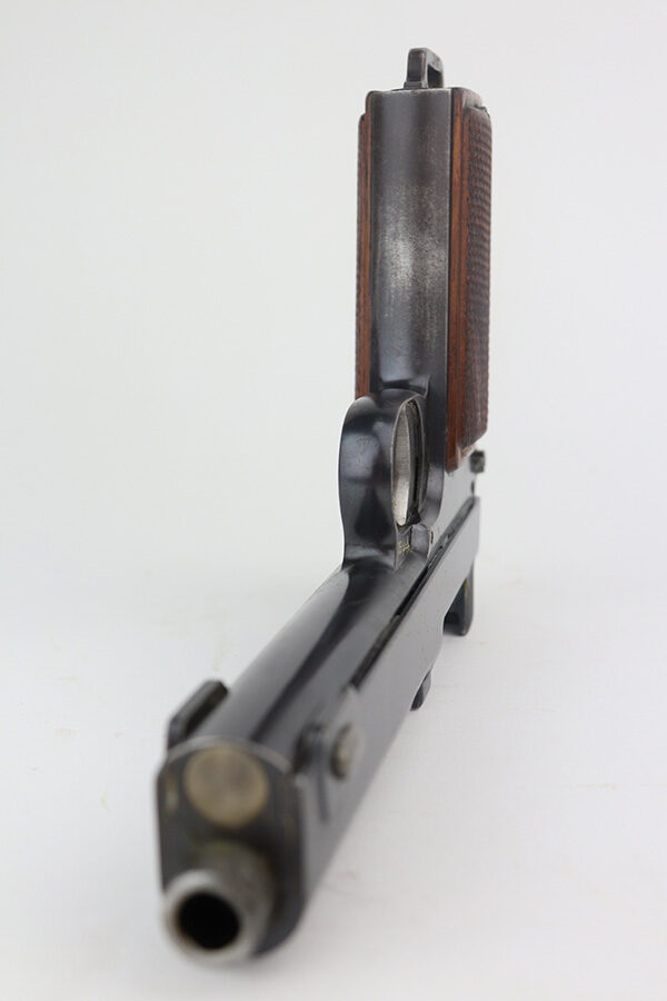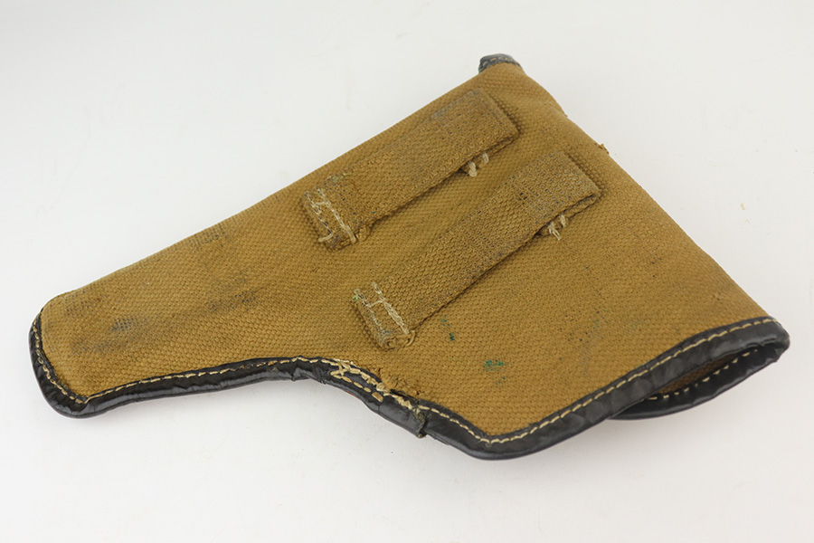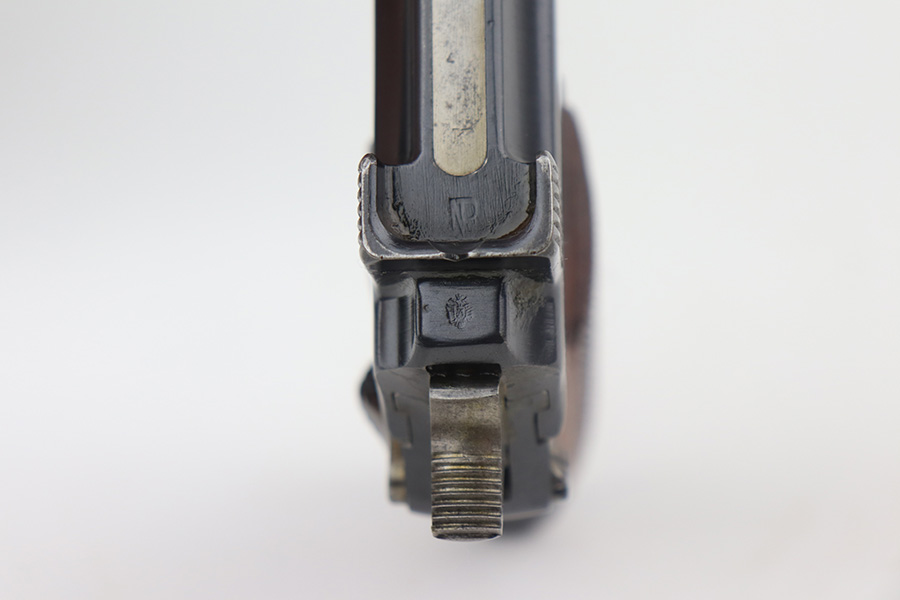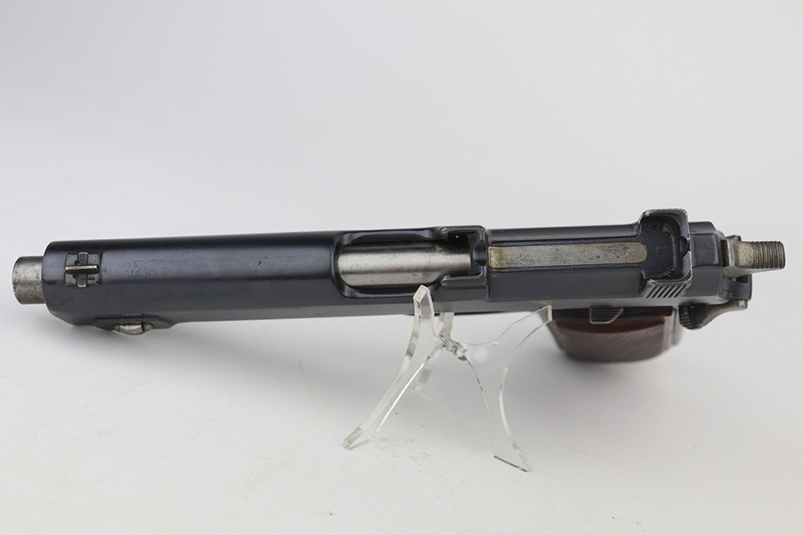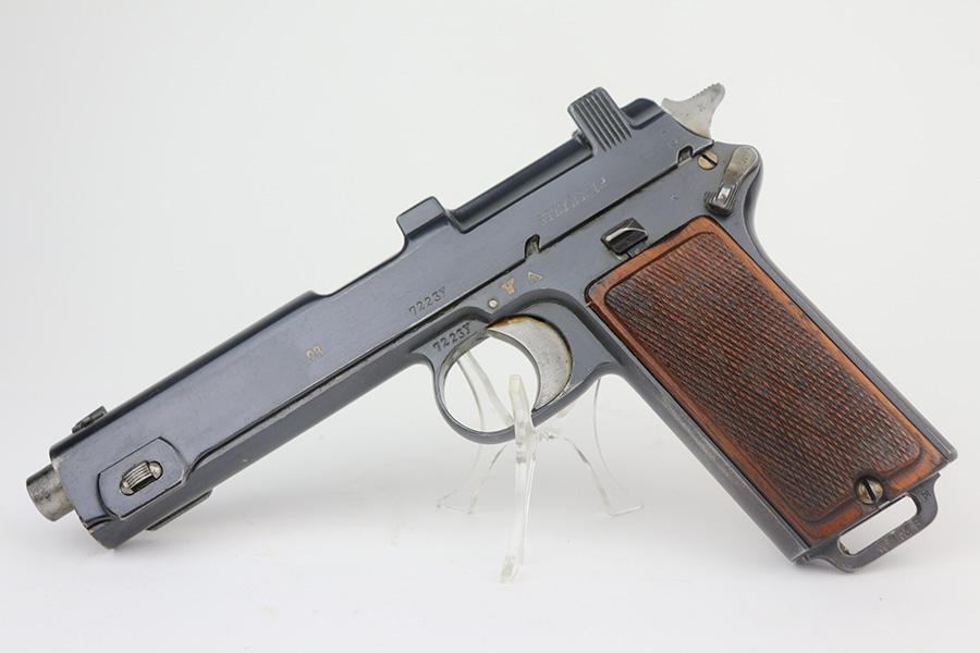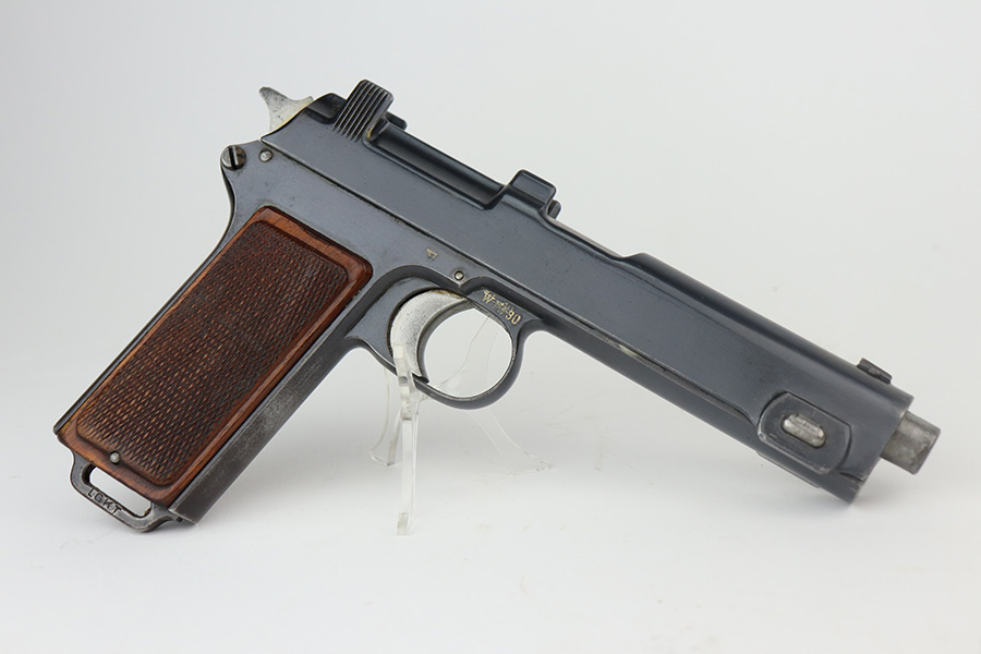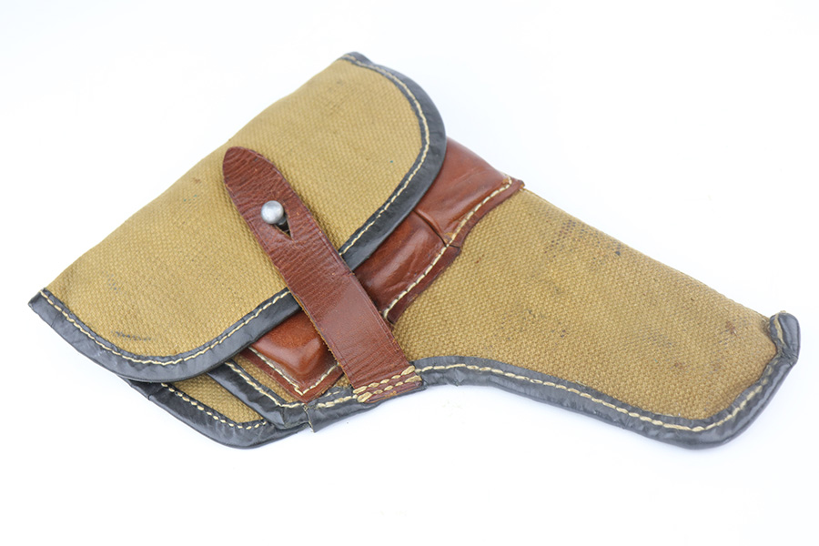 6/23/21 – This an excellent example of a Steyr Hahn Model 1912 Rig that was originally issued to the Austrian military in 1919 and then reworked and issued to the Nazi police force. The rig comes with a canvas holster and three stripper clips. The gun is all matching and has the “Eagle N” and police “Eagle L” markings. The “08” on the slide indicates it was re-chambered for 9mm. There is an “L.G.K.T.” marking on the lanyard loop. We believe this stands for a police organization. The finish looks like an old arsenal refinish. The gun has retained about 93% of its finish. There is thinning and spotty patina on the straps. Minor wear on the high edges of the slide and around the muzzle. Some minor handling marks on the underside of the frame and trigger guard. Excellent wood grips. Mint bore.