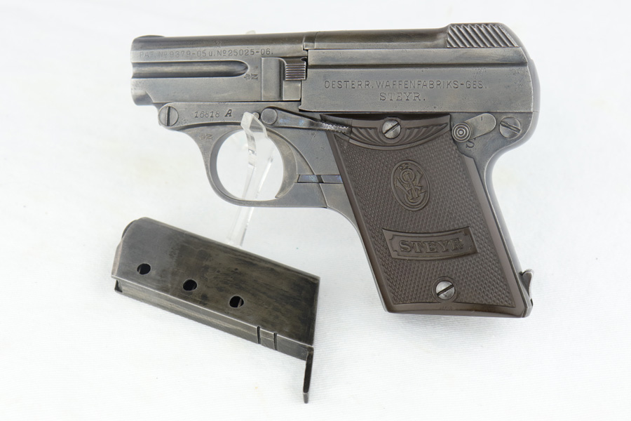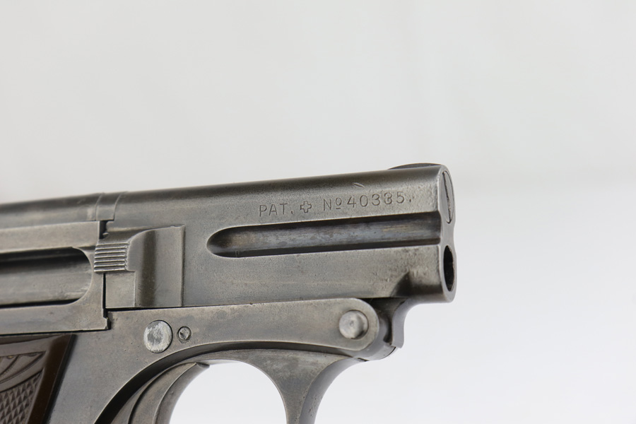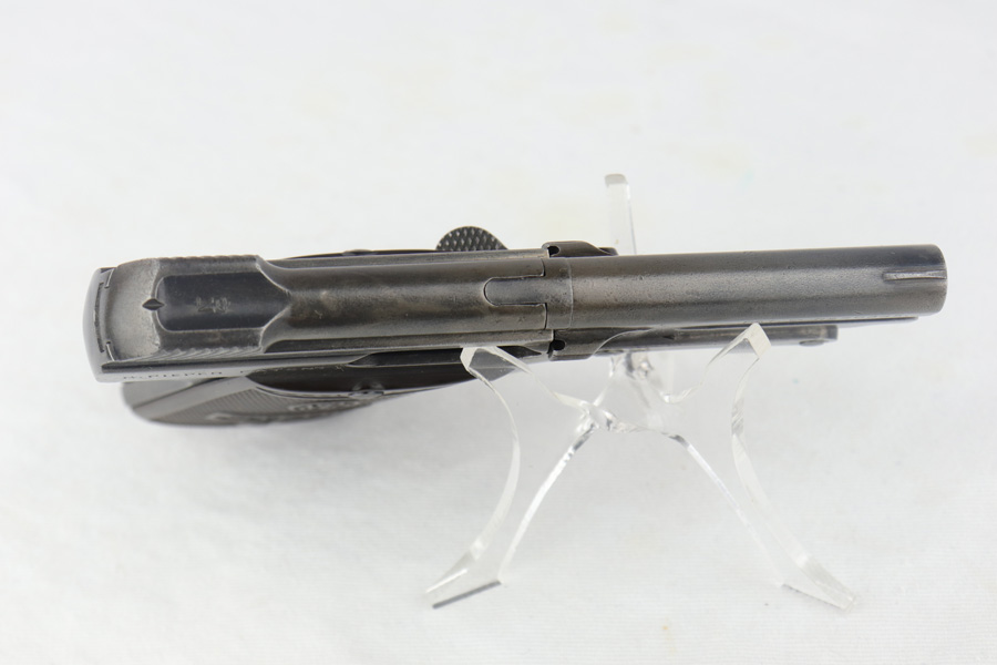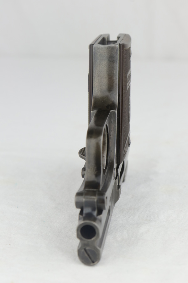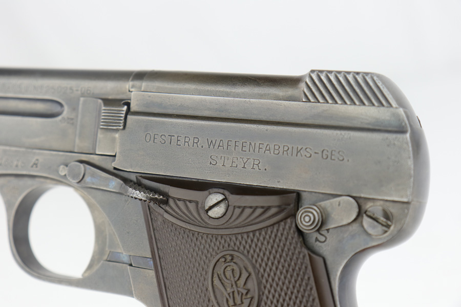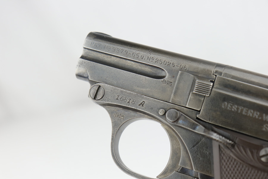4/12/19 – This is an original Steyr model 1909 made for commercial use, most likely before the start of WW1. This pistol has an interesting, unique design. The magazine has a “heel” for the magazine release to work, and the barrel can be easily cleaned with a top-break style. This pistol has even surface wear throughout, but none of the wear is excessive. The gips are excellent and the bore has some light patina but nice rifling. Overall a nice collector-grade pocket pistol.