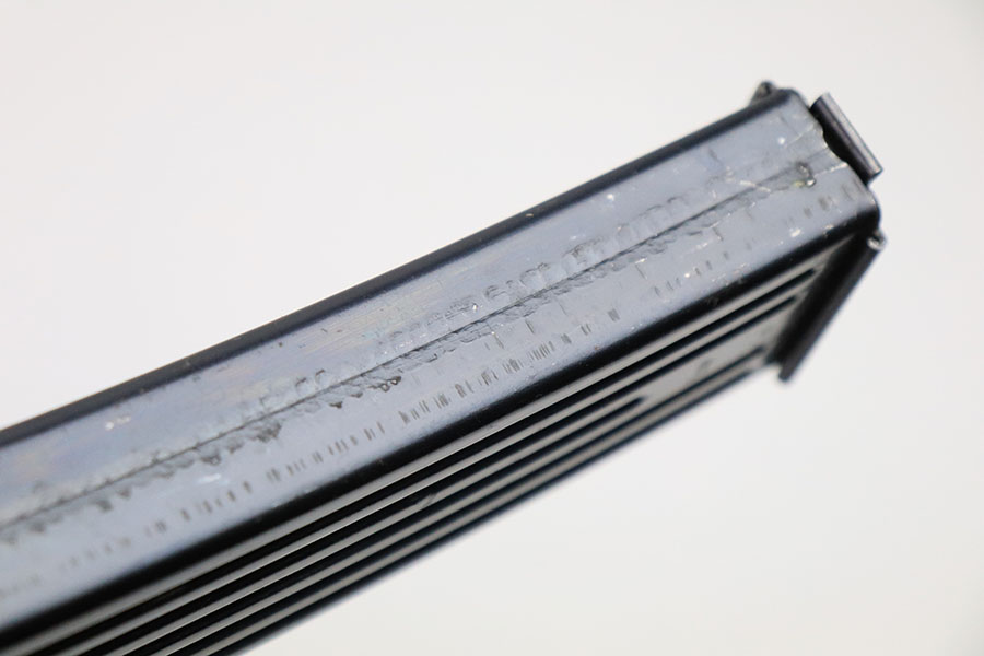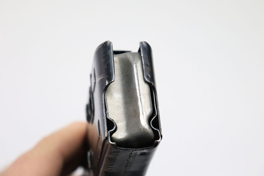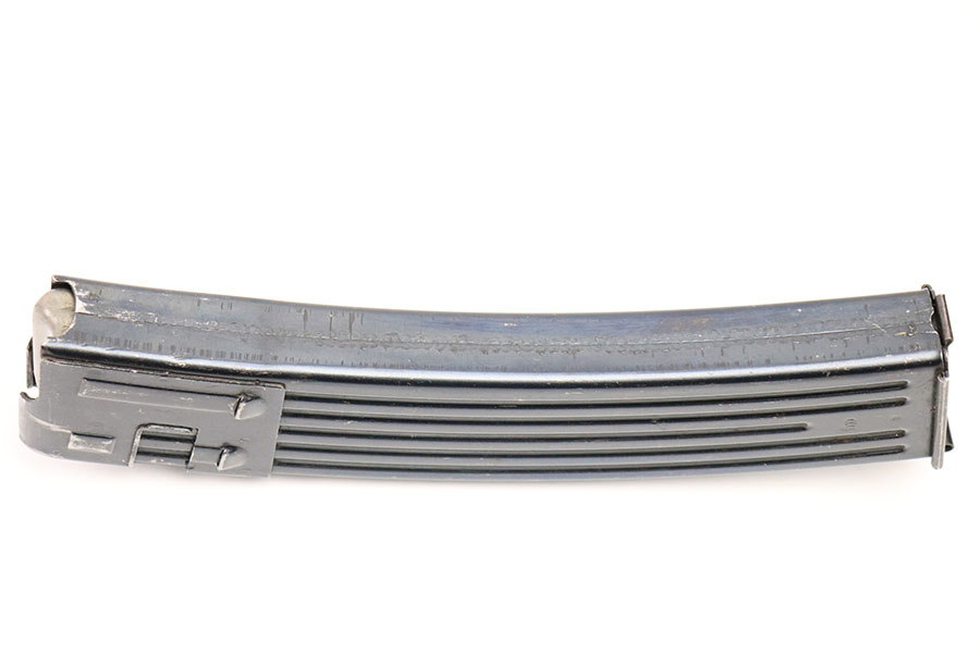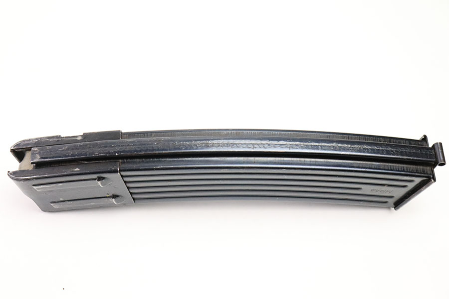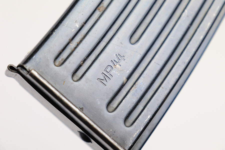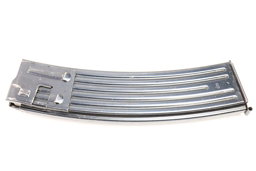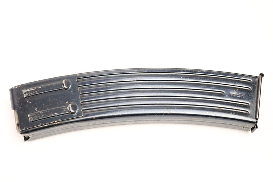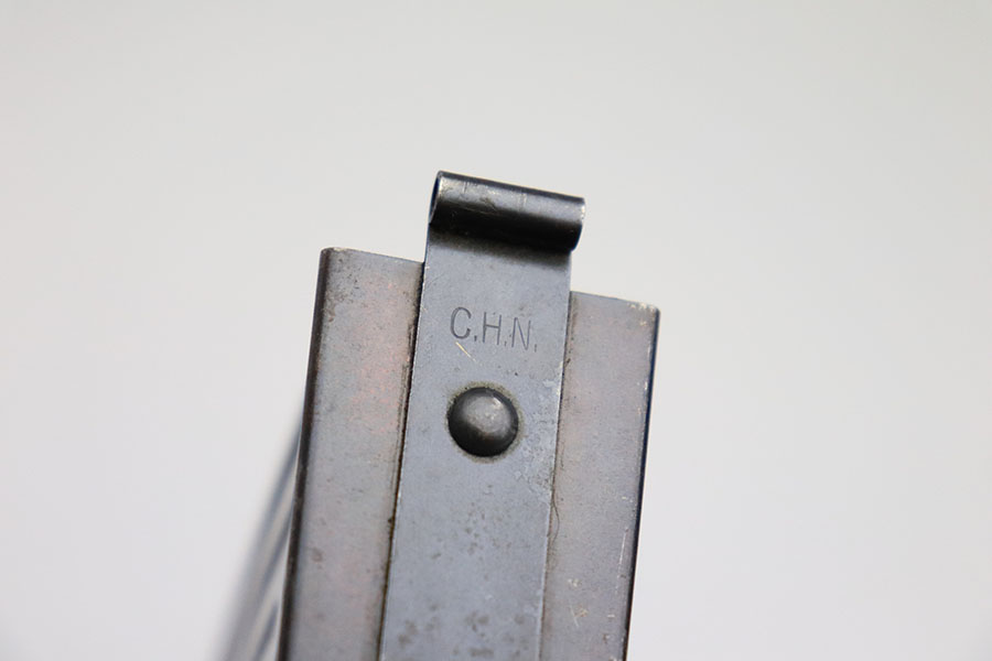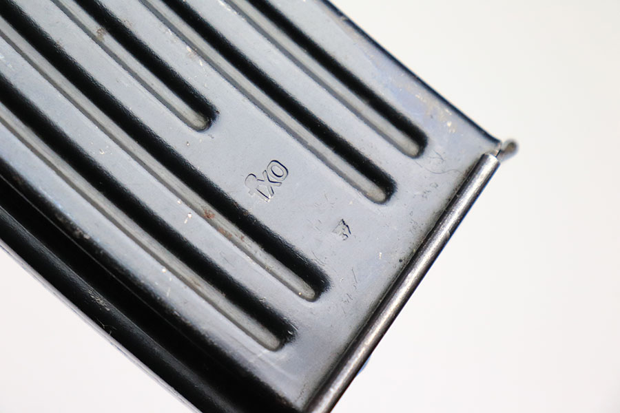 10/11/22 – This is an original STG44 / MP44 magazine from WW2. These magazines are increasingly hard to find and very desirable, holding 30 rounds of 8mm kurz (7.92x33mm). This example is maker stamped “fxo” by Haenel, and proof stamped with an eagle/37 military proof. The base is stamped “C.H.N.” as shown. The magazine spring is tight and fully functional.