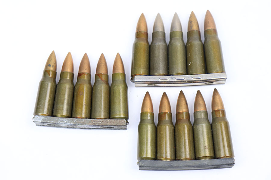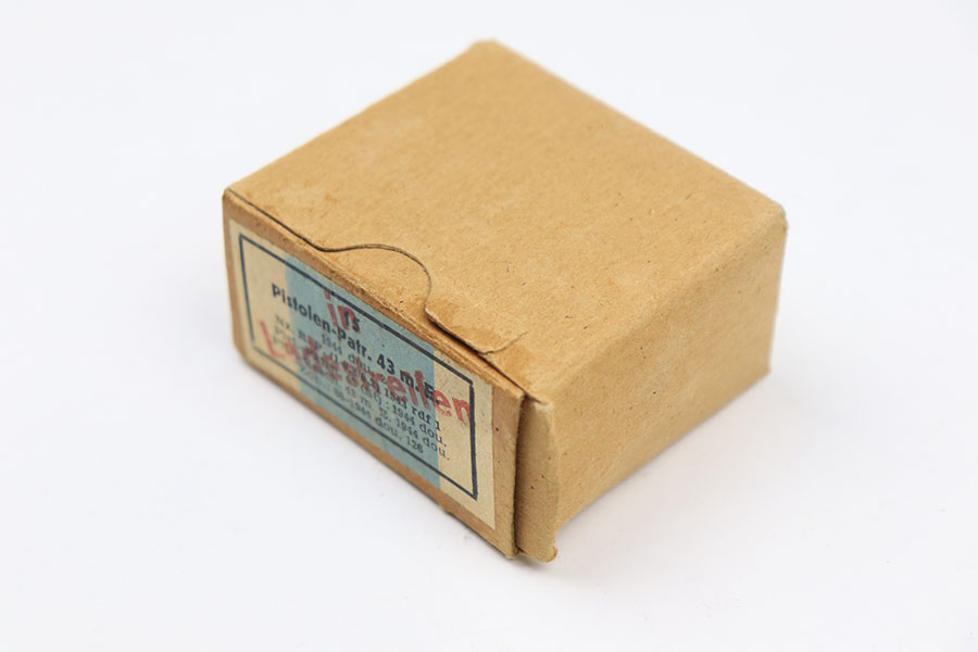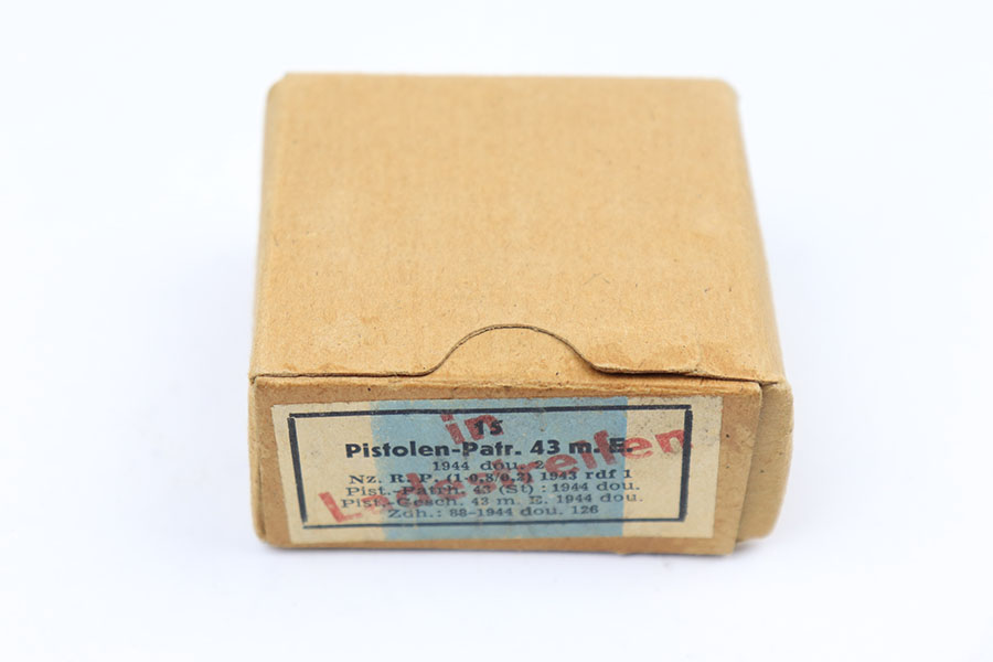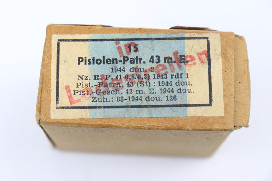 2/26/21 – This is an original box of MP44 / STG44 ammunition from WW2. Excellent condition overall. Three original stripper clips of ammo, as shown. One is not marked, and the other two are marked ’43 and ’44. The original box is excellent and the label is in tact and dated 1944. Extremely rare and desirable ammunition seldom found in this condition.