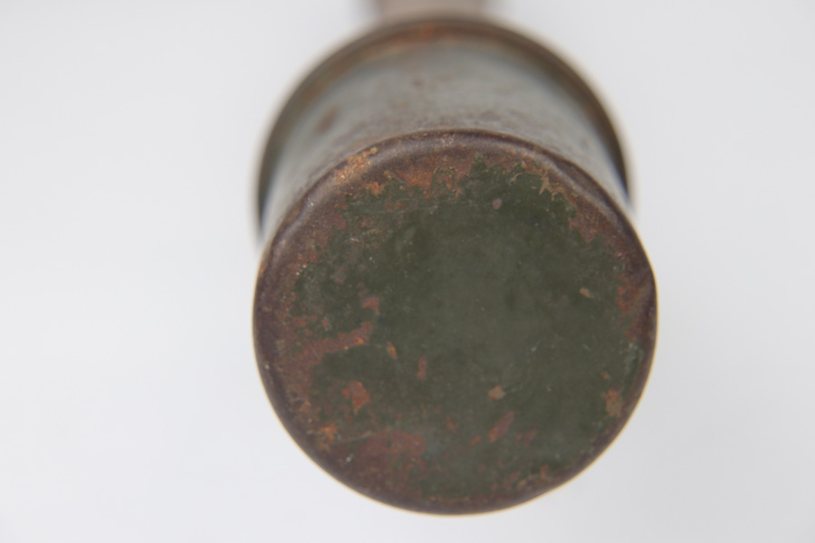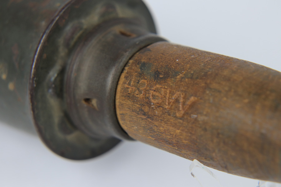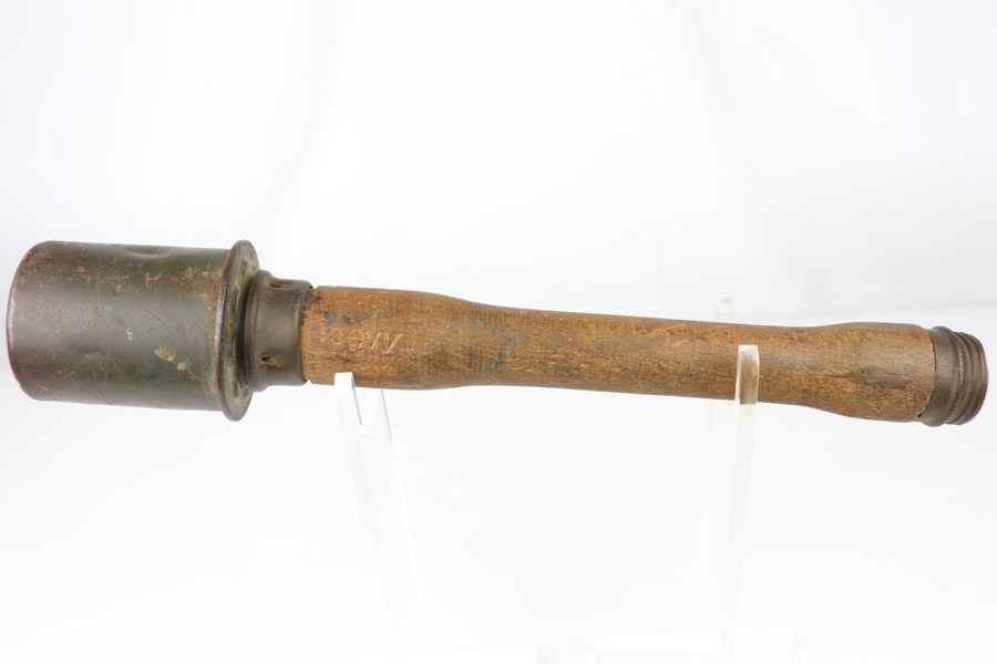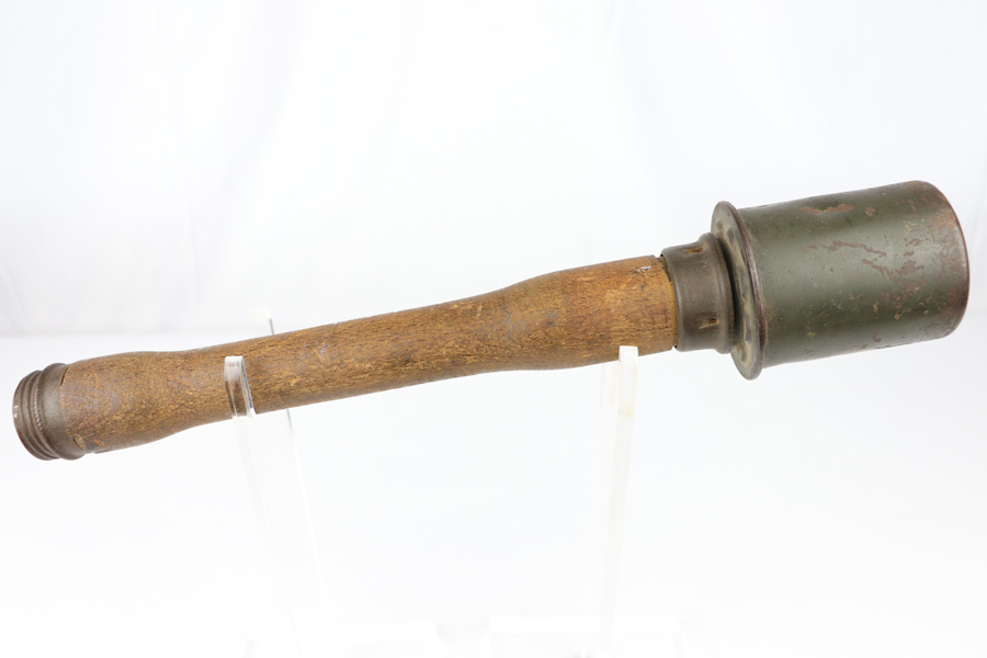 10/29/18 – This is an original WW2 production German grenade that has been decommissioned. The grenade top screws off and is empty inside. The base metal cap at the bottom of the wood handle pops off and is empty as well (no string inside). The metal has some light rust / discoloration on the base. The green painted top metal is mostly in tact but there are a few small dents and spots of rust. The wood handle is excellent, both maker stamped and ’43 dated. Guaranteed original and authentic.
