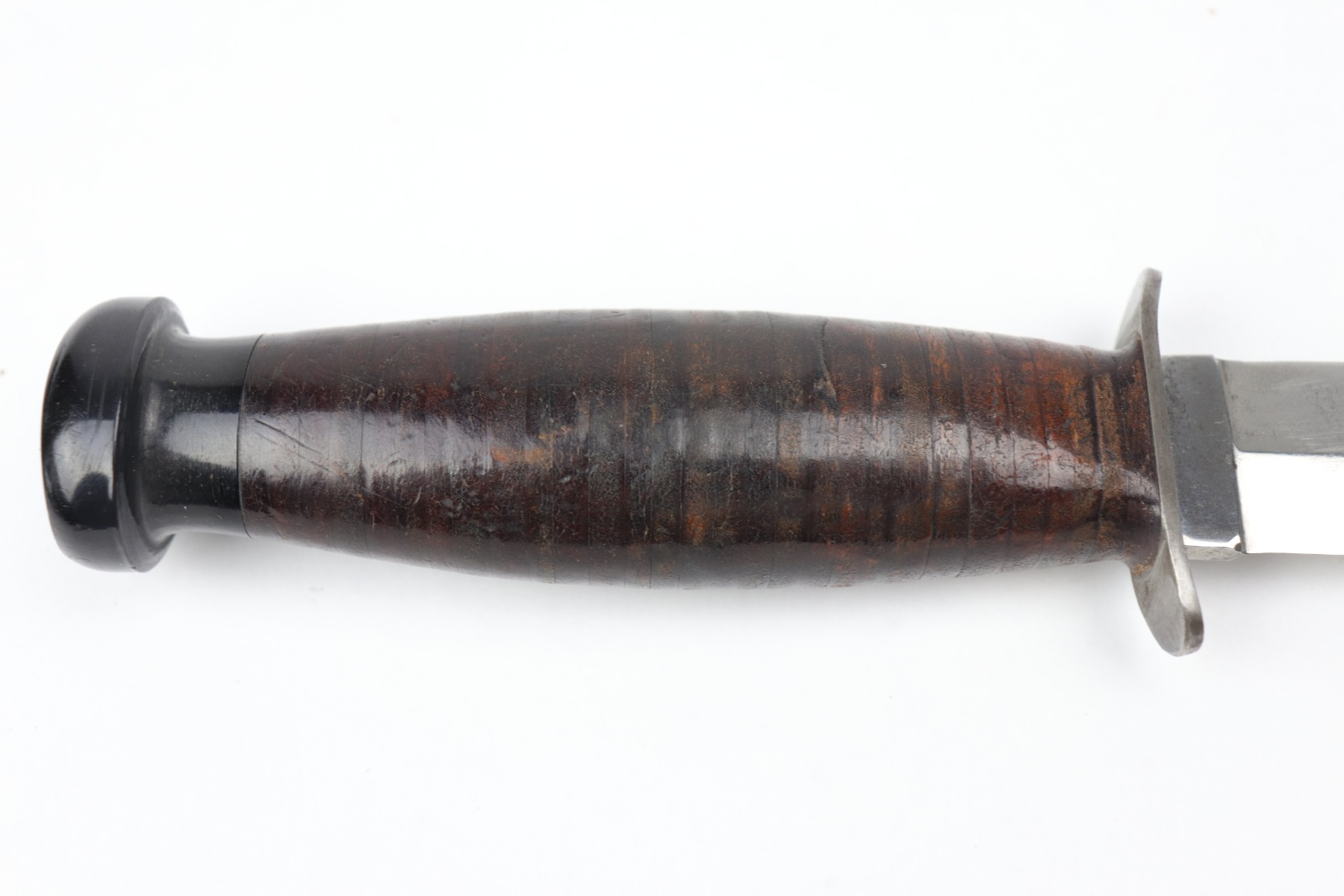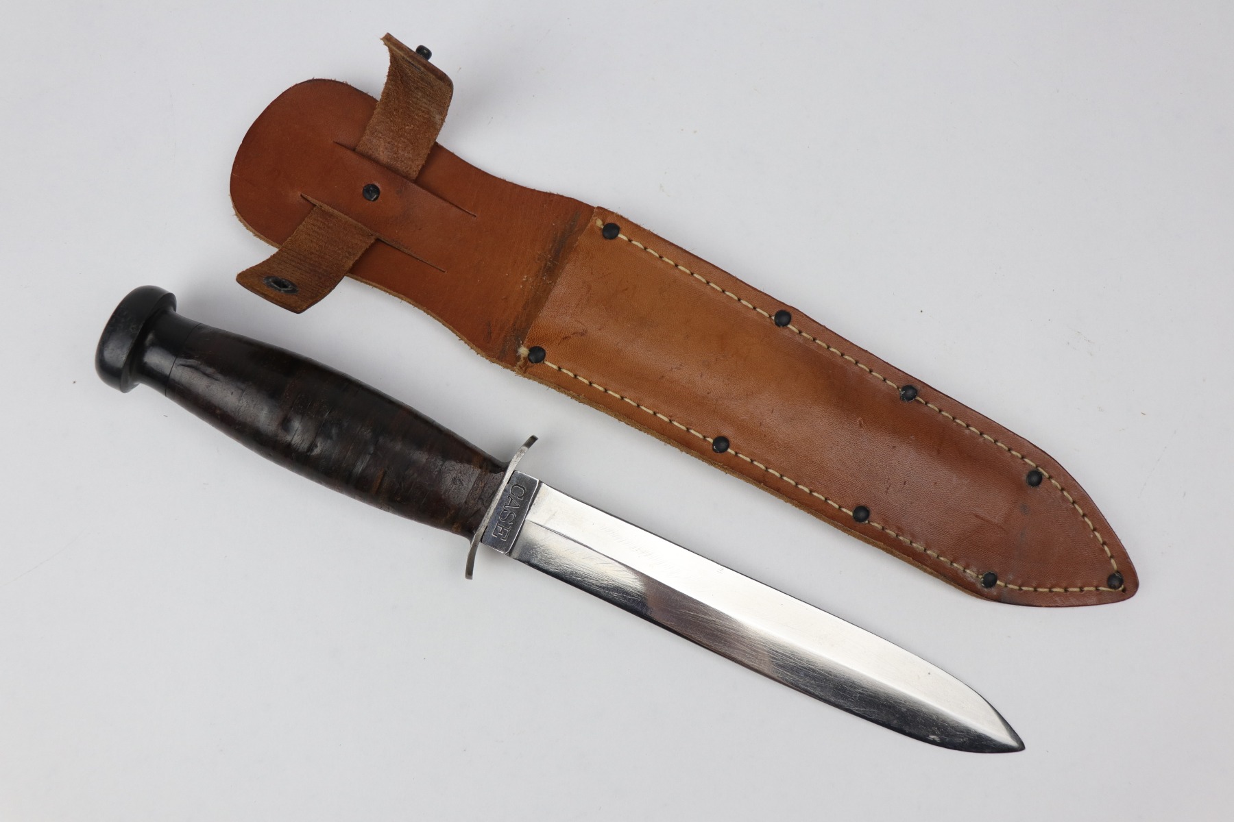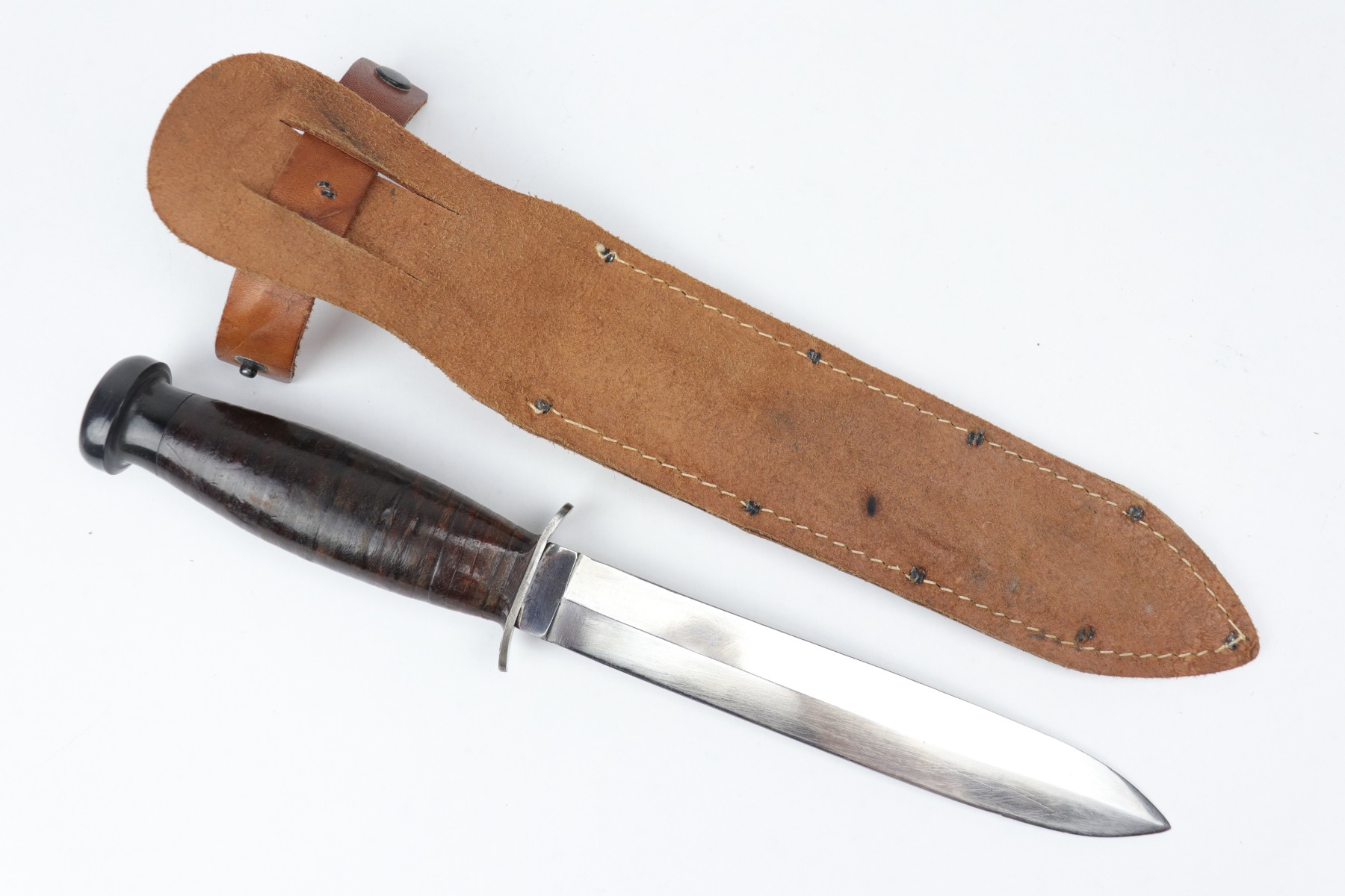 9/15/20 – This is a near mint, very scarce U.S. made Case Stiletto fighting knife. The blade is polished stainless steel which shows some signs of sheath wear. The sheath is original to the knife and stitched leather. These knives were favored by Allied commandos due to their light weight and slim profile.