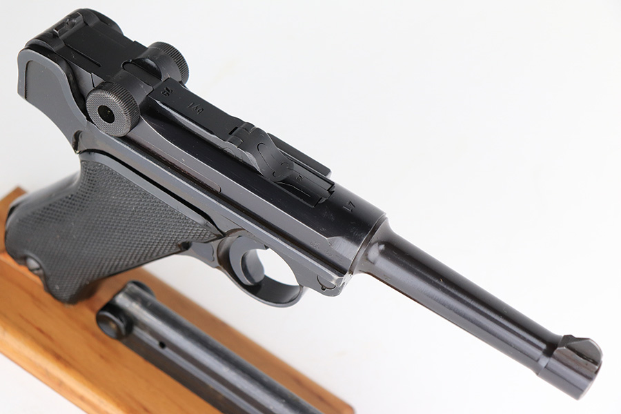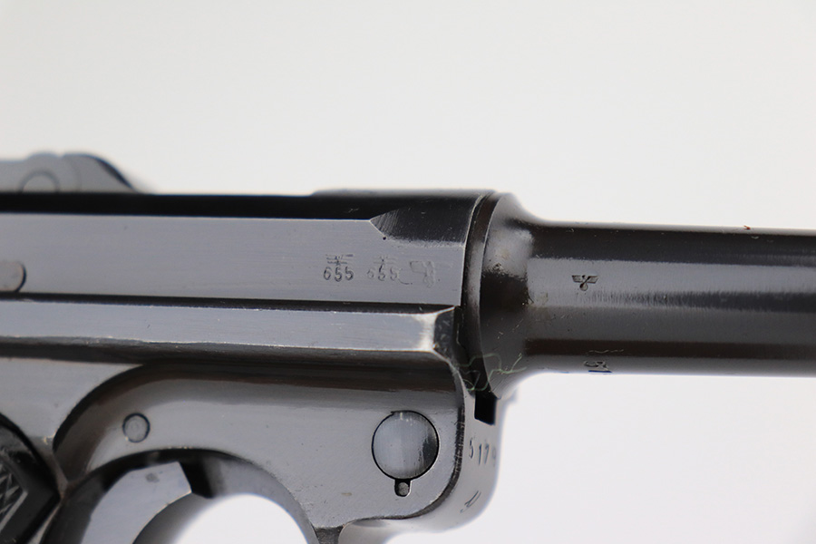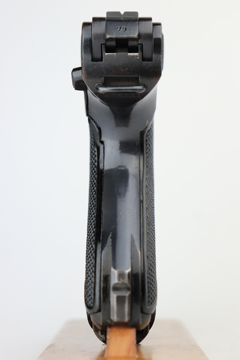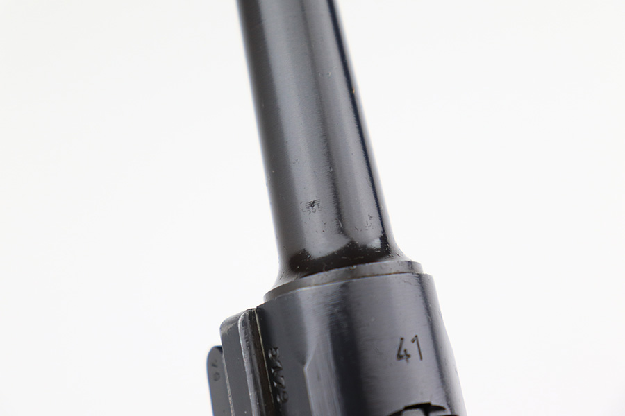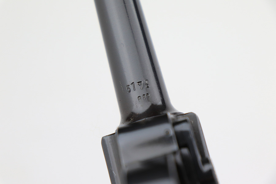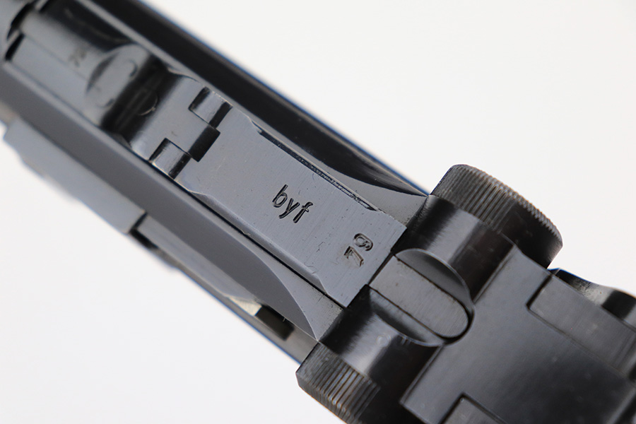 5/19/23 – This is a stunning example of a BYF 41 “Black Widow” Mauser Luger issued to the Nazi military in 1941. It is all matching, has the proper “Eagle 655” military acceptance proofs, and comes fitted with an excellent set of original “Black Widow” bakelite grips – excellent condition, no cracks or chips. Also comes with one original “Black Widow” magazine. The gun itself has retained nearly all of its original finish with just the slightest hints of wear on the side plate and around the muzzle. The bore is shiny with very strong rifling – just some very light freckling here and there.
