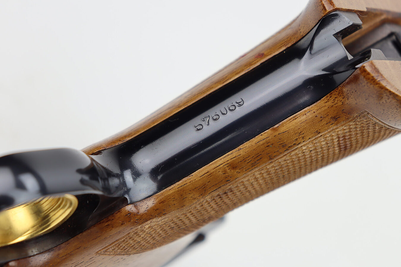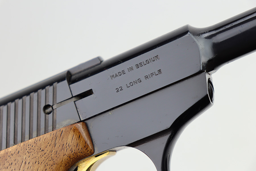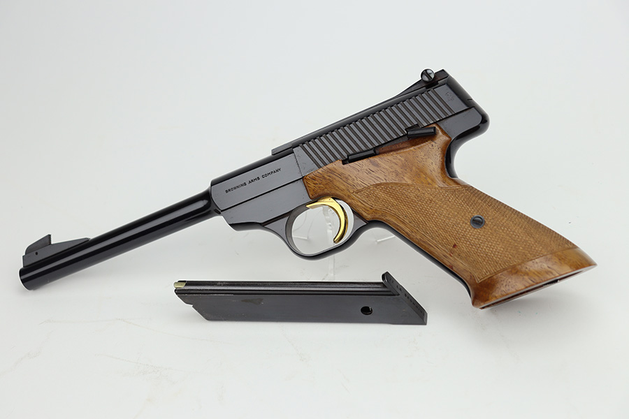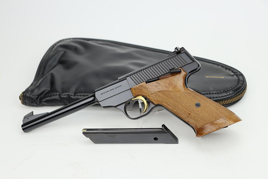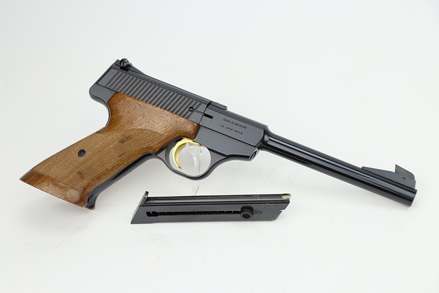 11/13/23 – This is a stunning example of a Browning Challenger, manufactured in 1969 and chambered in .22 LR. Made in Belgium. The gun is like-new with no signs of wear or use. Fitted with beautiful wood grips. Comes with one proper magazine and its original black soft case. Stone-mint bore.