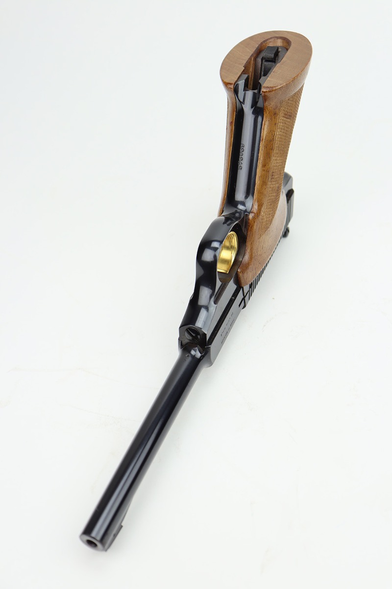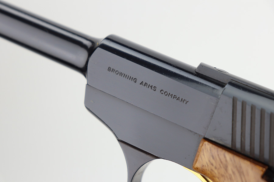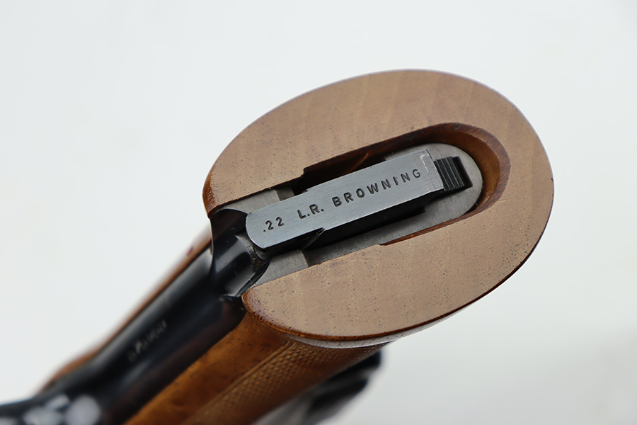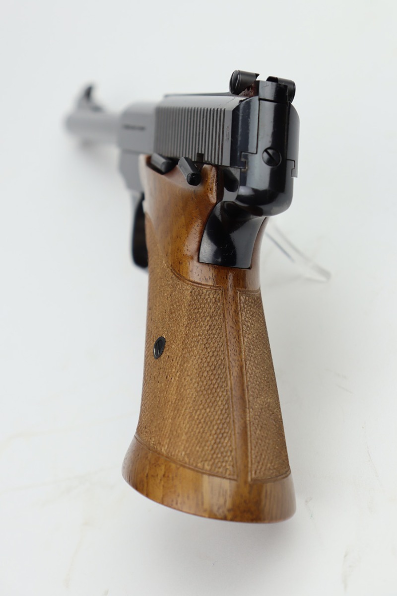 11/13/23 – This is a stunning example of a Browning Challenger, manufactured in 1969 and chambered in .22 LR. Made in Belgium. The gun is like-new with no signs of wear or use. Fitted with beautiful wood grips. Comes with one proper magazine and its original black soft case. Stone-mint bore.