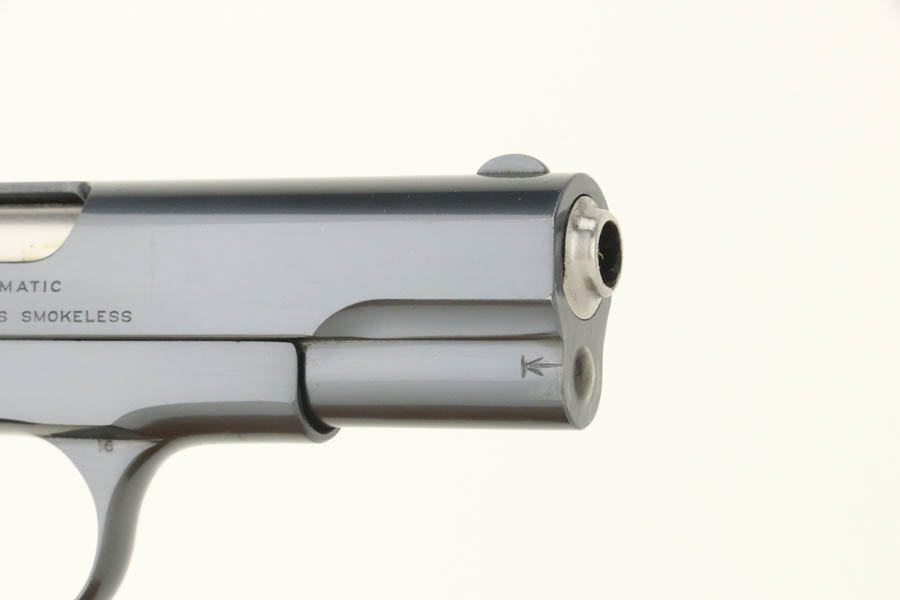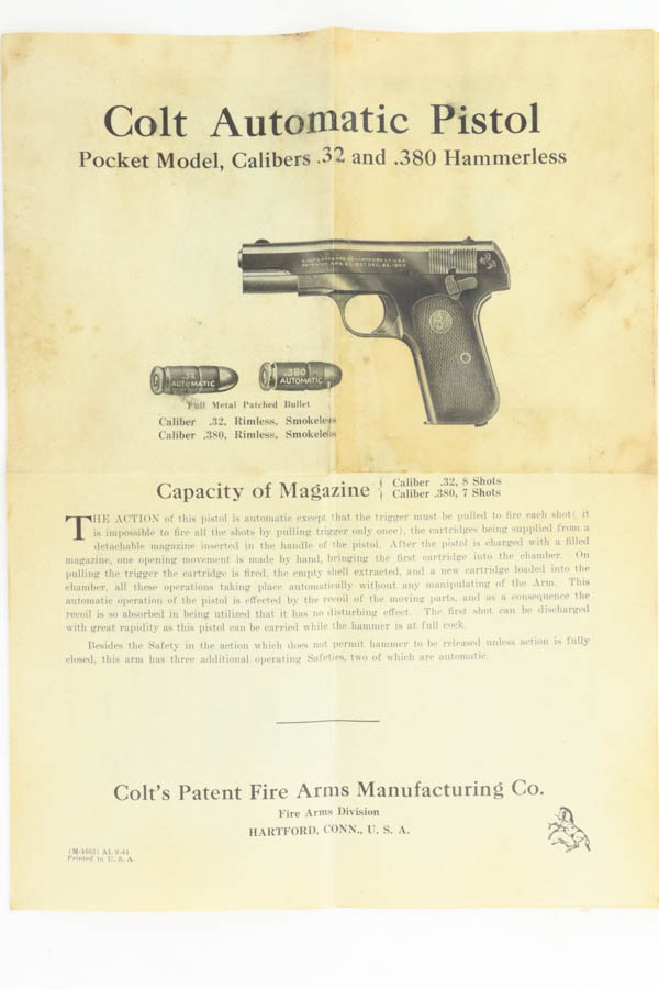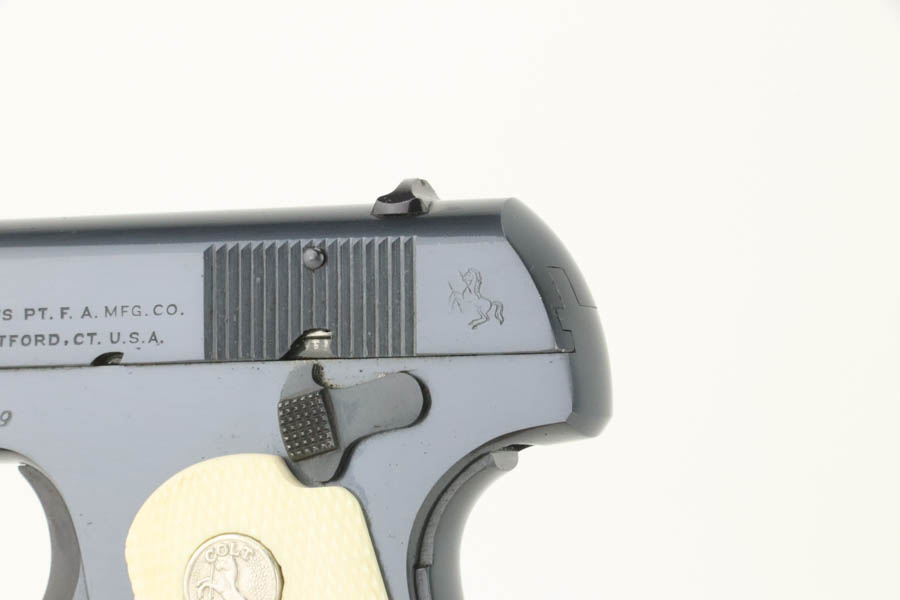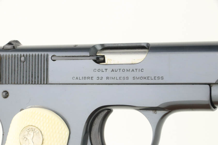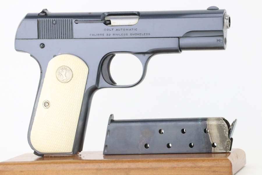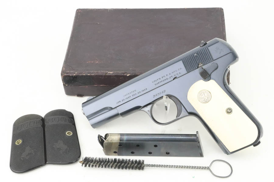 8/8/24 – This is an absolutely stunning example of a Colt Model 1903 Pocket Hammerless, manufactured in 1920 and chambered in .32 ACP. It comes with its original box, spare black hard rubber grips, cleaning brush, one excellent two-tone magazine, and owners manual. The box is matching-numbered on the bottom, but the numbering is very faint. The gun itself is in gorgeous, like-new condition with essentially no signs of wear or use. Factory-new bore. Fitted with ivory-colored plastic grips.
