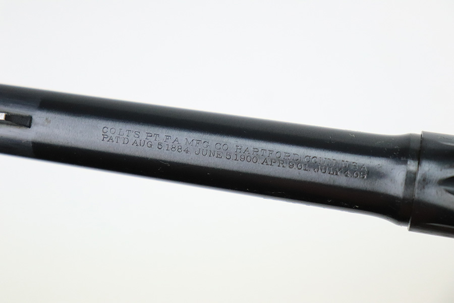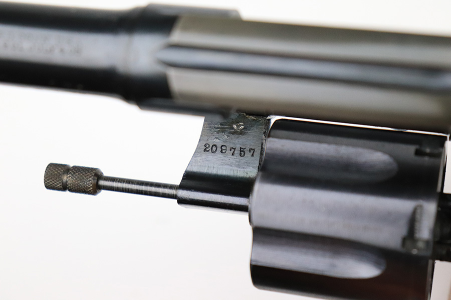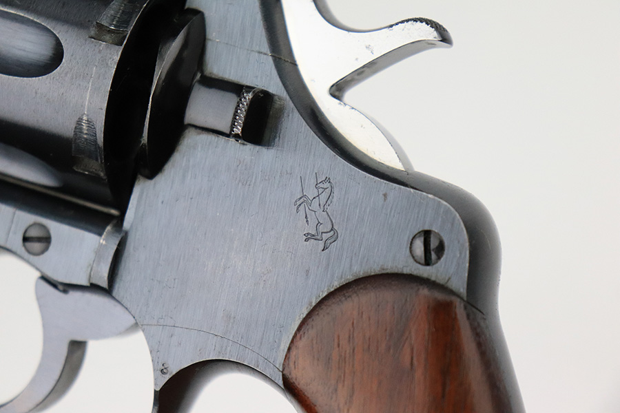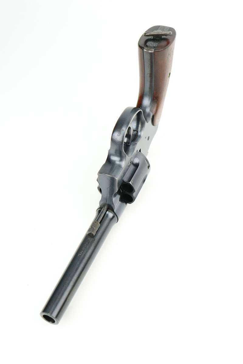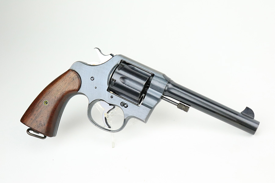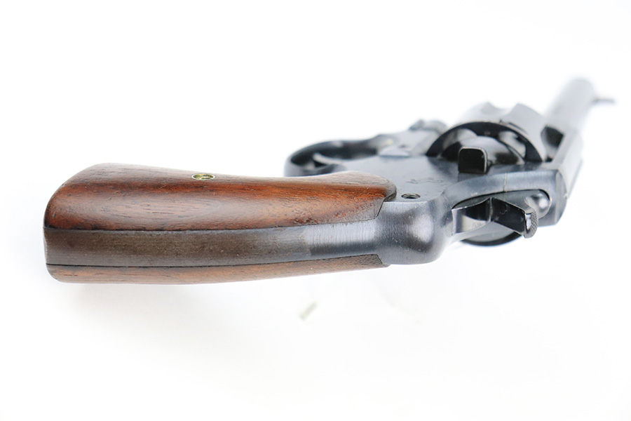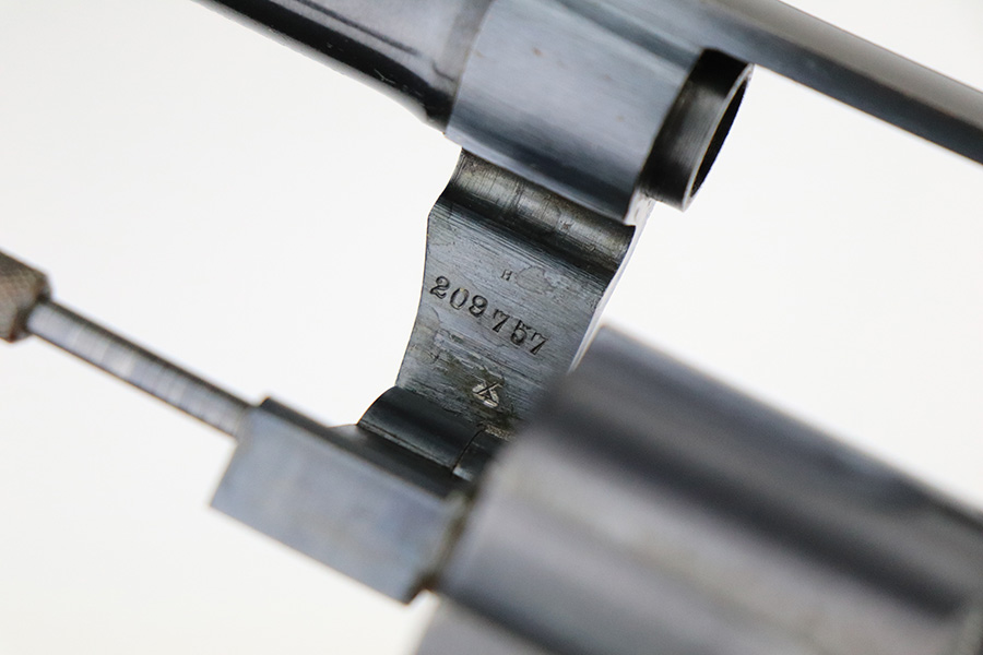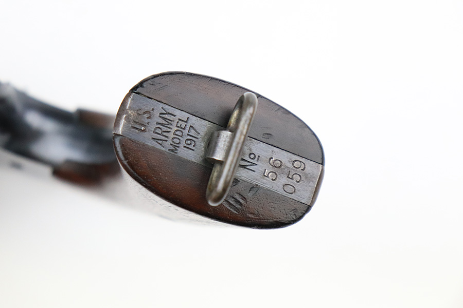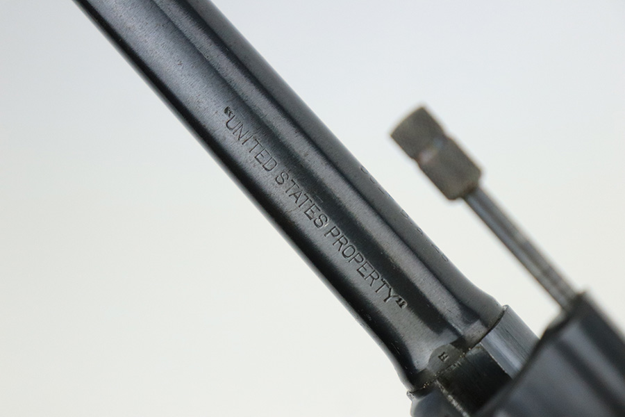 7/7/22 – This is a stunning example of a Colt Model 1917 revolver issued to the US military during WW1. It is all matching, has the proper military acceptance proof on the left side of the frame, and is “United States Property” marking on the underside of the slide. The bluing on this gun is exceptional – it is likely the best we’ve ever offered. While there is next-to-no actual finish loss, there are some areas of light freckling here and there, most noticeable along the barrel. Comes with excellent matching-numbered wood grips. The bore is stone-mint.
