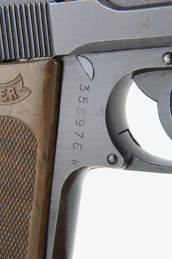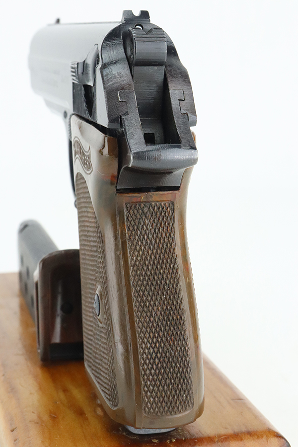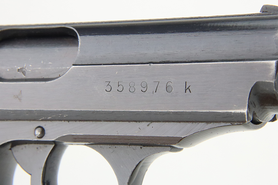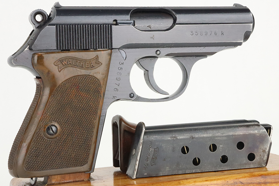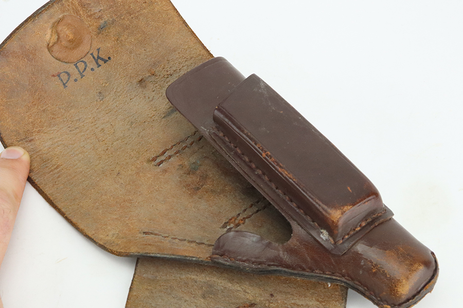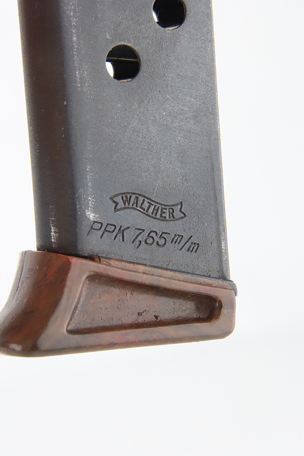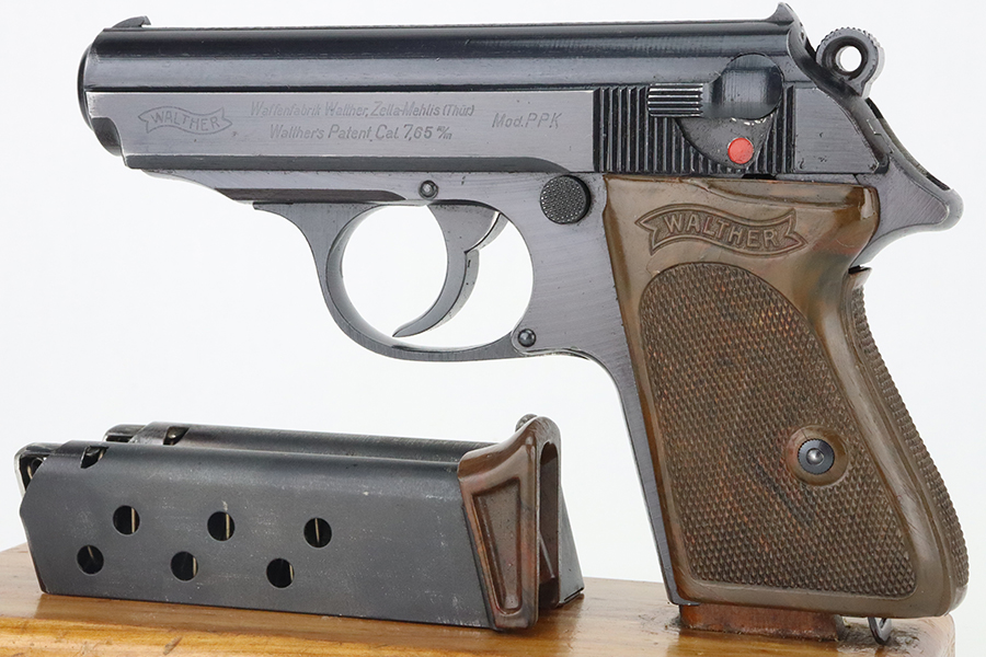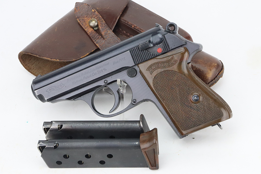4/5/24 – This is a stunning example of a Walther PPK sold in the commercial market in 1942. All matching and “Eagle N” proofed. It comes as a rig with a brown leather holster (“PPK” ink stamp on the inside), a finger extension magazine, and one flat-bottom magazine. The gun has retained nearly all of its original wartime finish with just a hint of muzzle wear. Fitted with an excellent brown grip. Stone-mint bore.