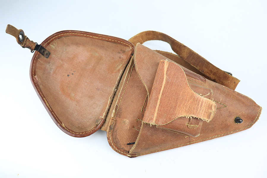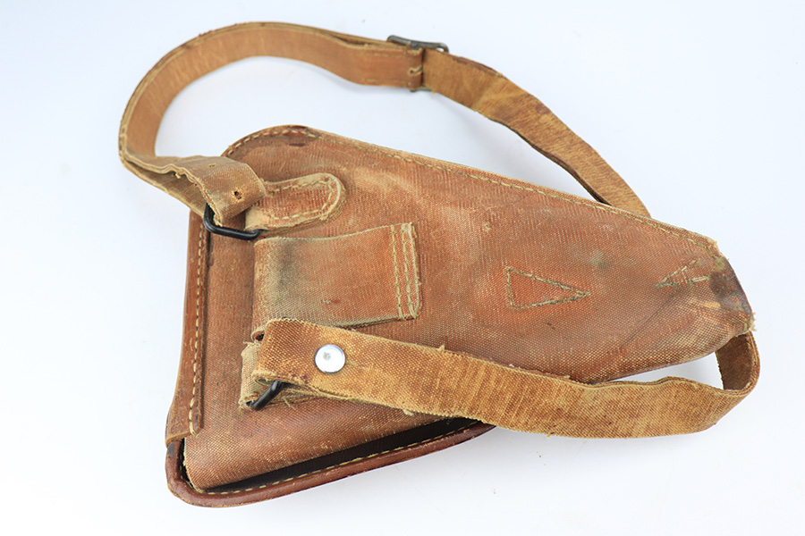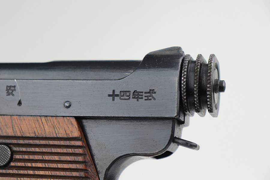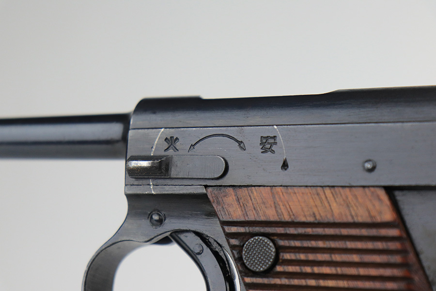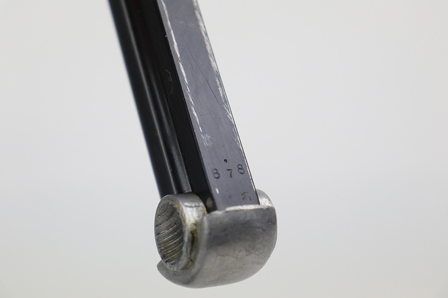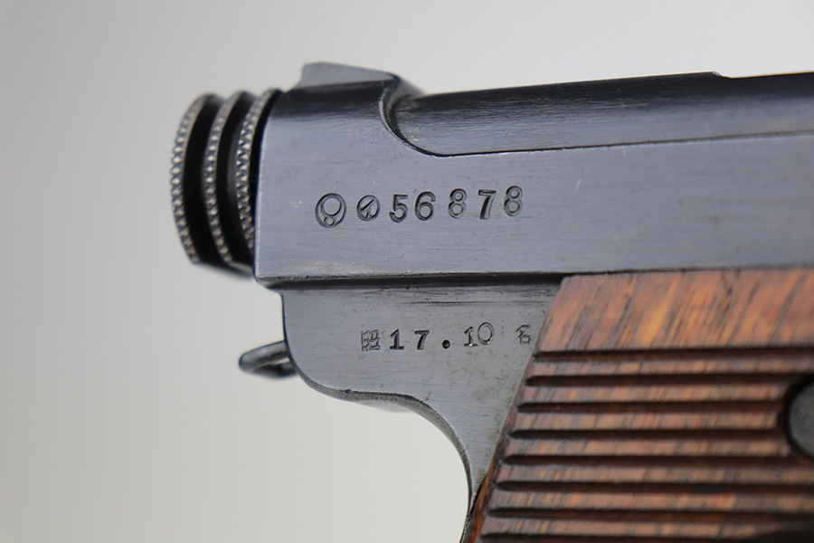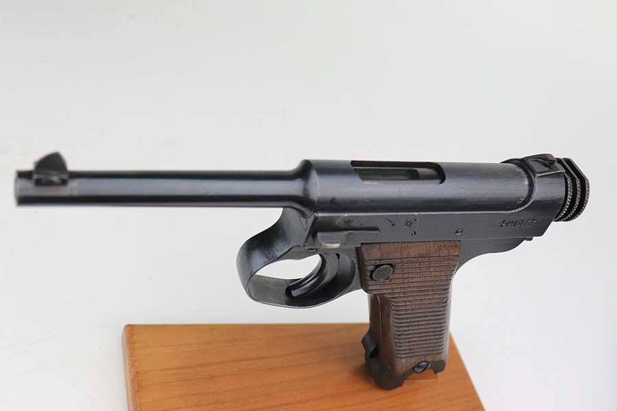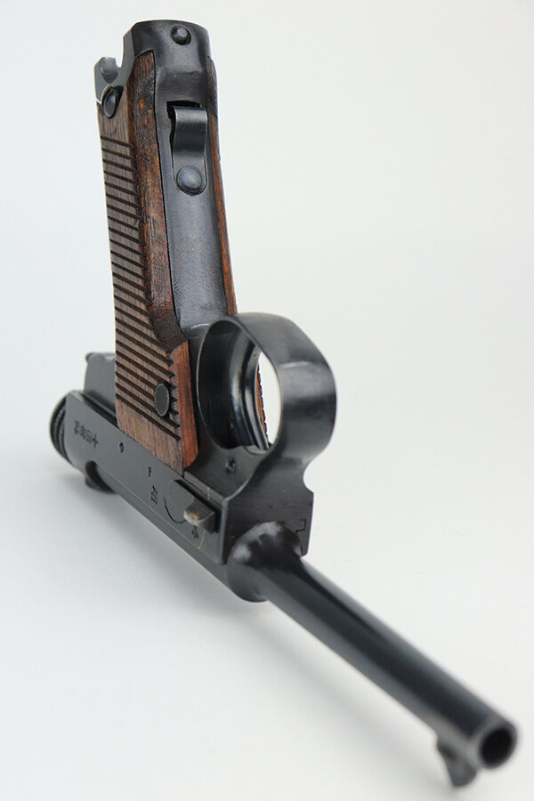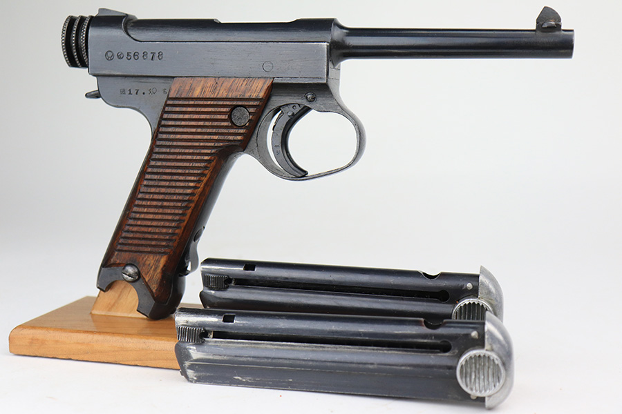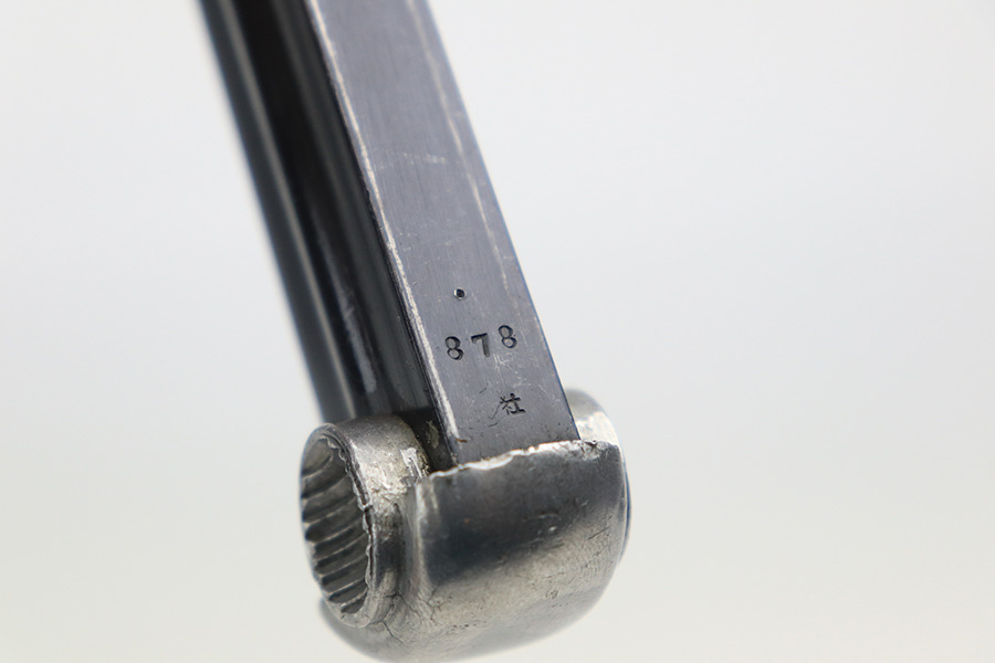 12/9/21 – This is a stunning example of a complete Nambu Type 14 Rig issued to the Japanese military in October of 1943. It comes as a complete rig with a very nice hard rubber holster (with shoulder strap intact), spare firing pin, cleaning rod, reproduction lanyard, and two original matching-numbered magazines. The gun itself is gorgeous – all matching and has retained virtually all of its original bluing. There is just a hint of wear on the underside of the trigger guard. Comes with mint wood grips – the left panel is un-numbered, the right panel is numbered and matching. The bore is like-new. Both magazines are matching numbered to the pistol, but have different arsenal markings on them. Neither magazine has been renumbered, so maybe a previous collector was able to find a second with the same number.