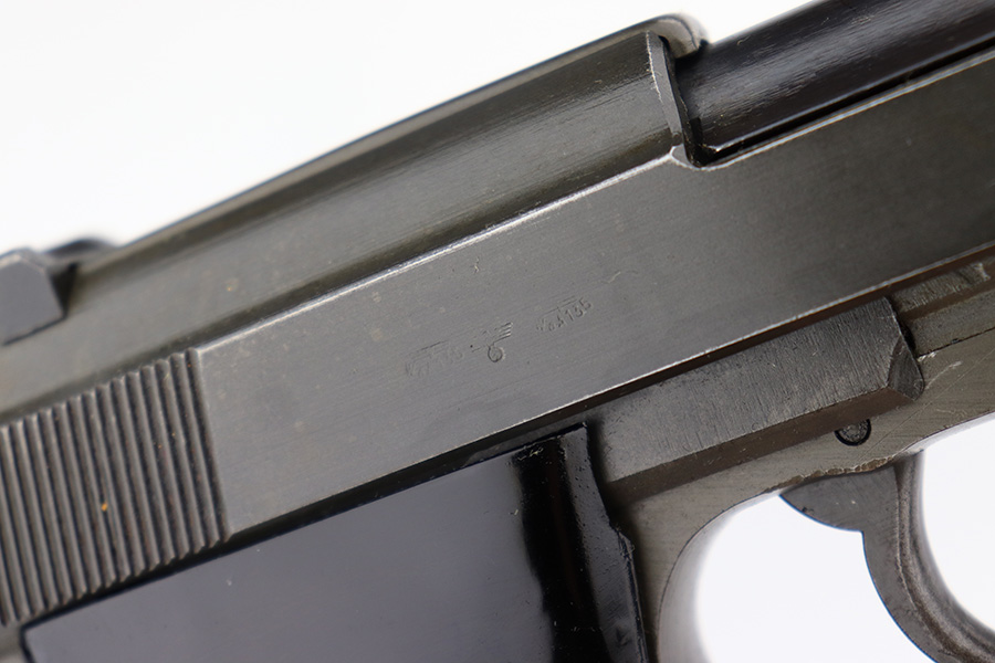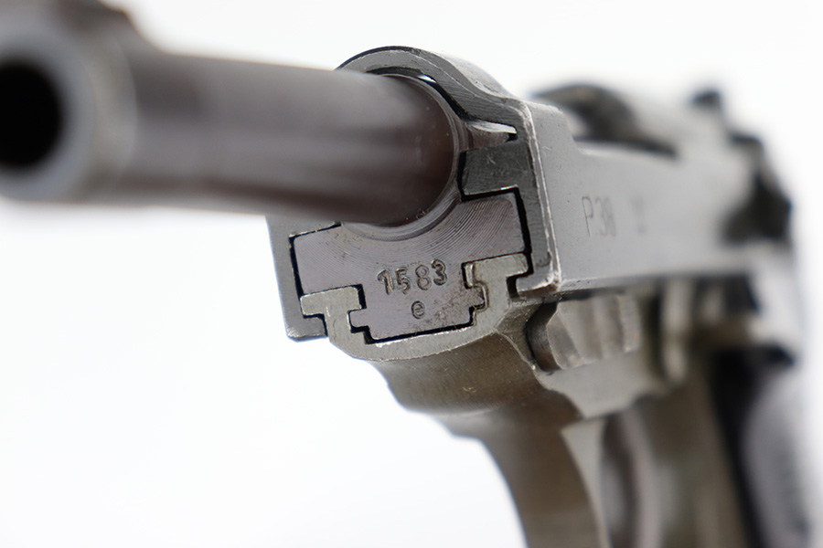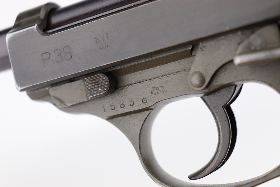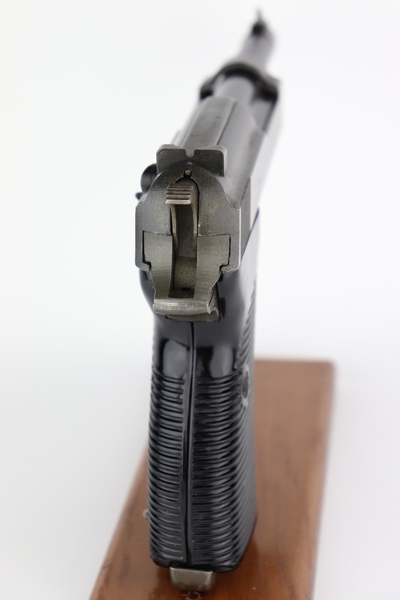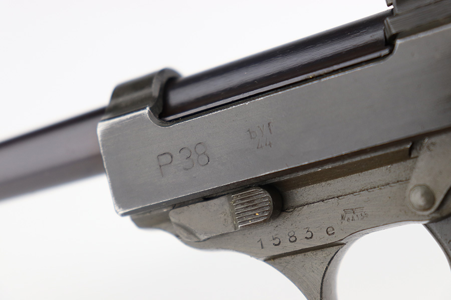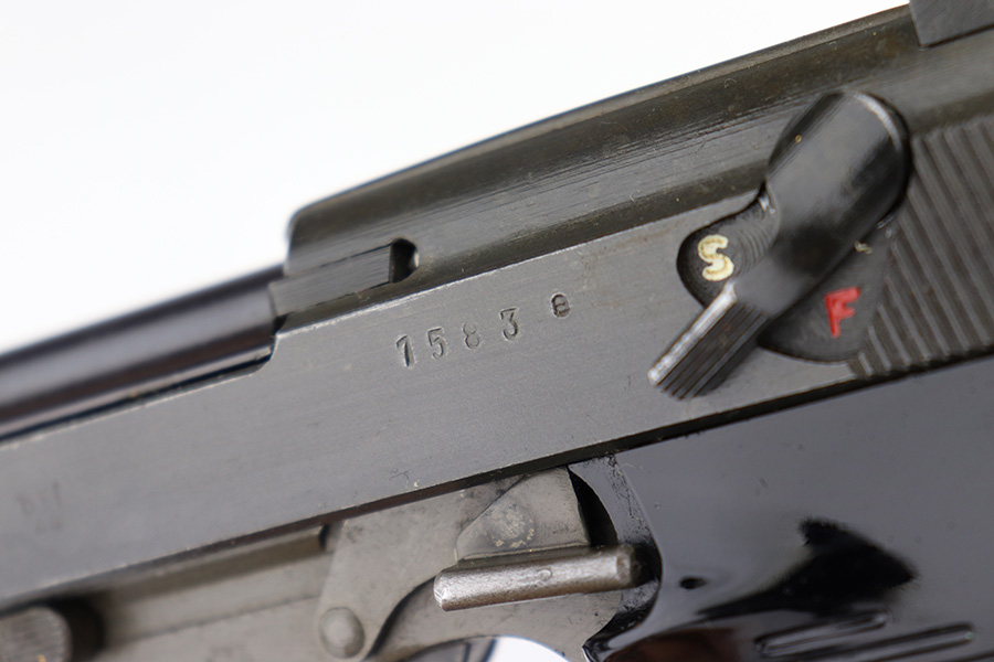 11/22/22 – This is a stunning example of an all matching and original Mauser P.38 with phosphate finish on slide and frame. It has a blued barrel and rear sight, creating the “dual-tone” look that collectors like. Krutzek’s P.38 book estimates 18,000 were produced, and while the slide has a ’44 date, many were completed several months into 1945. They have a rougher, sometimes “splotchy” finish but this one shows almost no wear. There are just hints of wear around the muzzle and very front edges of the slide. Comes with excellent period-correct black plastic Mauser grips and one P.38v magazine. The bore is factory-new. De-cocker is functional.