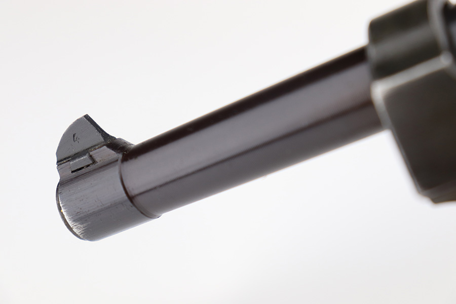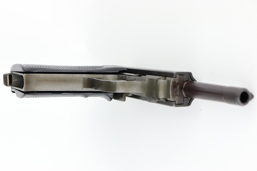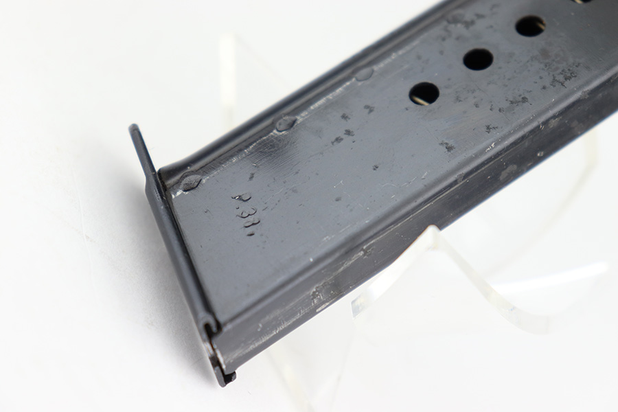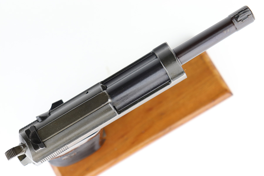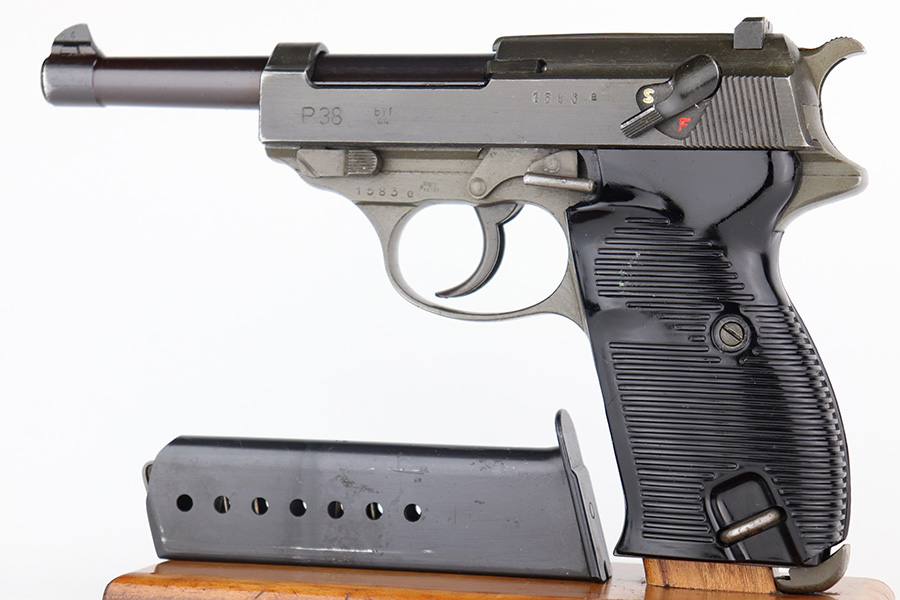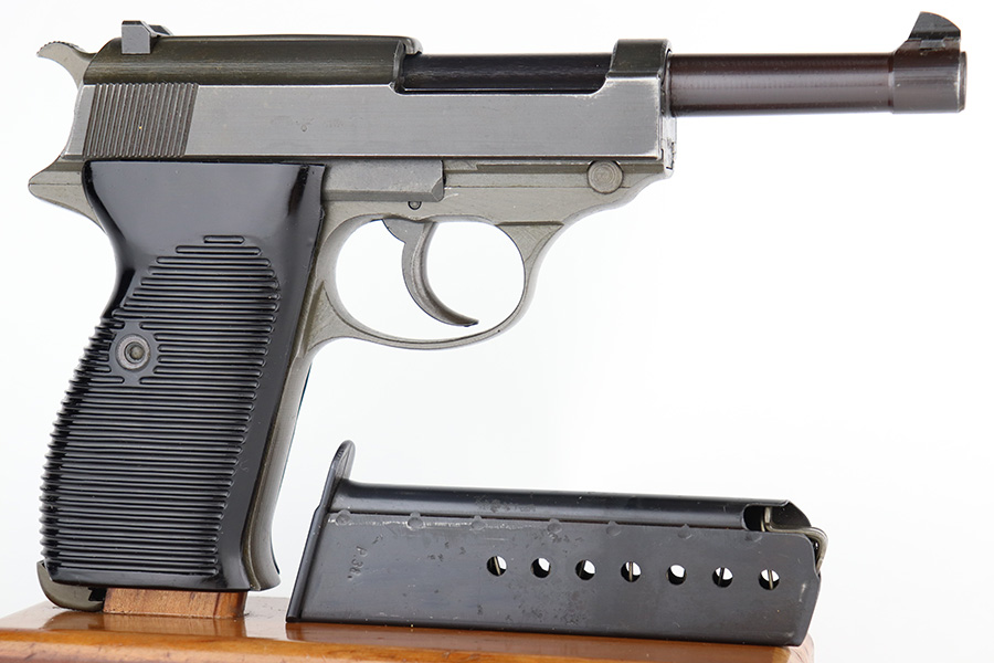 11/22/22 – This is a stunning example of an all matching and original Mauser P.38 with phosphate finish on slide and frame. It has a blued barrel and rear sight, creating the “dual-tone” look that collectors like. Krutzek’s P.38 book estimates 18,000 were produced, and while the slide has a ’44 date, many were completed several months into 1945. They have a rougher, sometimes “splotchy” finish but this one shows almost no wear. There are just hints of wear around the muzzle and very front edges of the slide. Comes with excellent period-correct black plastic Mauser grips and one P.38v magazine. The bore is factory-new. De-cocker is functional.