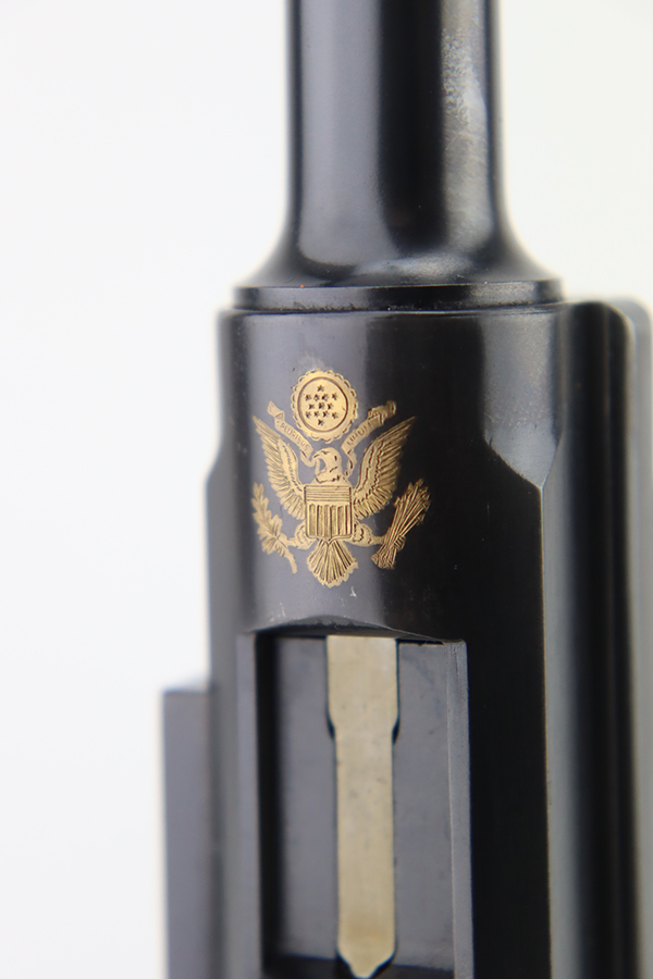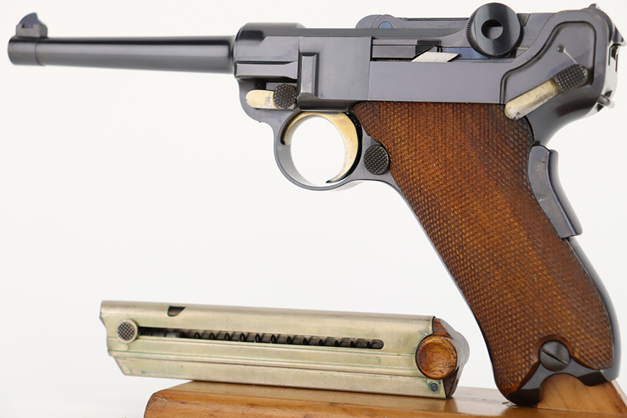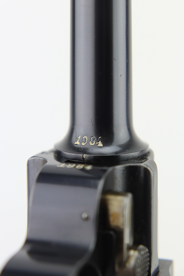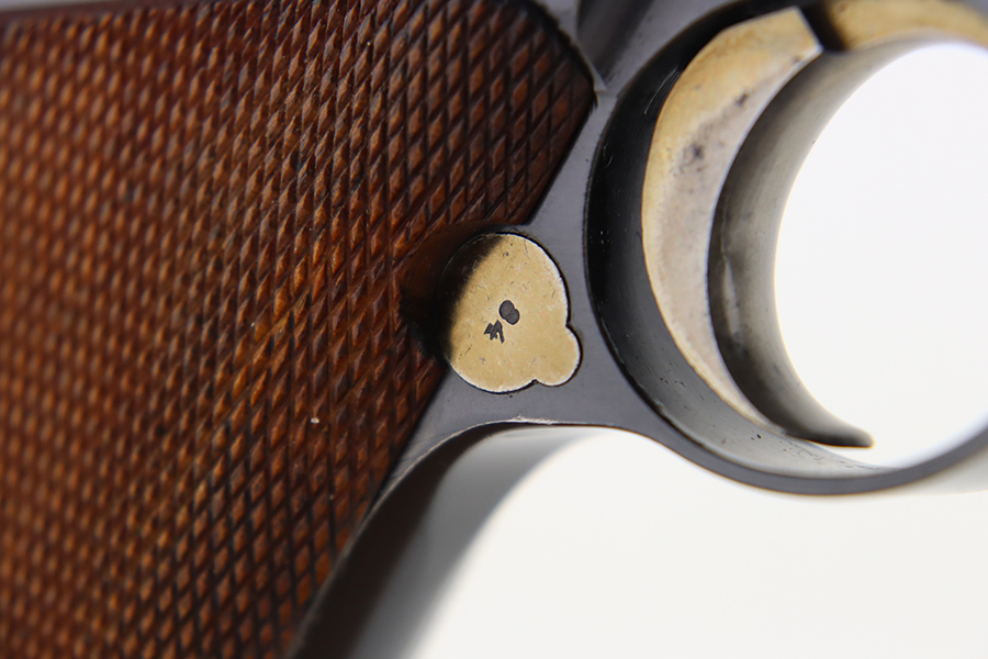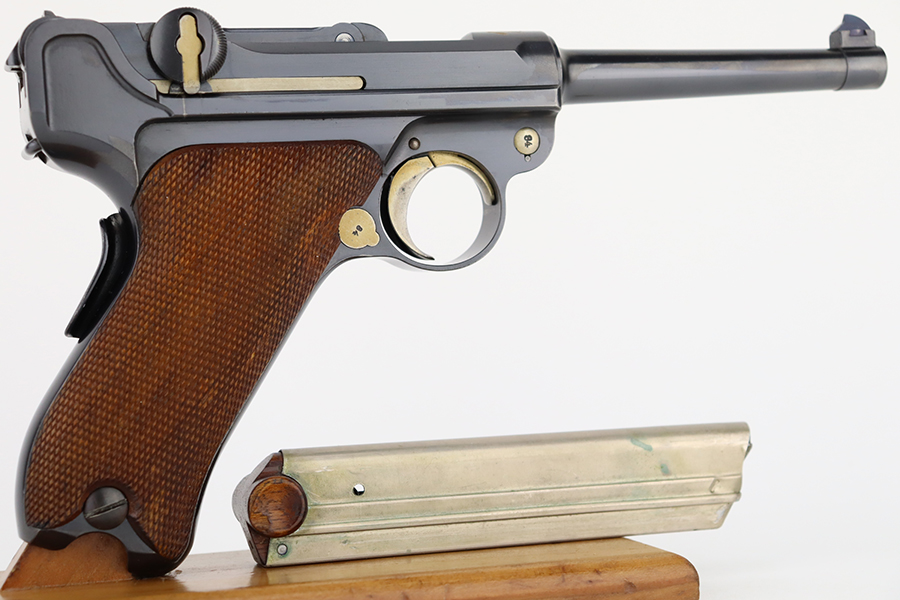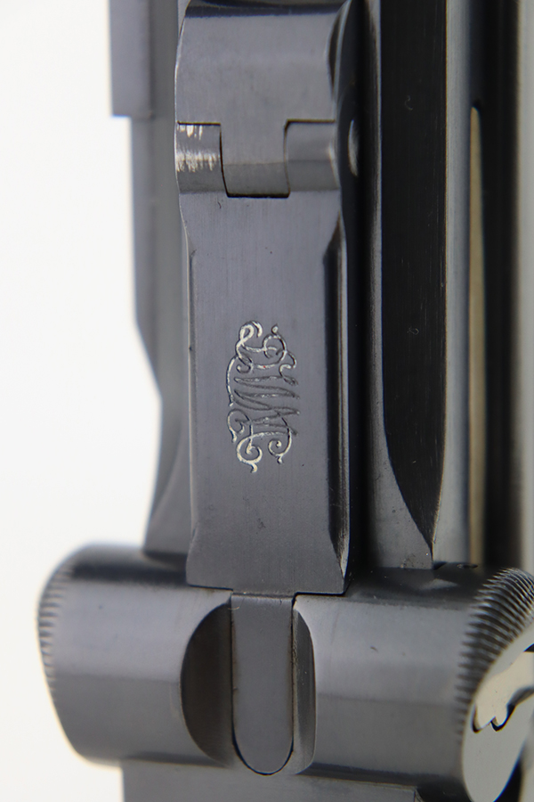 3/26/24 – This is an absolutely stunning example of a DWM “American Eagle” Model 1900 Luger, chambered in .30 Luger. All matching with the proper American Eagle seal on the chamber. The gun is in beautiful, like-new condition with no signs of wear or use. Excellent straw-colored finish on the small parts. Fitted with beautiful matching-numbered wood grips. Like-new bore. What makes this gun interesting is, while it is not in the accepted serial number range for the original army test Lugers, it has some of the test Luger characteristics – the takedown lever and mag release button are externally numbered, and there are tiny military flaming bomb proofs on the inside of the frame and on the base of the magazine. Both markings appear to be original. Of course, given the serial number discrepancy, we cannot say for sure. NOTE: James Julia sold this pistol in 2008 with the upper described as “a factory quality restored finish that could pass as original”. We believe the finish is original but happy to provide additional photos upon request. The American Eagle has been filled with gold leaf, likely post-factory.