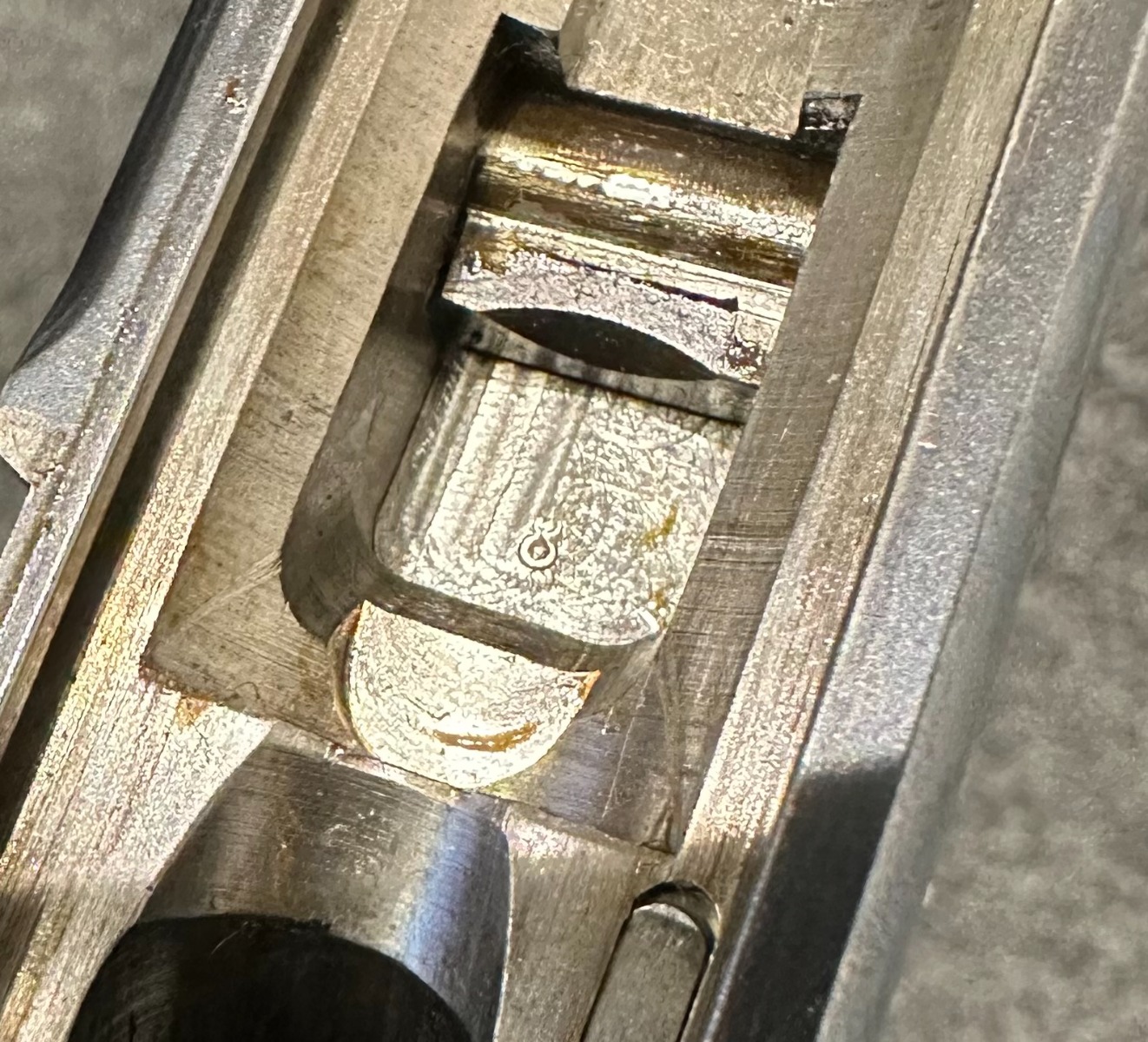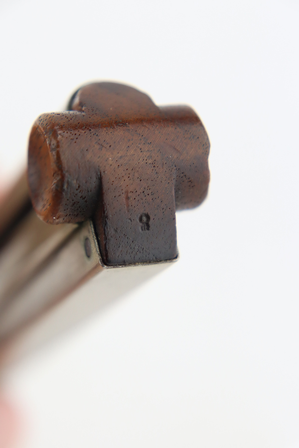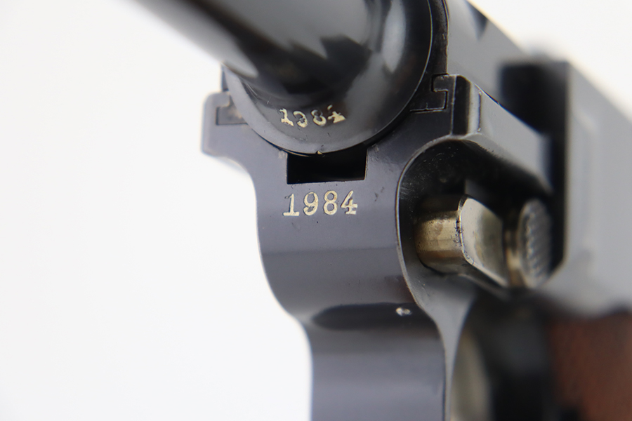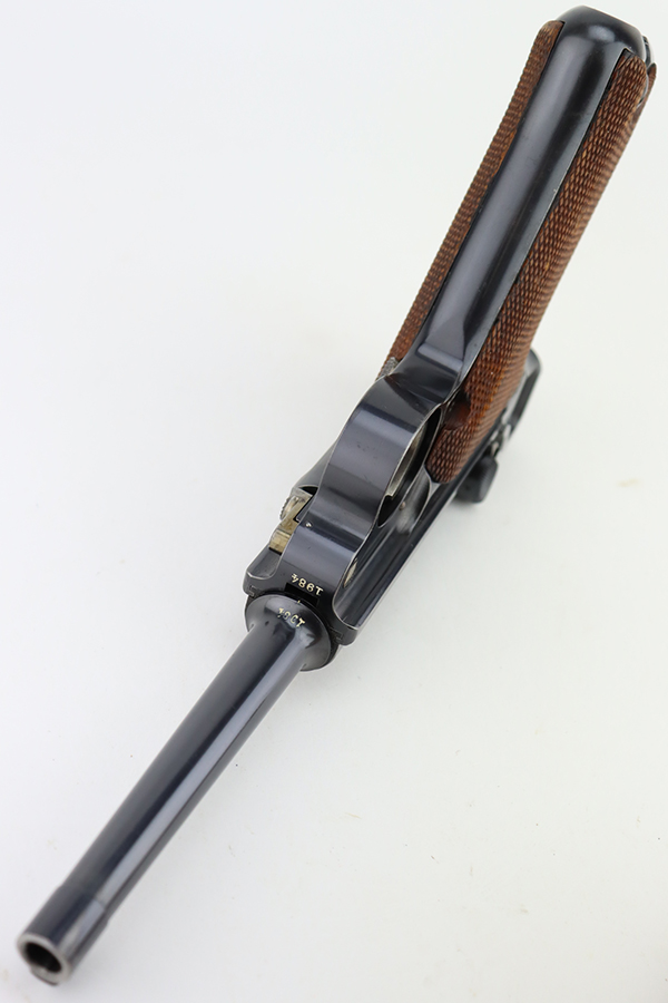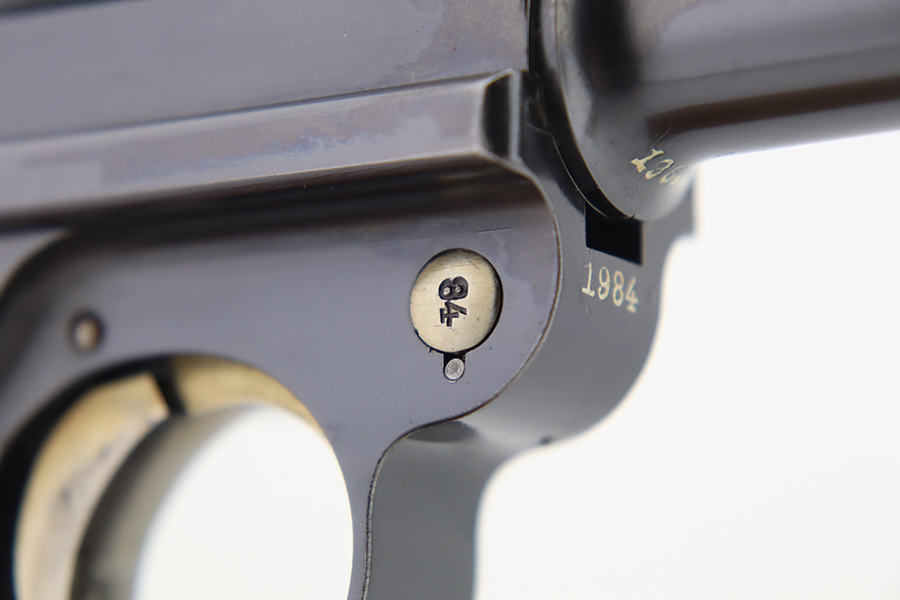 3/26/24 – This is an absolutely stunning example of a DWM “American Eagle” Model 1900 Luger, chambered in .30 Luger. All matching with the proper American Eagle seal on the chamber. The gun is in beautiful, like-new condition with no signs of wear or use. Excellent straw-colored finish on the small parts. Fitted with beautiful matching-numbered wood grips. Like-new bore. What makes this gun interesting is, while it is not in the accepted serial number range for the original army test Lugers, it has some of the test Luger characteristics – the takedown lever and mag release button are externally numbered, and there are tiny military flaming bomb proofs on the inside of the frame and on the base of the magazine. Both markings appear to be original. Of course, given the serial number discrepancy, we cannot say for sure. NOTE: James Julia sold this pistol in 2008 with the upper described as “a factory quality restored finish that could pass as original”. We believe the finish is original but happy to provide additional photos upon request. The American Eagle has been filled with gold leaf, likely post-factory.