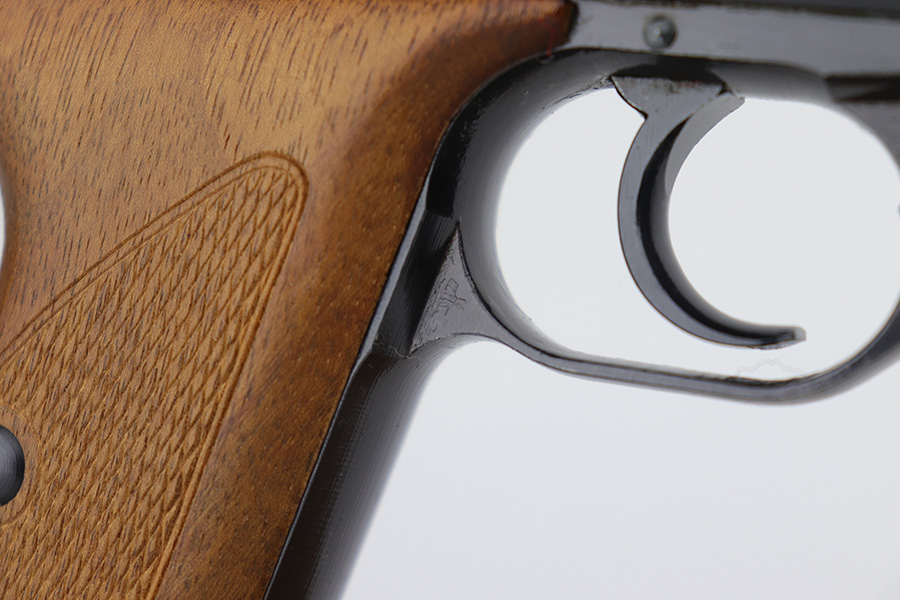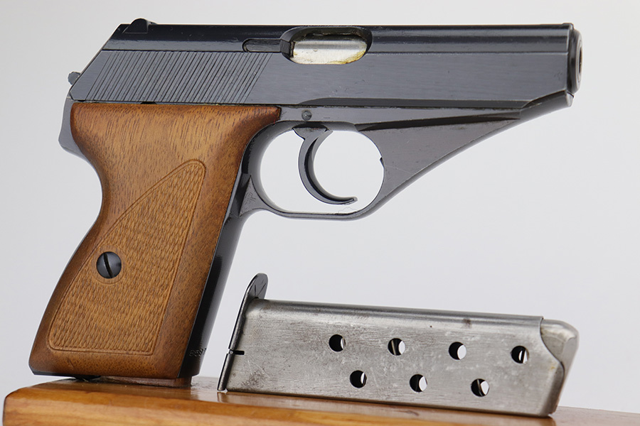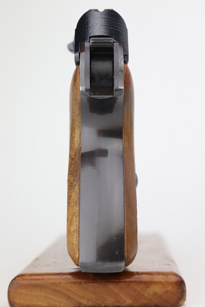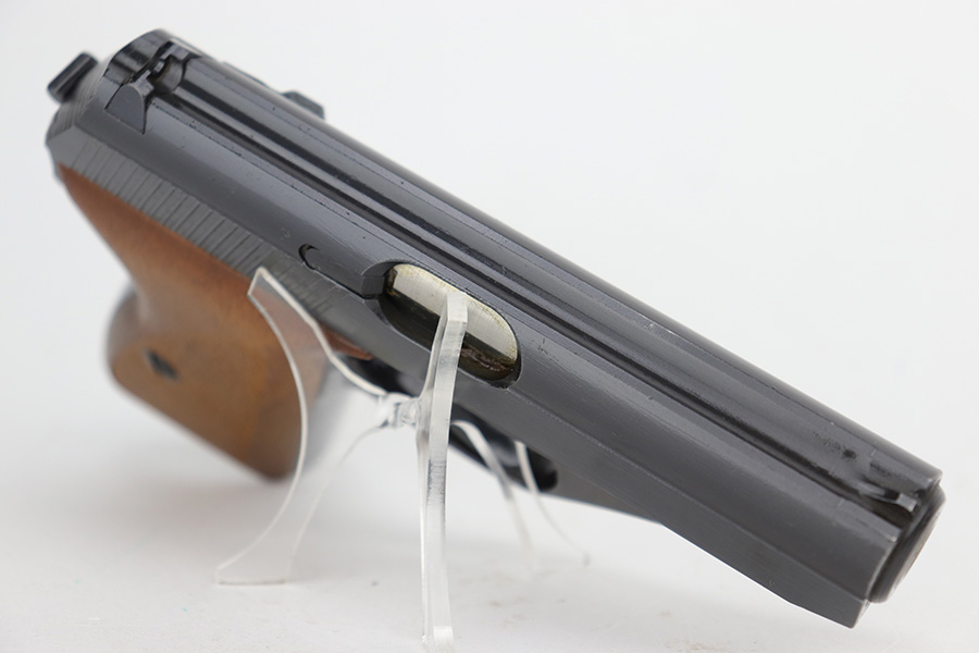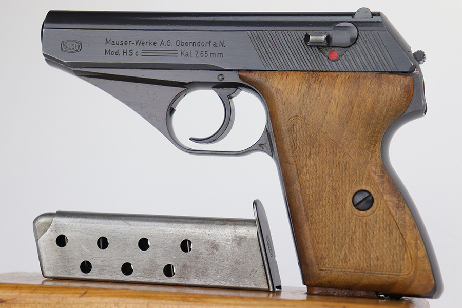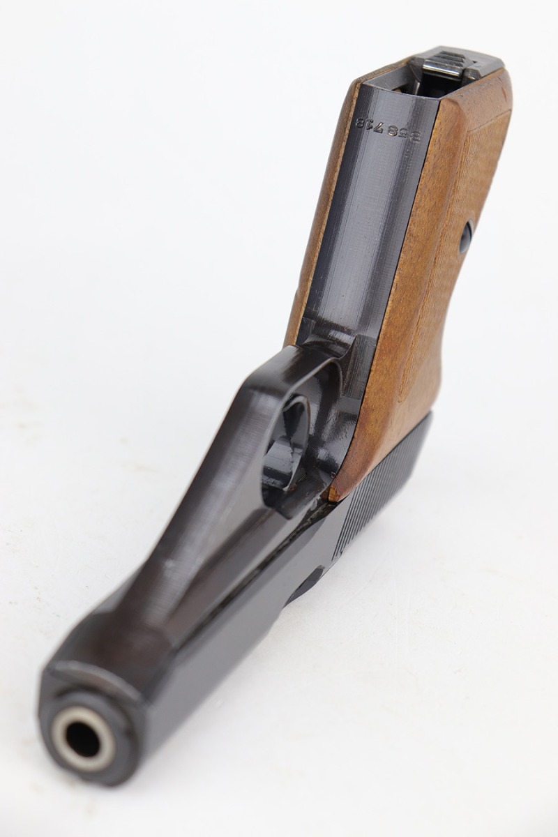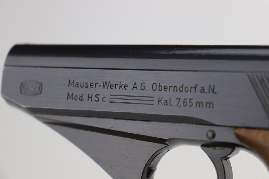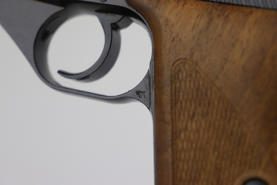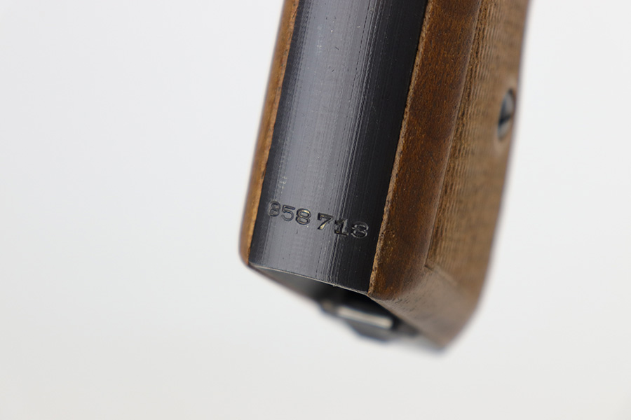 6/7/23 – This is a stunning example of a Mauser HSC issued to the Nazi police force in 1943. It is all matching and has the proper police “Eagle L” marking on the left side of the trigger guard. The gun itself is in mint condition, retaining virtually all of its original finish. There are just a couple of tiny dots of wear on the underside of the frame. Fitted with excellent period-correct wood grips – just a couple of tiny bruises. Comes with one proper magazine. Stone-mint bore.