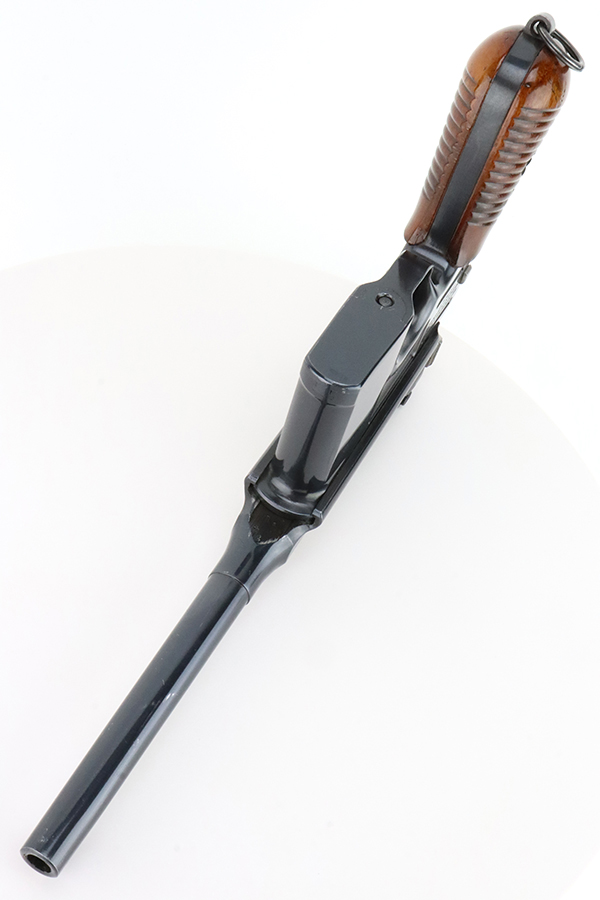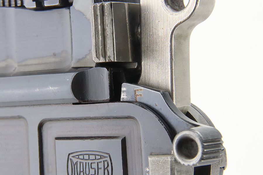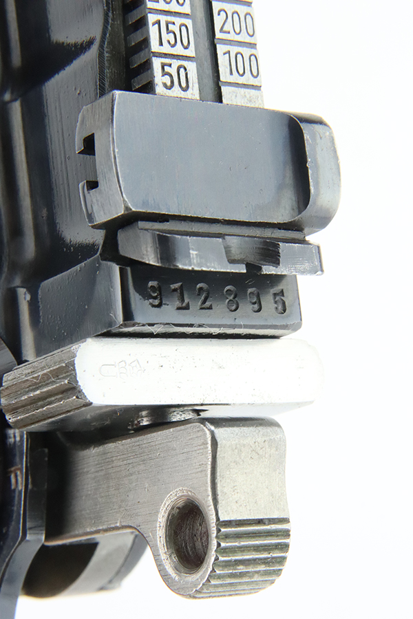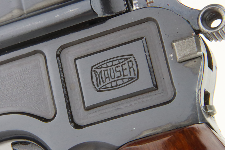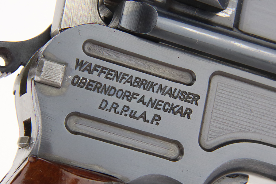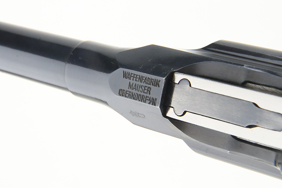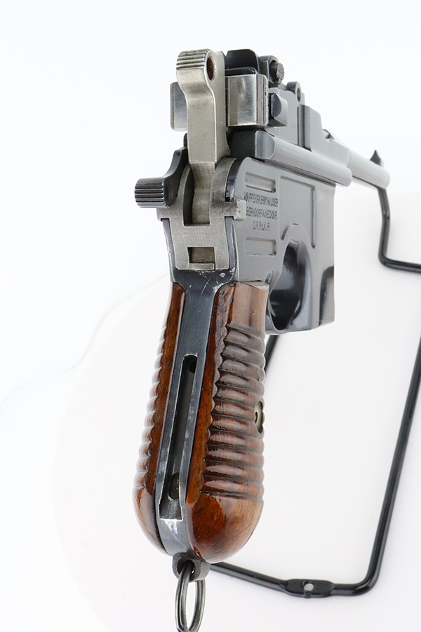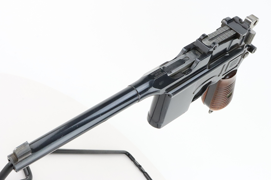 1/31/24 – This is an absolutely stunning example of a commercial Mauser Model 1930 Broomhandle from the 1930’s. This variant appeared in 1930, and was the first C-96 to have a real model designation. Mauser called it the Modell 1930, but the common modern name is the M-30. With the M-30, Mauser dropped the Bolo-sized C-96 for good, and reverted to the standard formula which had dominated throughout the prewar and wartime eras – 10 shot magazine, large grip, long barrel, 1000 meter tangent sight, and grooved walnut grip panels. This particular example comes as a rig with an excellent and correct commercial “Mauser” marked wood stock. The gun itself is gorgeous, retaining virtually all of its original bright blue finish – there is almost no wear to speak of. Fitted with minty un-numbered wood grips. Mint bore.