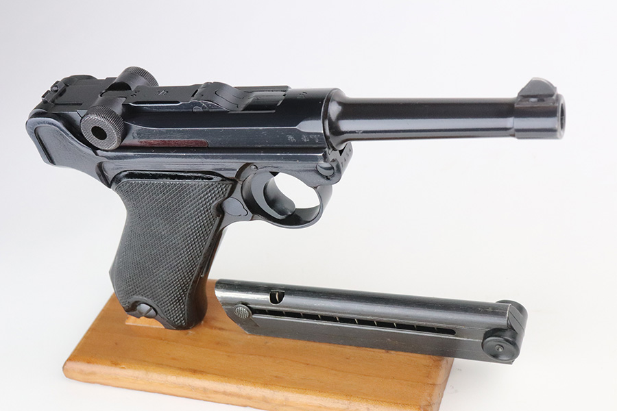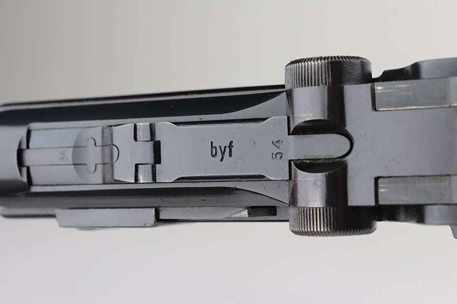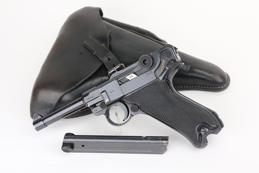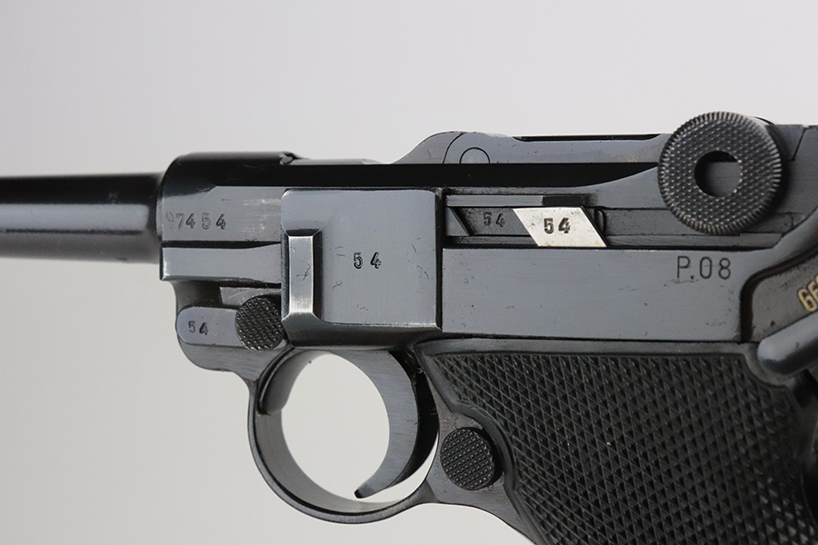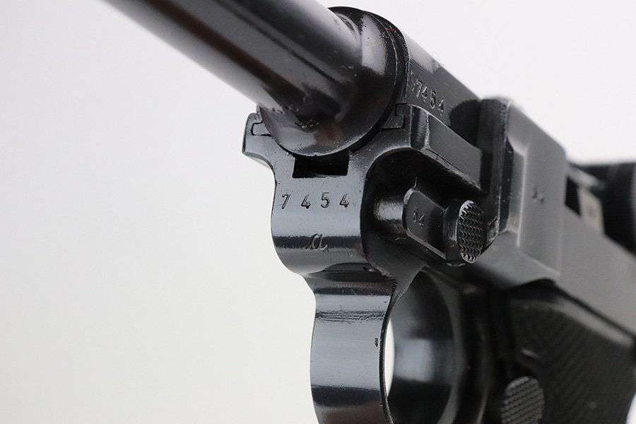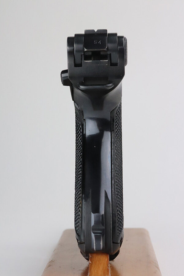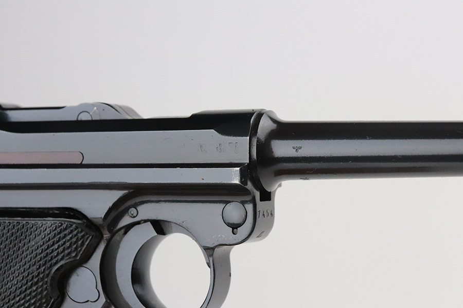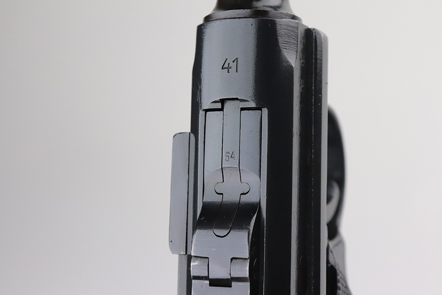 8/2/21 – This is a stunning example of a “Black Widow” Mauser Luger issued to the Nazi military in 1941. It is all matching and has the proper “Eagle 135” military proofs. The rig comes with a nice 1941-dated waffen-proofed holster, an un-marked Luger tool, and two proper black widow magazines. The gun is in near-mint condition, retaining more than 98% of its original finish. There are just the faintest hints of wear on the side plate, the side rails, and around the muzzle. A few very tiny handling marks on the straps. Comes with excellent correct black widow grips. The bore is excellent – shiny with strong rifling and minor frosting in the grooves. Even though not photographed, it does include a Luger tool and spare magazine.