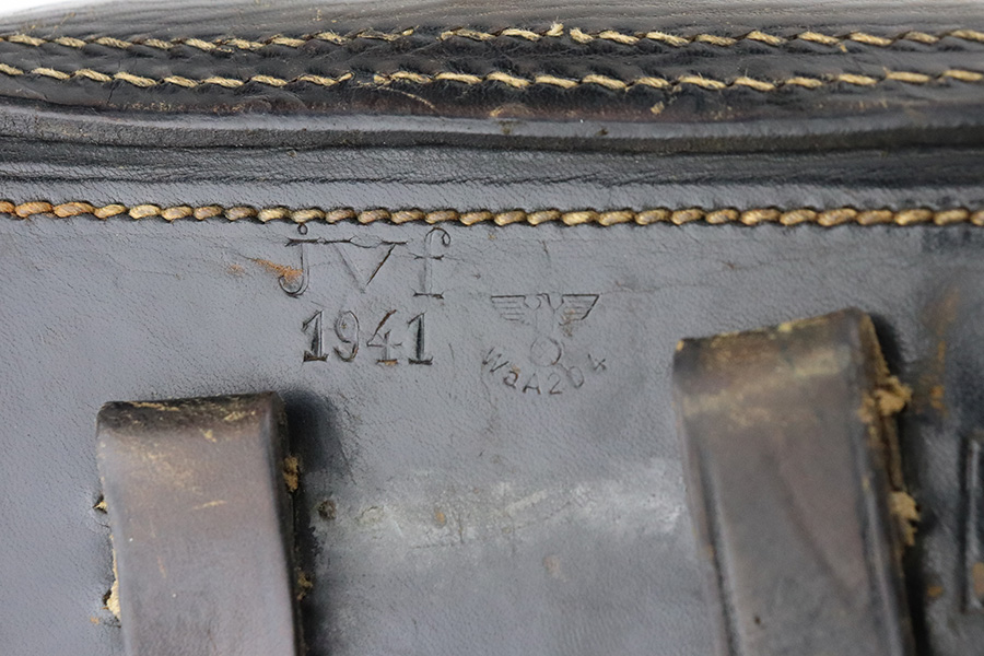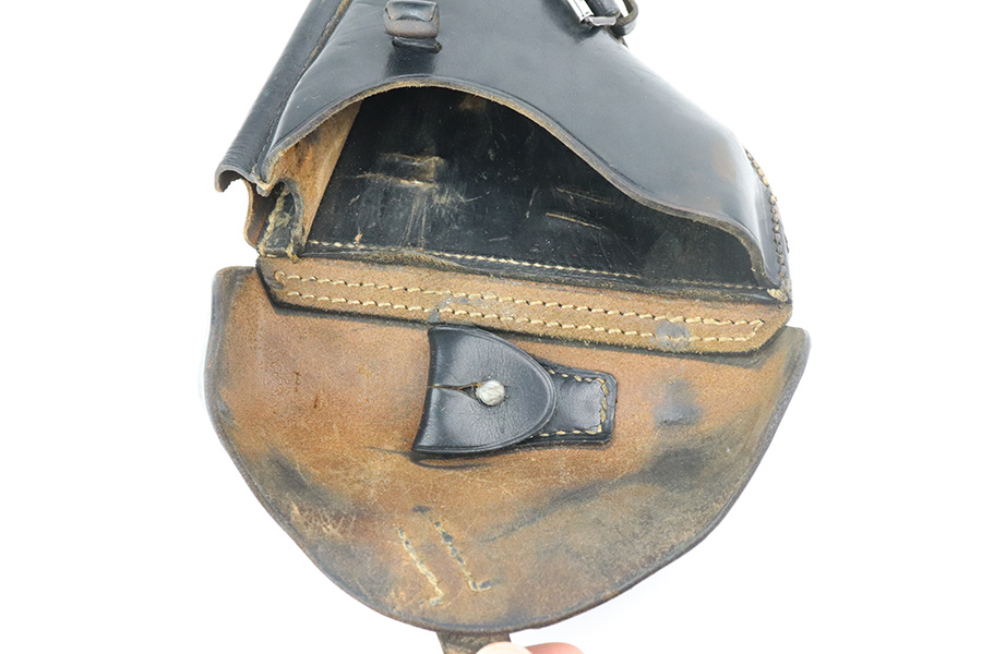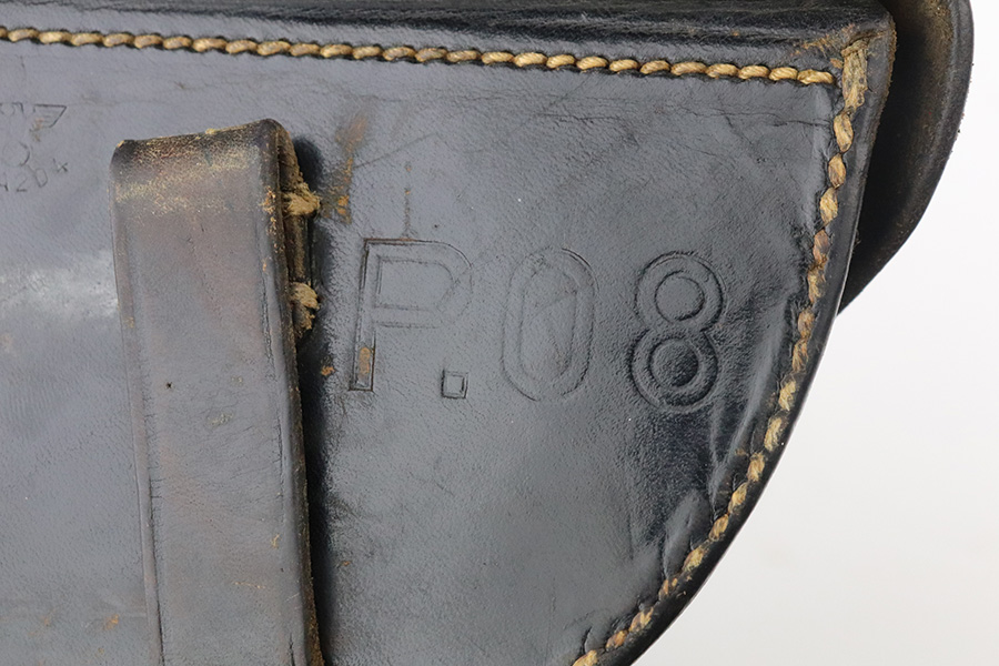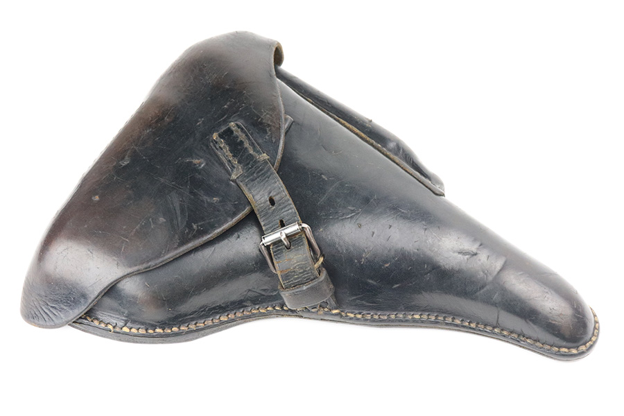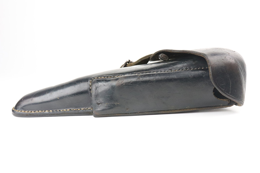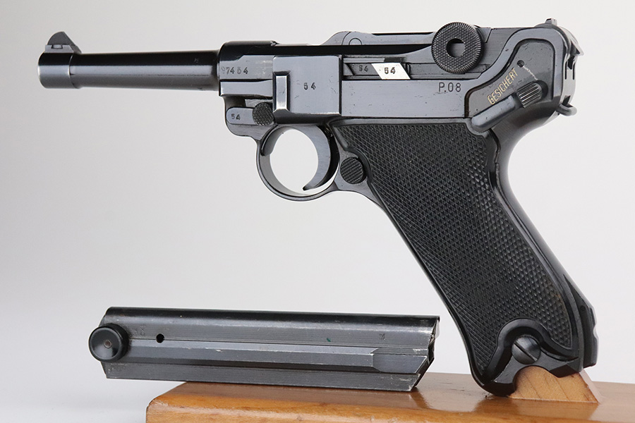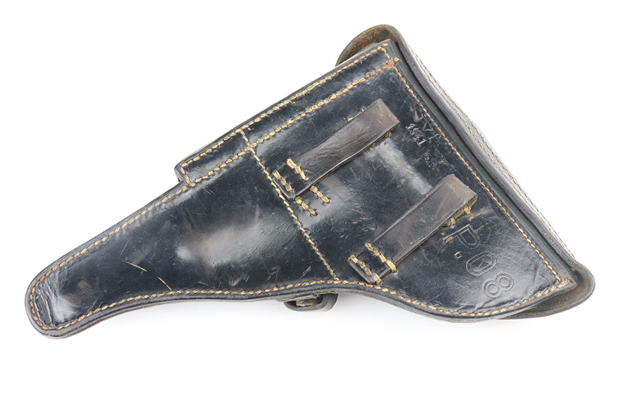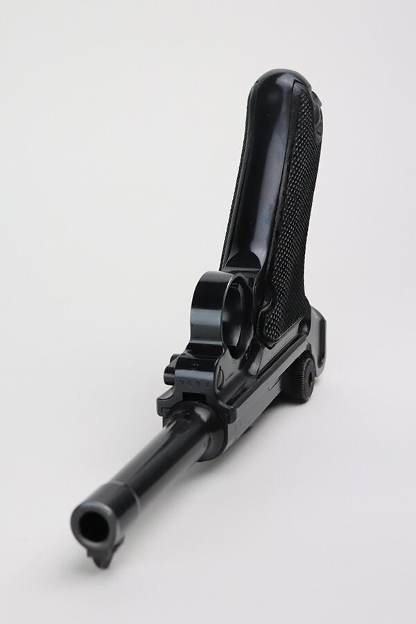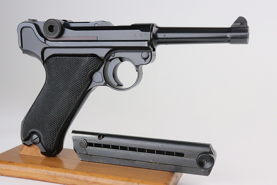 8/2/21 – This is a stunning example of a “Black Widow” Mauser Luger issued to the Nazi military in 1941. It is all matching and has the proper “Eagle 135” military proofs. The rig comes with a nice 1941-dated waffen-proofed holster, an un-marked Luger tool, and two proper black widow magazines. The gun is in near-mint condition, retaining more than 98% of its original finish. There are just the faintest hints of wear on the side plate, the side rails, and around the muzzle. A few very tiny handling marks on the straps. Comes with excellent correct black widow grips. The bore is excellent – shiny with strong rifling and minor frosting in the grooves. Even though not photographed, it does include a Luger tool and spare magazine.