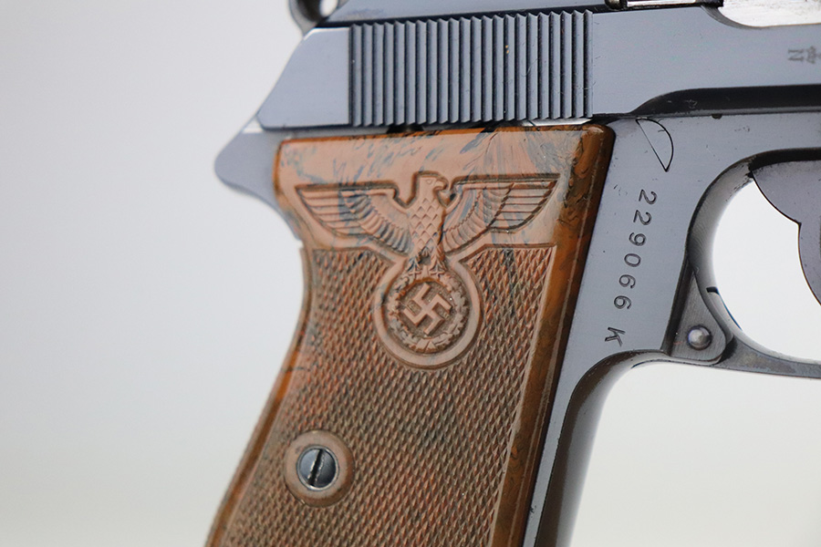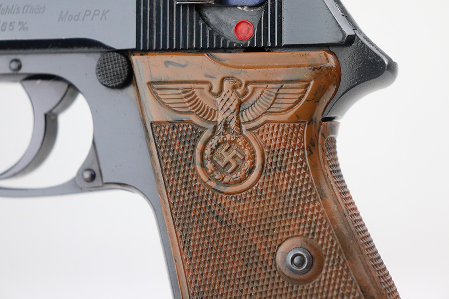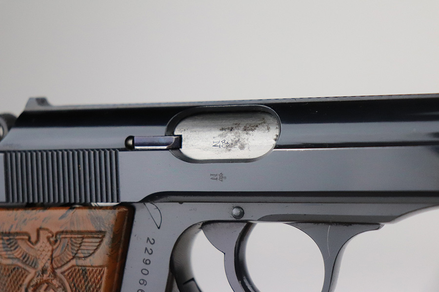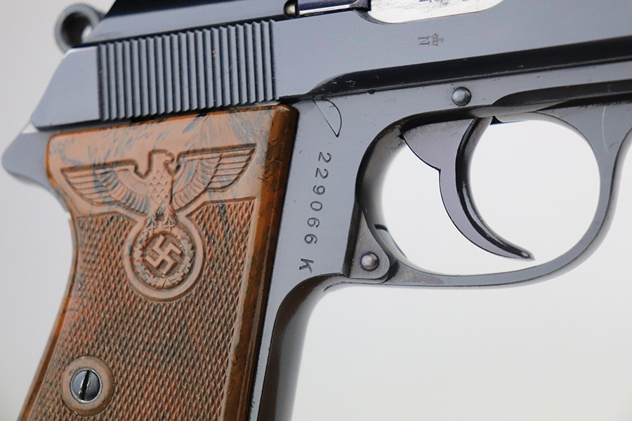 The Walther PPK with Party Leader Grips was the “Honor Weapon of the Political Leaders”. The Hoheitsabzeichen or High Insignia is the Eagle over Swastika found on either side of the grips where the Walther banner is normally located. The person entitled to wear the honor weapons that were awarded them by the Fuhrer were the Political Leaders of the national, regional and district territories, as well as leaders of local and support units. The persons who wore the honor weapon had their authorizations listed in the district personnel offices, and had to have in their possession a weapons permit issued by the police, which was obtained through official channels. These rare pistols were estimated to number around 3,500, and are widely faked, but this one is guaranteed original.