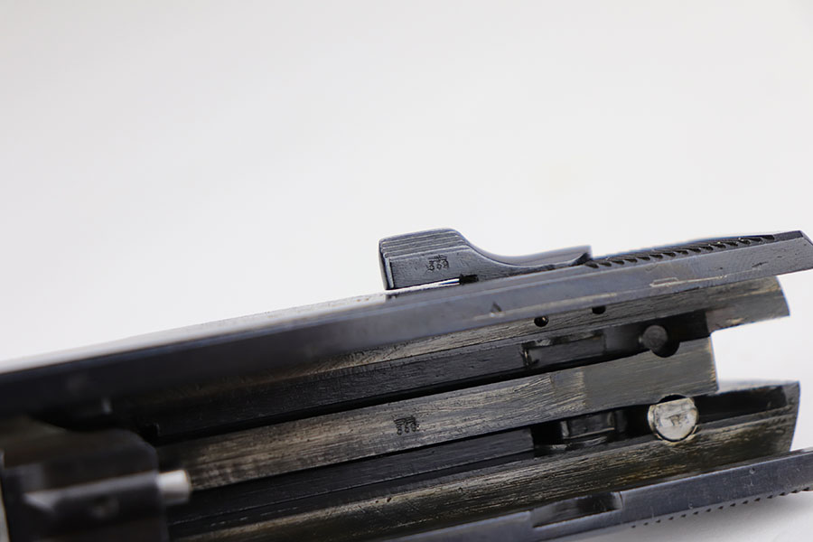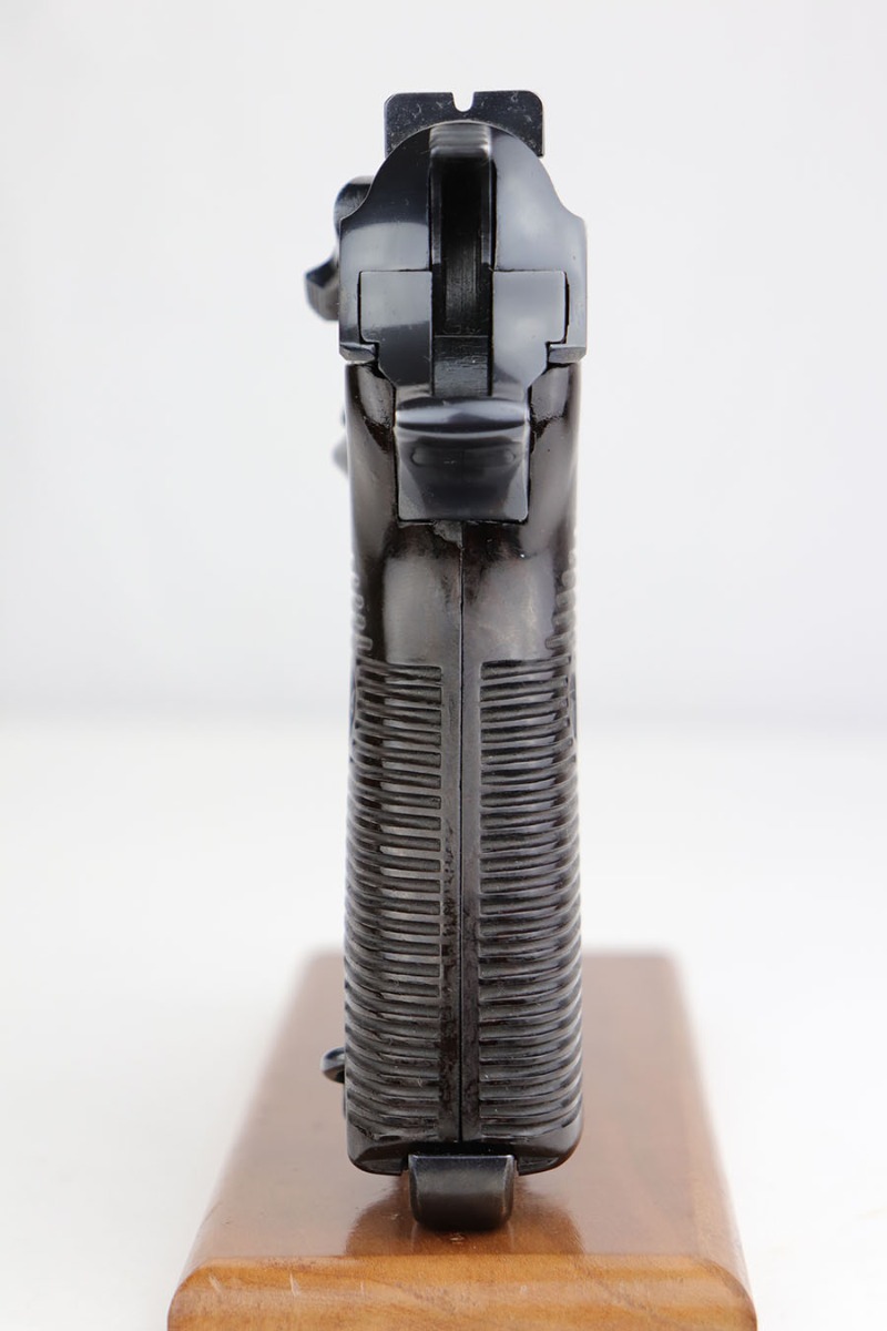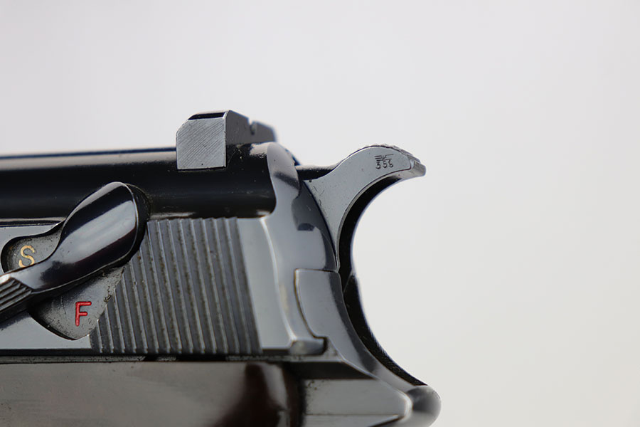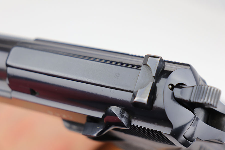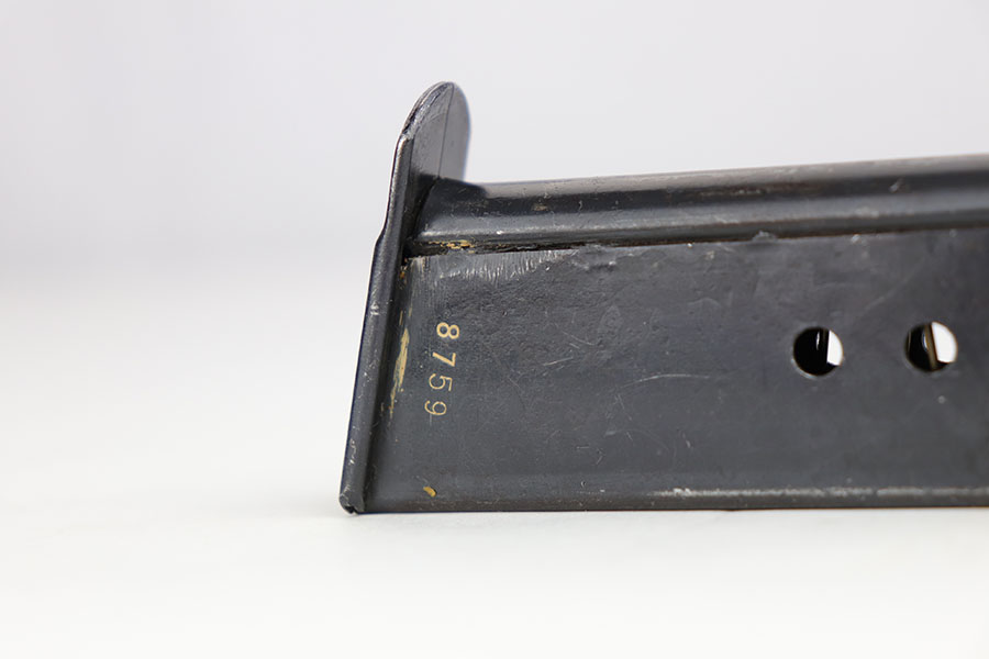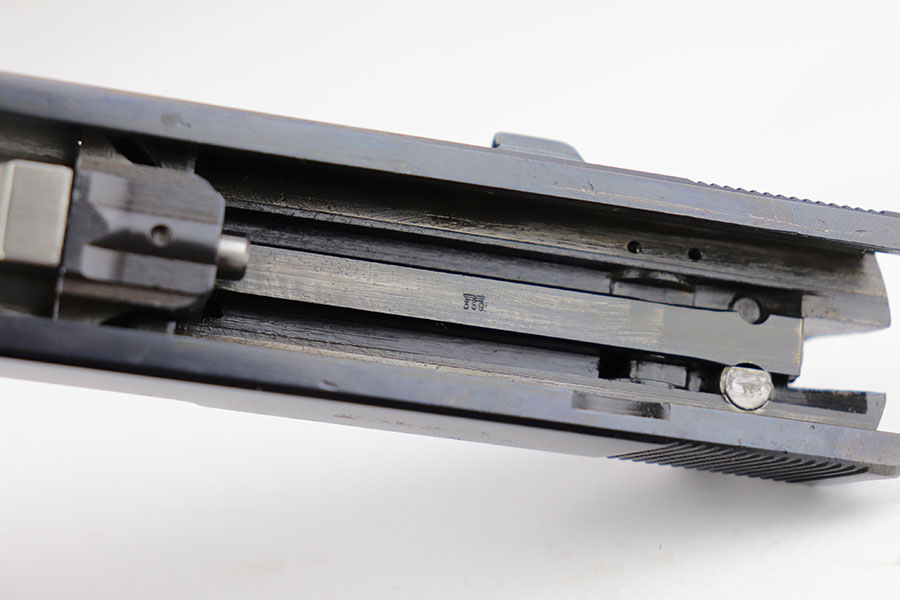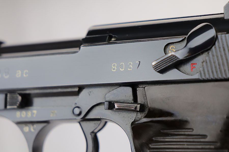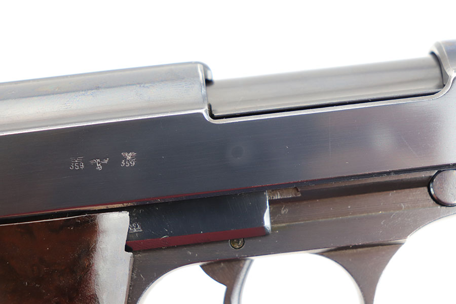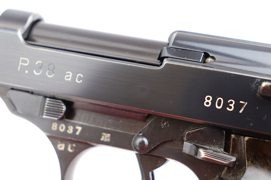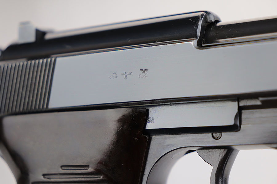 3/26/20 – This is one of the rarest of the Nazi P.38 variations, referred to as an ‘ac No Date’. Made in early 1940, there were only about 2500 were produced. This gun is all matching with the exception of the magazine. The magazine, however, is in the same date range as it is #8759. The grips are waffen proofed and numbered to the gun as well. Most importantly, is this gun “for real”? First of all, collectors never find these early guns in this condition as they were issued in 1940 and most went to the Russian front. This gun is correct in every way, and we cannot find any of the typical “tells” that you would expect on a refinished gun. The trigger spring and other springs are in the white. There are very faint “drip marks” on both sides of the slide. Also a small “thumb print” on the back of the barrel. We have included photos of these areas as they are good indicators of original finish on early Walthers. Most importantly, the third proof on the left of the slide is “raised” and over the finish. So, if this gun was restored it was done by a true artist. Honestly, we are about 50/50 on this finish, so please study the photos and decide for yourself.